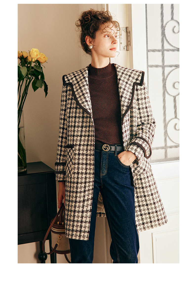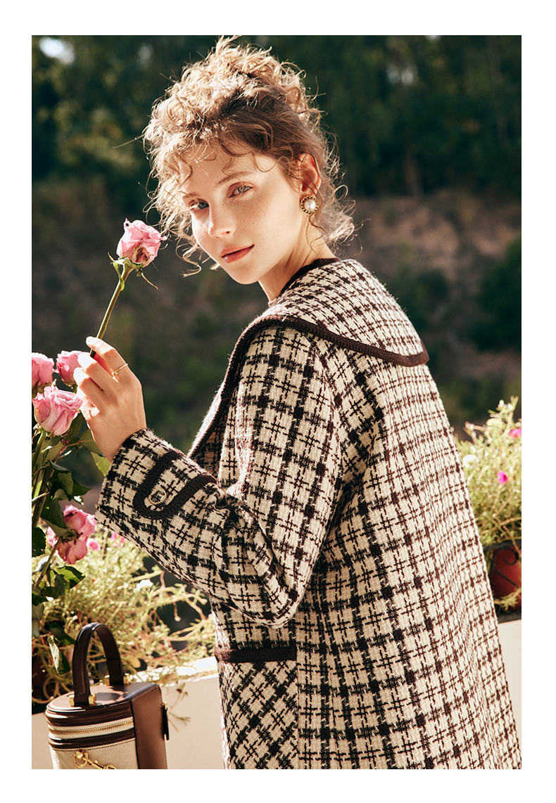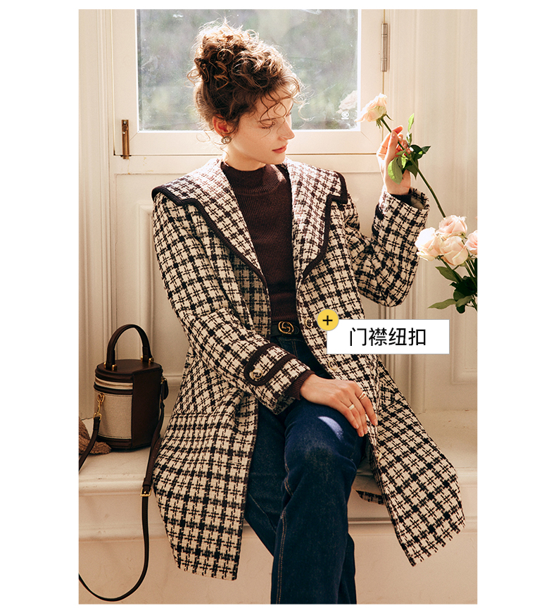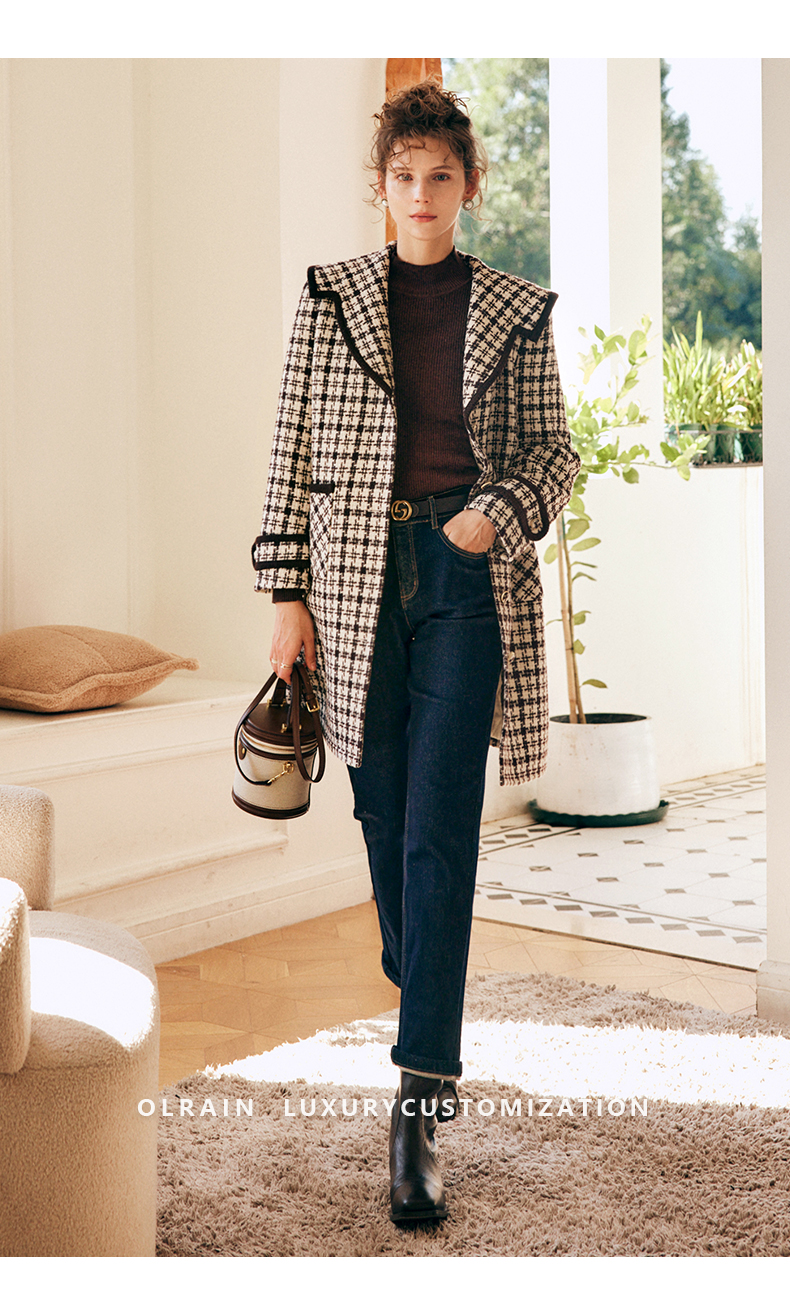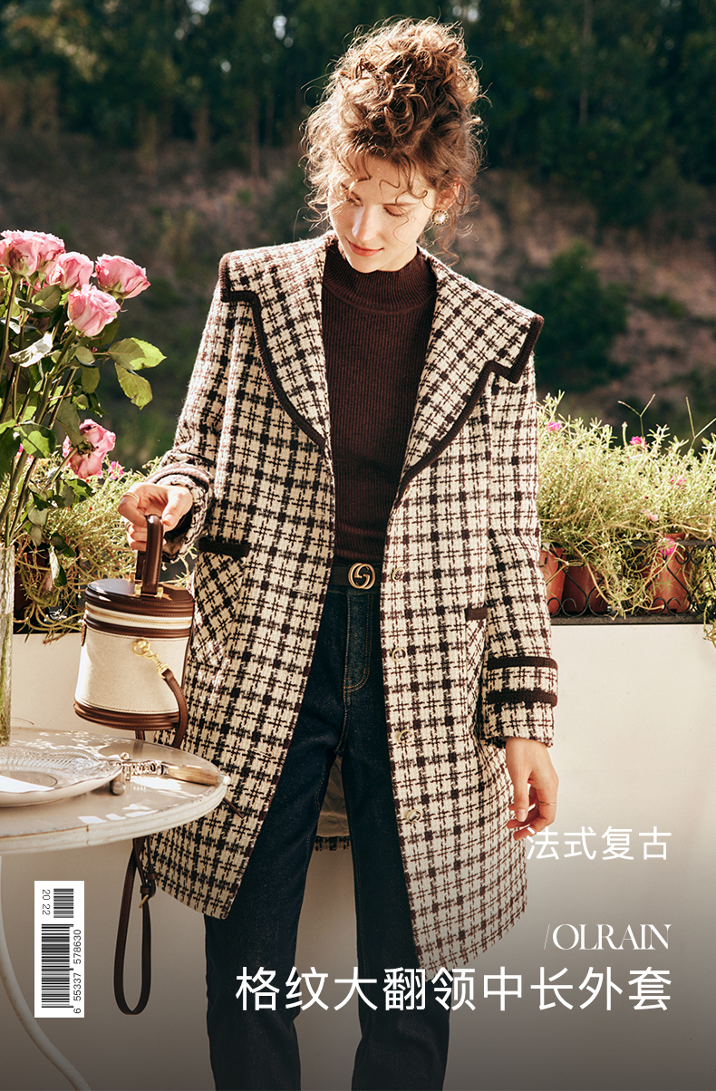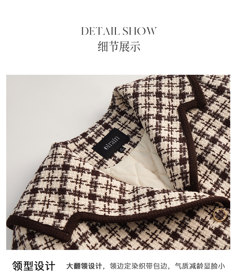 OLrain欧芮儿法式格纹外套女秋冬2022新款复古撞色粗花呢中长大衣