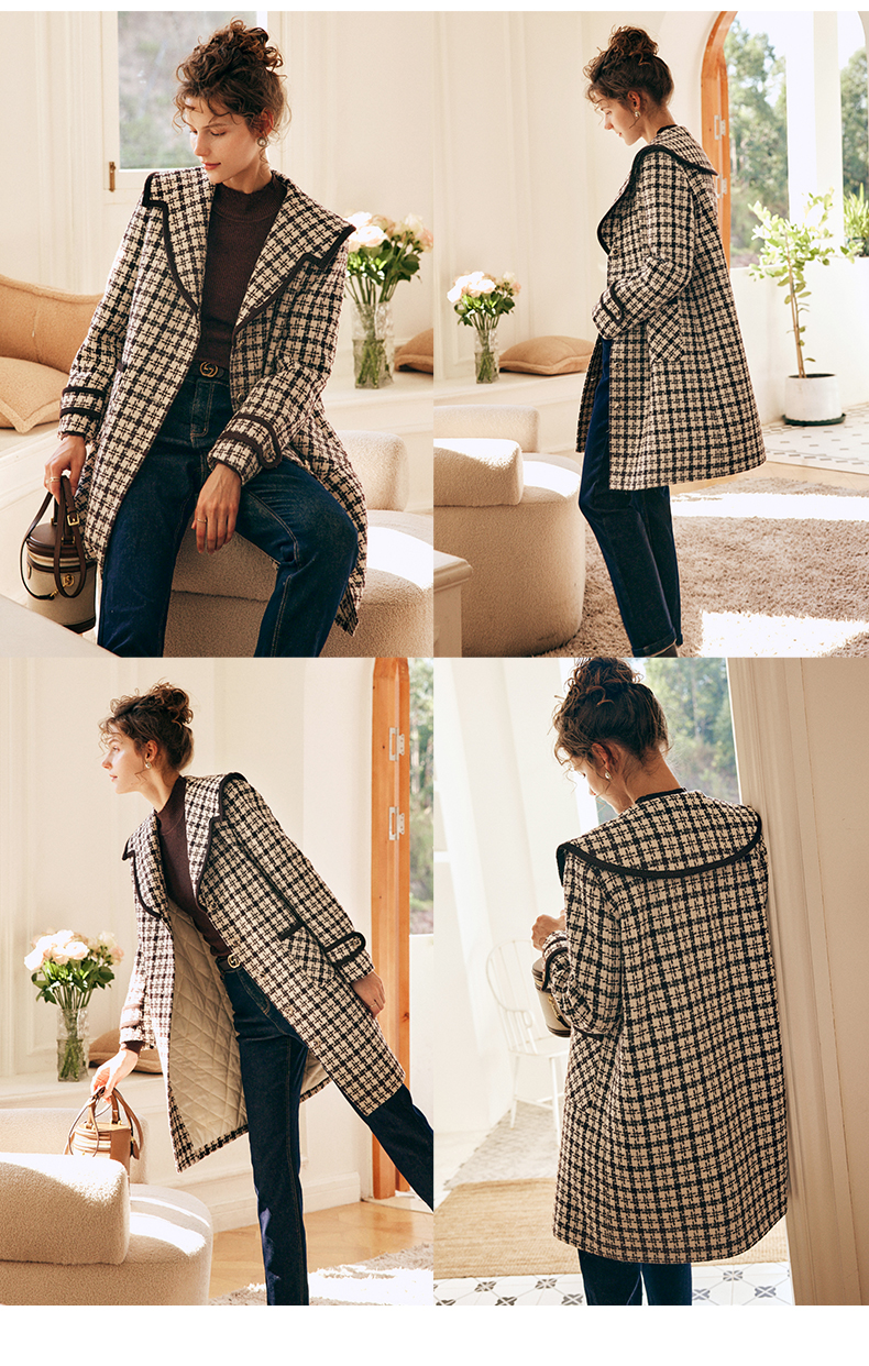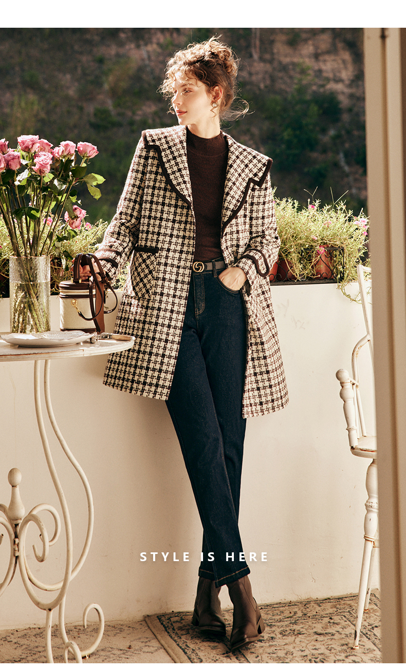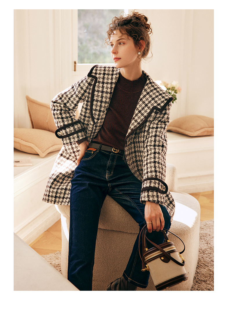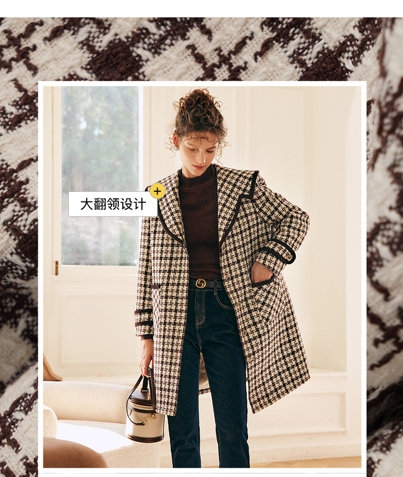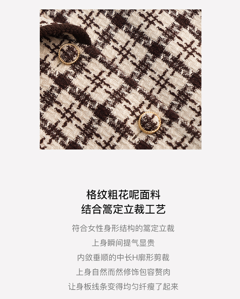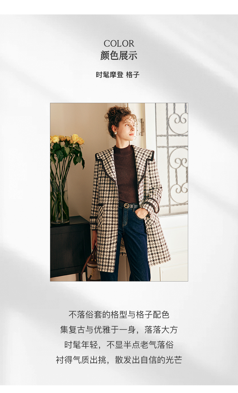 OLrain欧芮儿法式格纹外套女秋冬2022新款复古撞色粗花呢中长大衣
