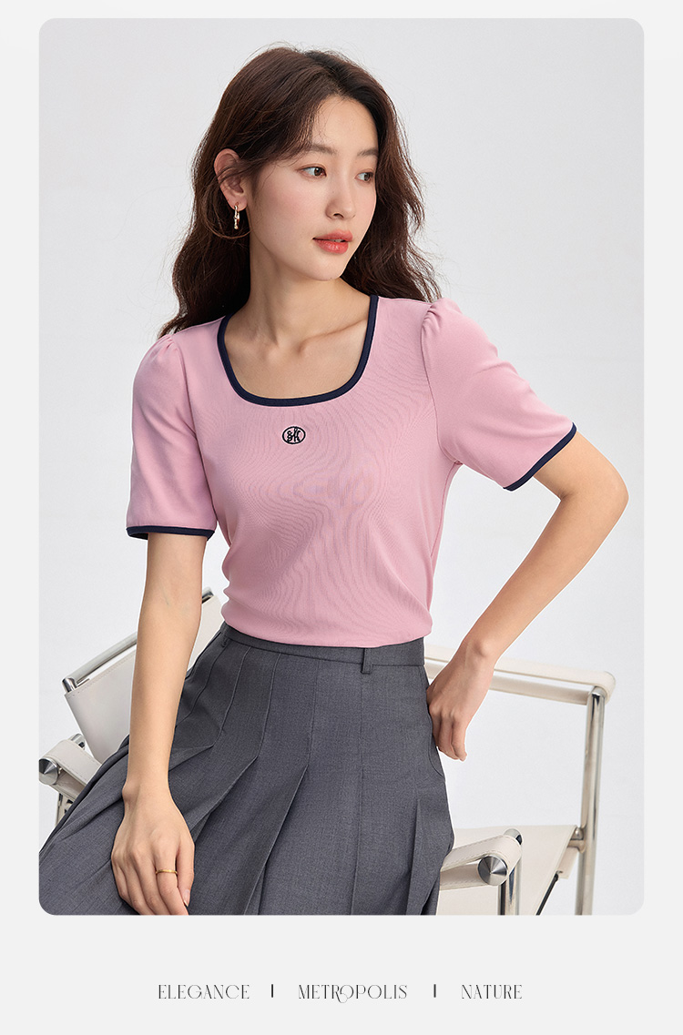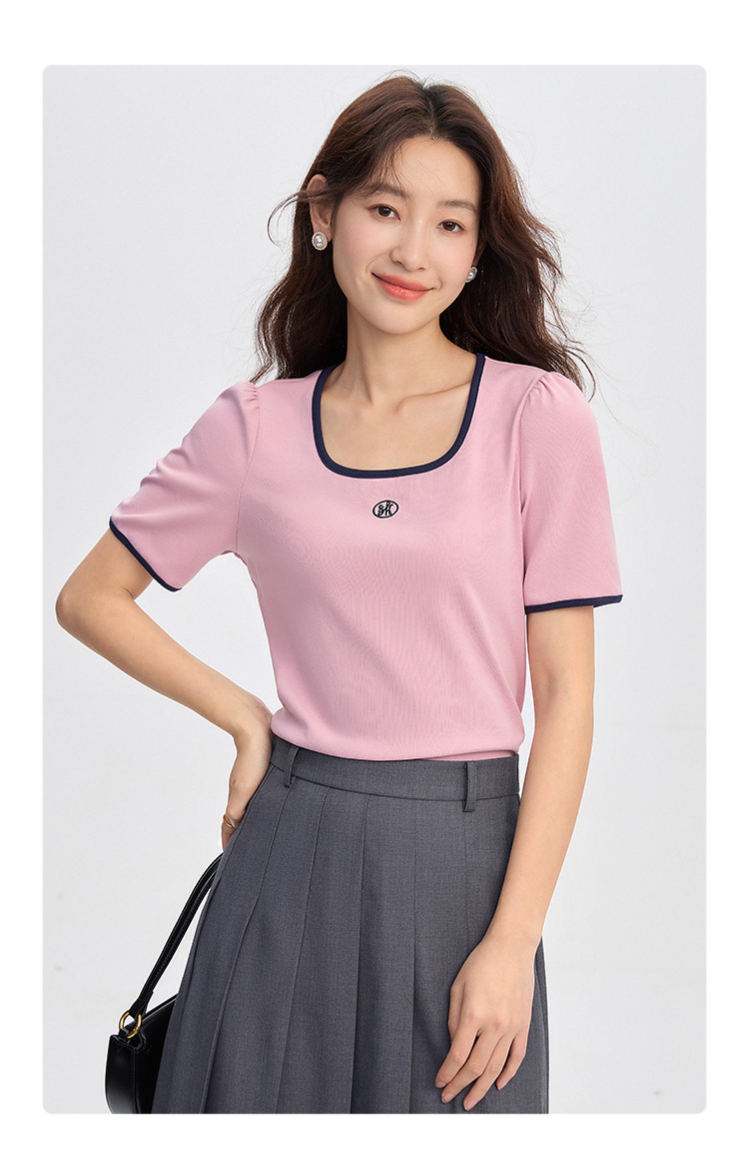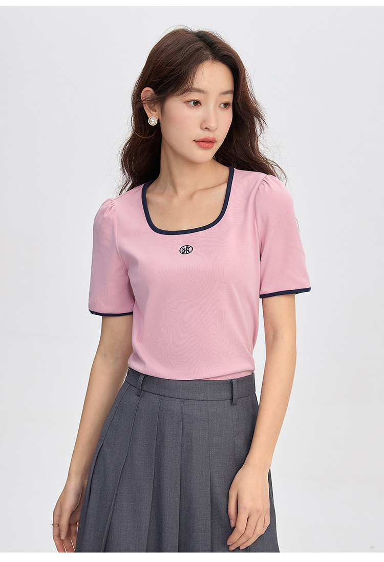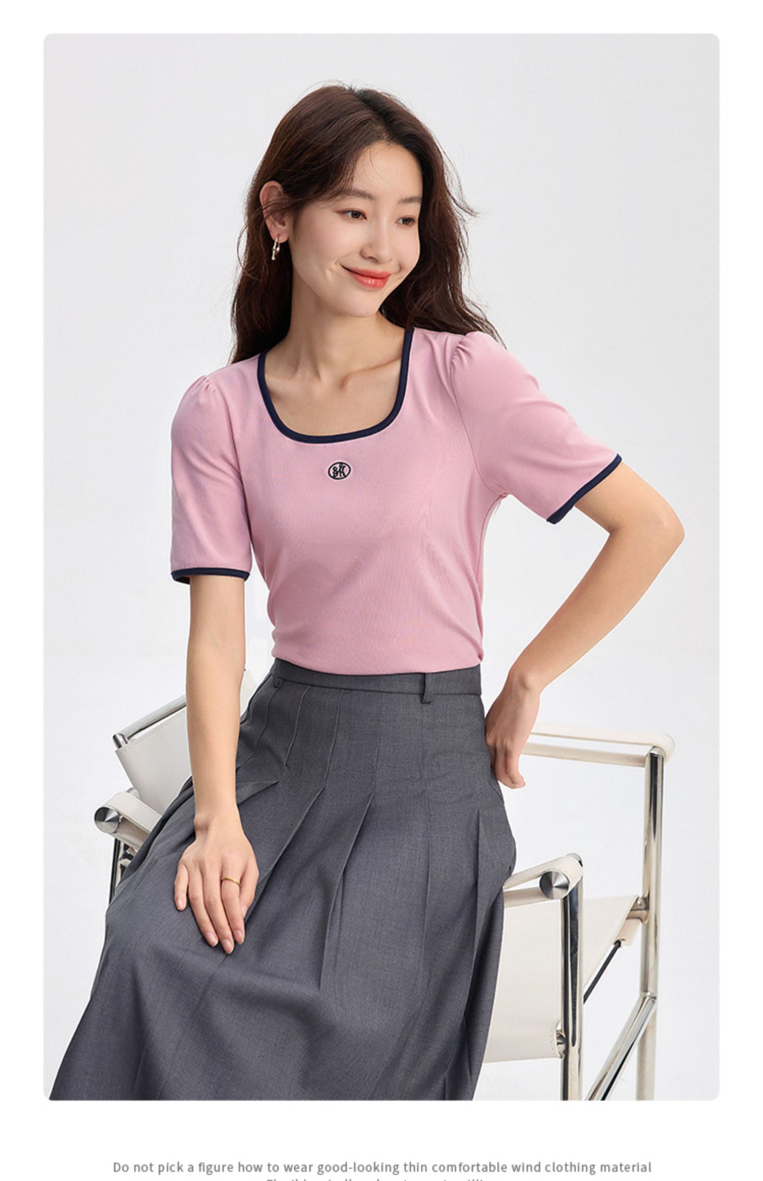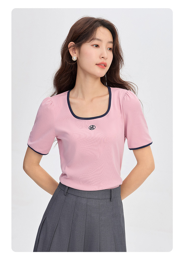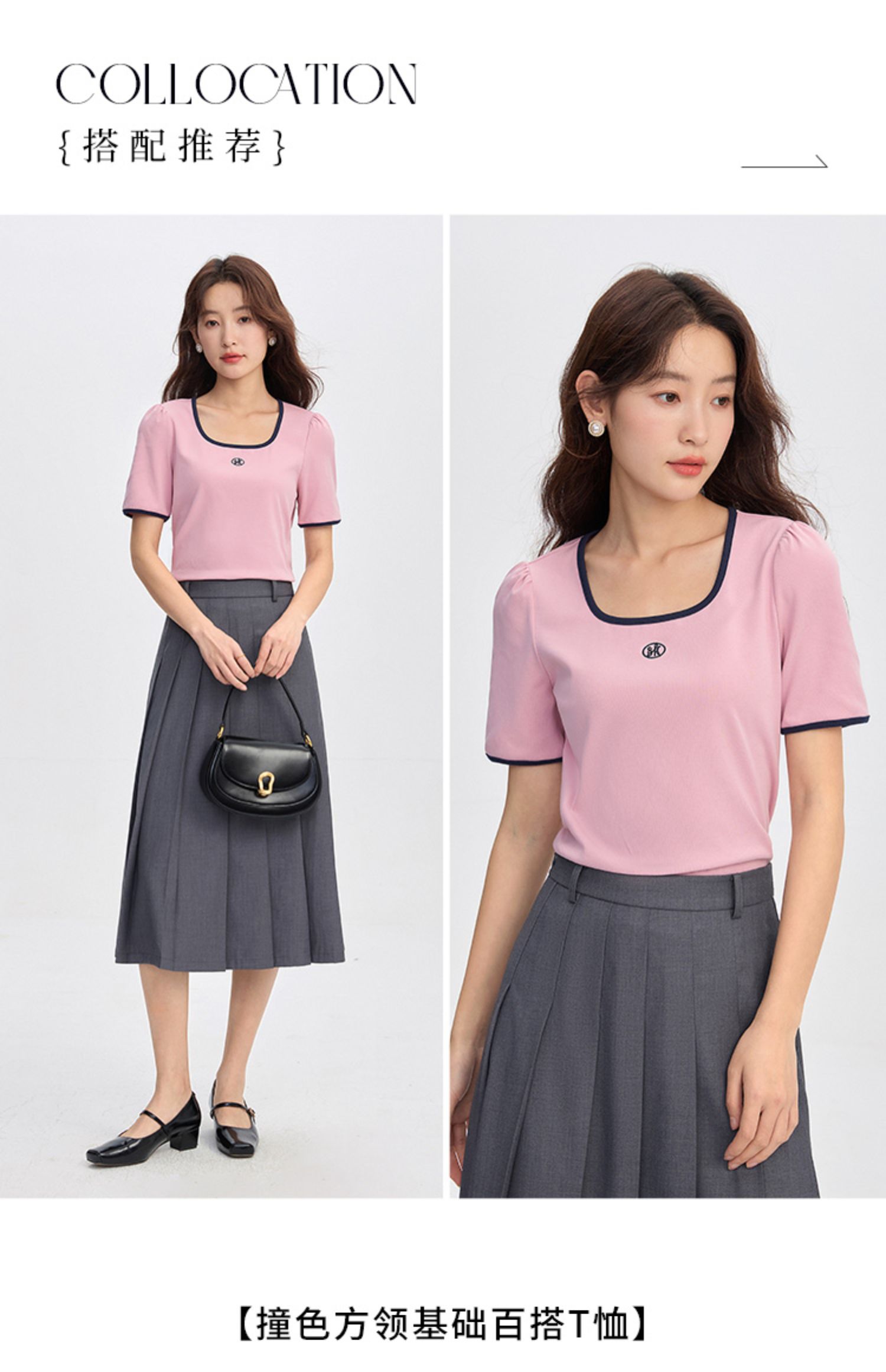 【专属特价】熙世界撞色方领T恤女短袖修身显瘦百搭棉质法式上衣2025夏新款