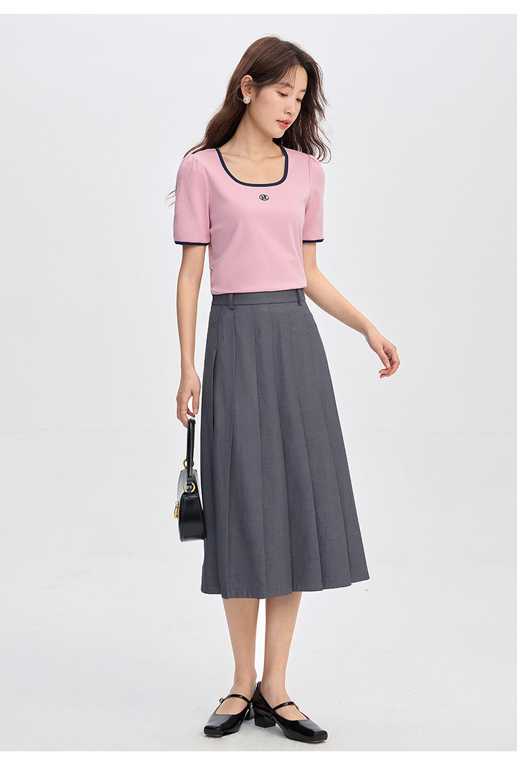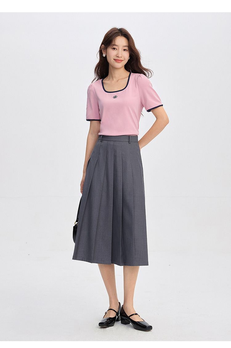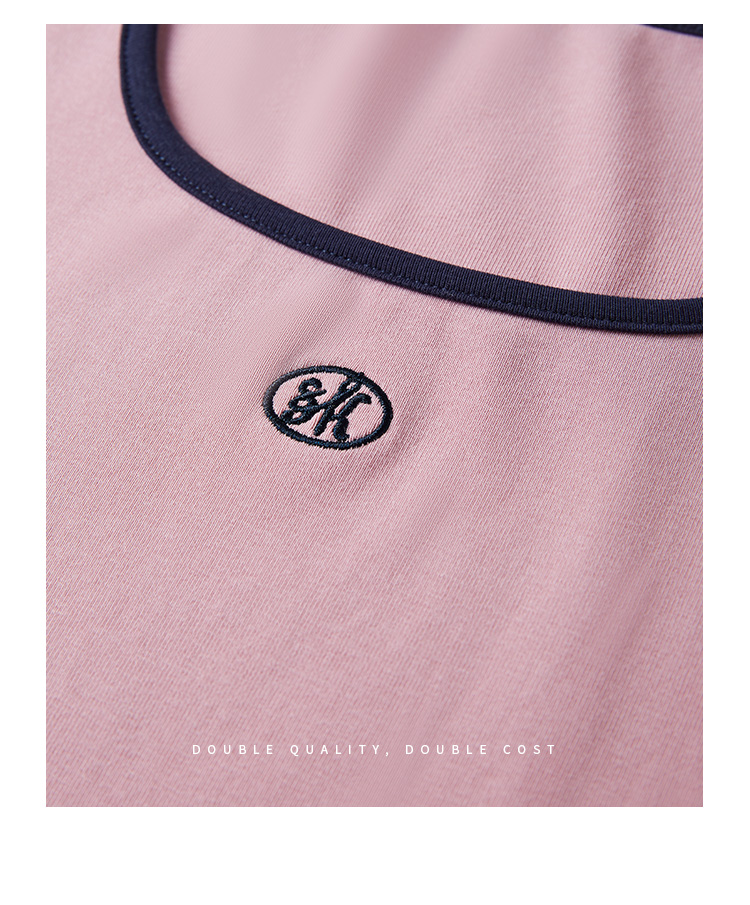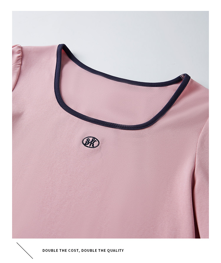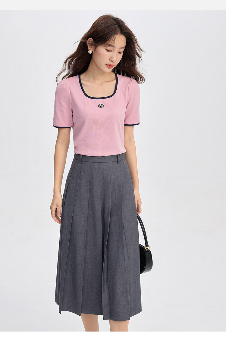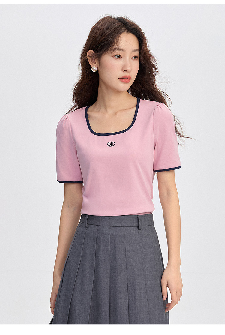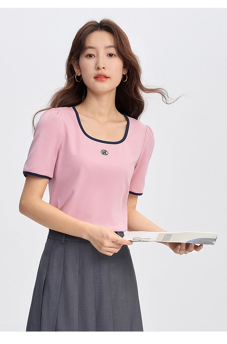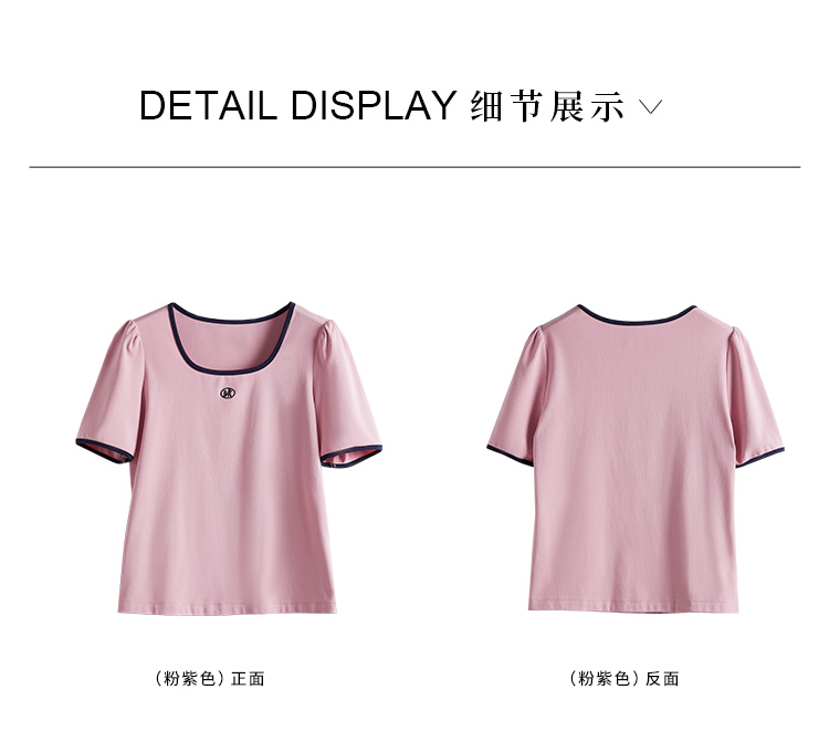 【专属特价】熙世界撞色方领T恤女短袖修身显瘦百搭棉质法式上衣2025夏新款