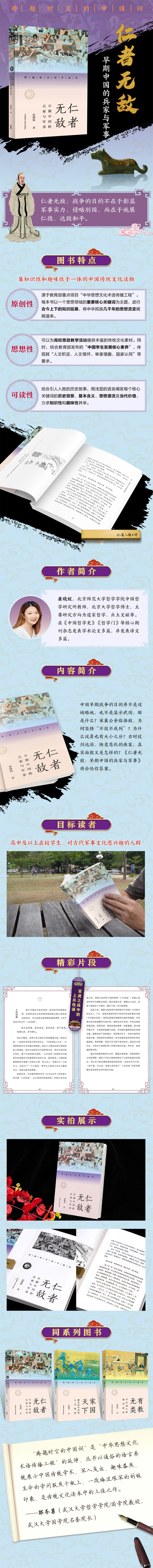 《仁者无敌:早期中国的兵家与军事》探讨了古代中国的战争观,突出了古代中国热爱和平、以战止战的战争观念。进而介绍了古代中国兵家思想的基本内容、代表人物及其主要思想、代表兵书、军事谋略等,以及具有代表性的兵法与阵法、兵阴阳、古军礼等内容,乃至动物在古代战争中的角色。最后,介绍了古代中国的侠义精神与侠客、勇德与勇士。通过这些内容,力图传达出古代中国崇尚和平的人文价值理念,同时也希冀带领读者领略源远流长、丰富多彩的早期中国的军事与兵家思想。