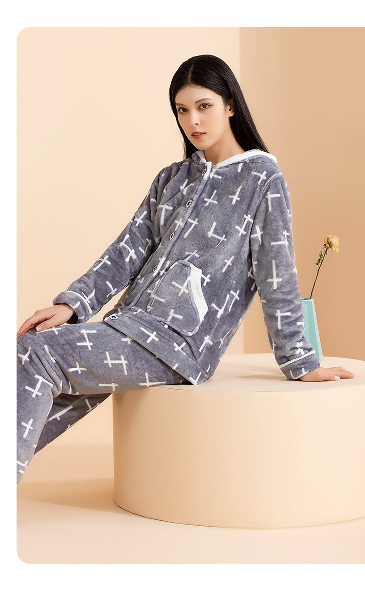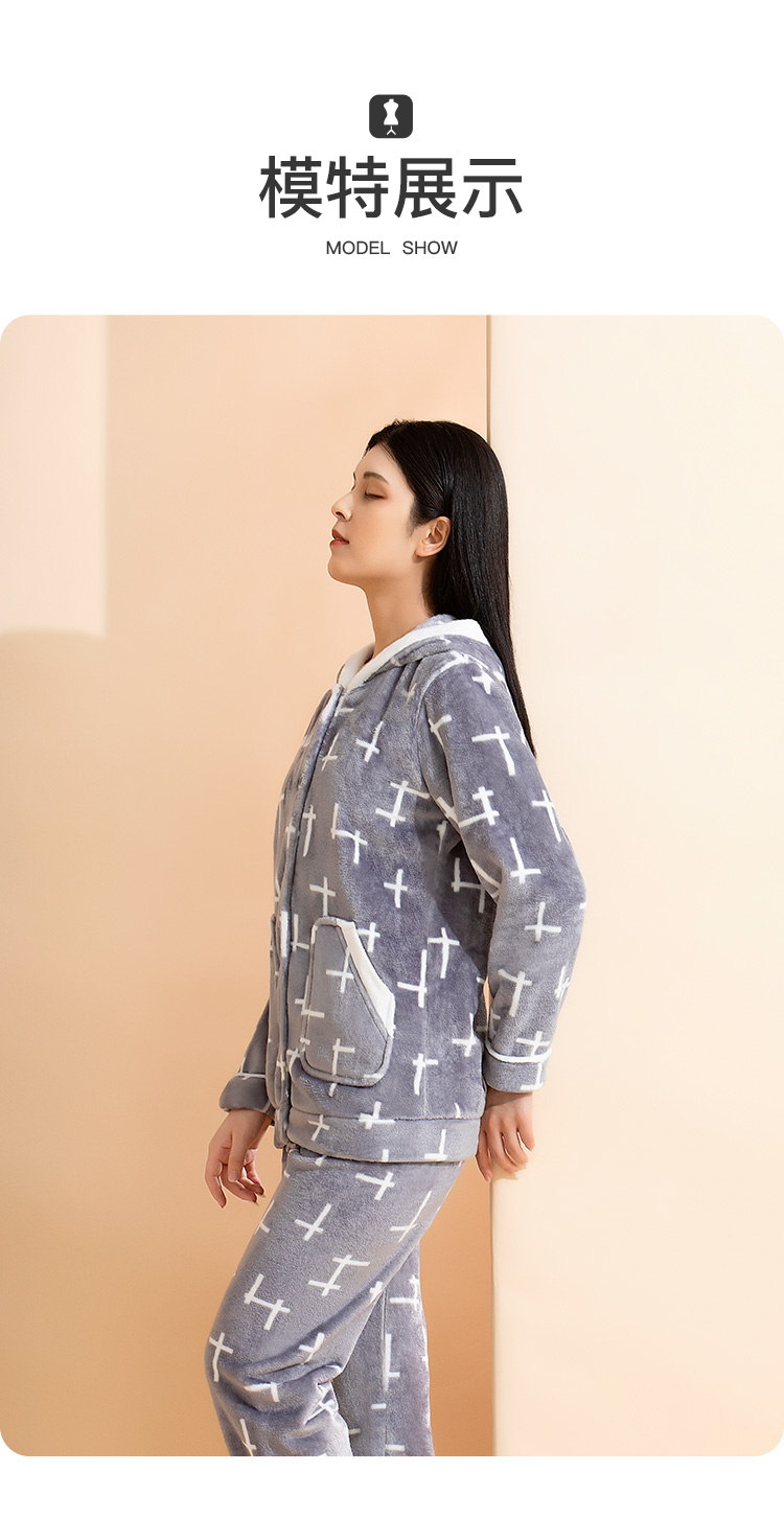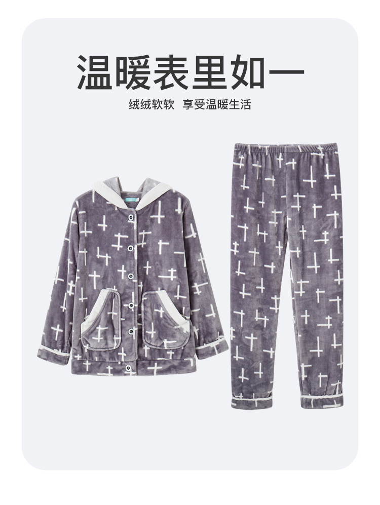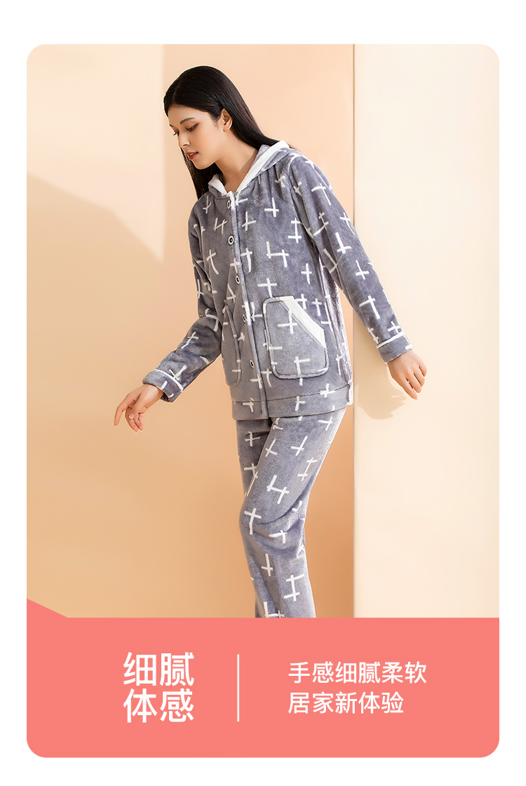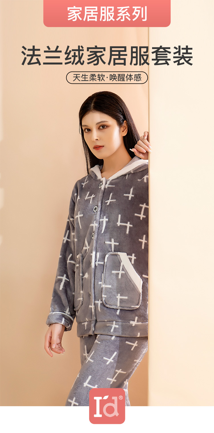 爱帝女式几何印花珊瑚绒长袖家居服套装