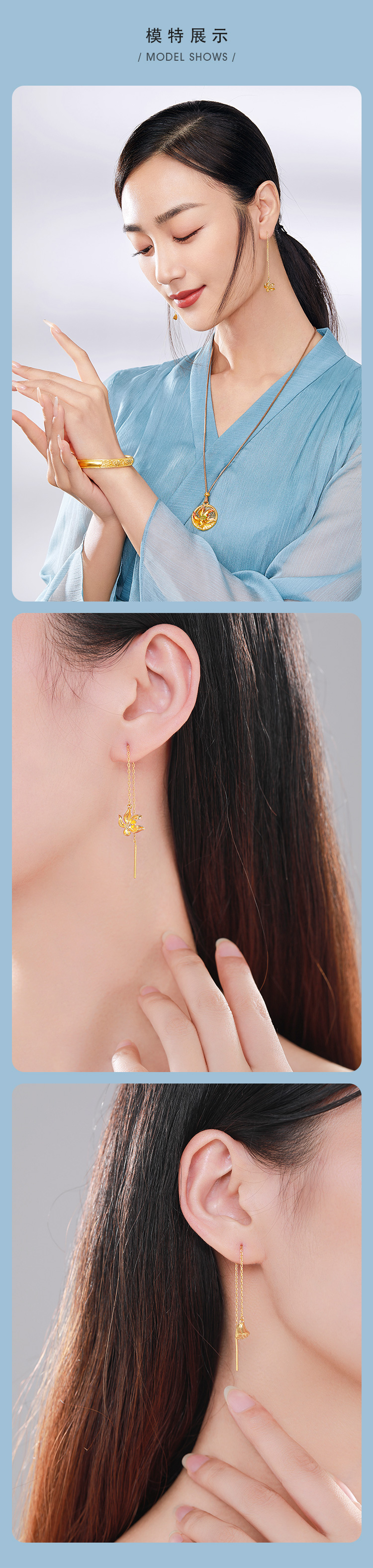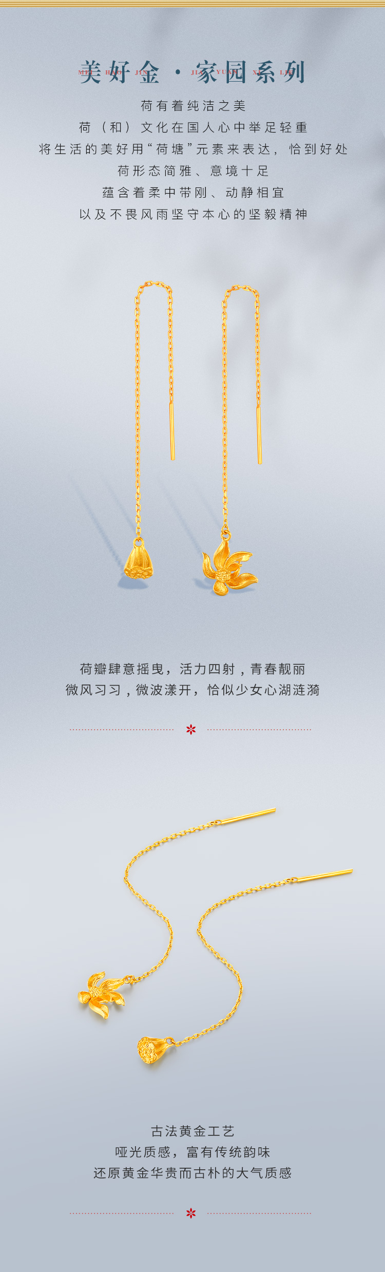 「美好金家园-涟漪」足金黄金耳线 古法工艺长款莲花莲蓬耳饰