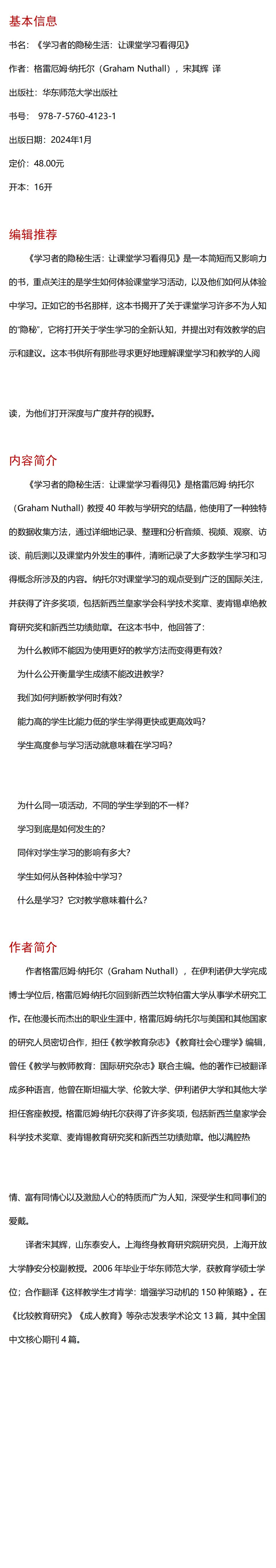 《学习者的隐秘生活:让课堂学习看得见》是格雷厄姆·纳托尔(Graham Nuthall)教授40年教与学研究的结晶,他使用了一种独特的数据收集方法,通过详细地记录、整理和分析音频、视频、观察、访谈、前后测以及课堂内外发生的事件,清晰记录了大多数学生学习和习得概念所涉及的内容。纳托尔对课堂学习的观点受到广泛的国际关注,并获得了许多奖项,包括新西兰皇家学会科学技术奖章、麦肯锡卓越教育研究奖和新西兰功绩勋章。在这本书中,他回答了: