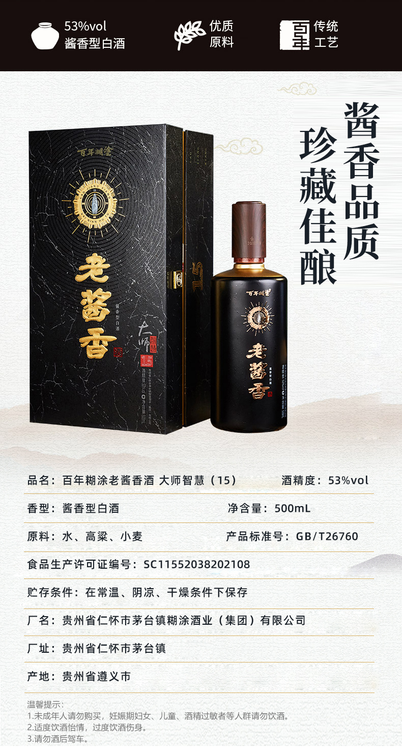 【官方自营正品】百年糊涂酱香型白酒 53度500ml 老酱香大师15礼盒