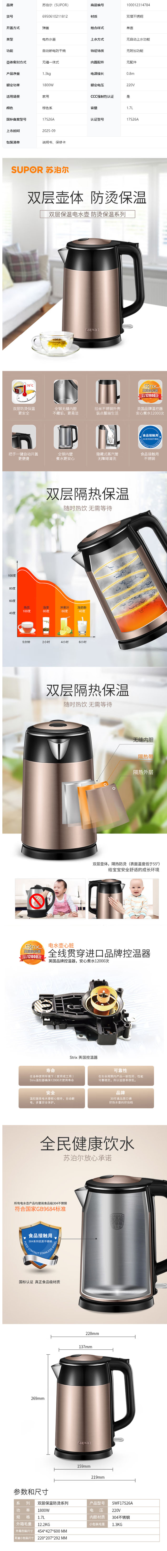 苏泊尔(SUPOR) 1.7L 电水壶 热水壶 全钢无缝 双层防烫 电热水壶 304不锈钢烧水壶 SWF17S26A