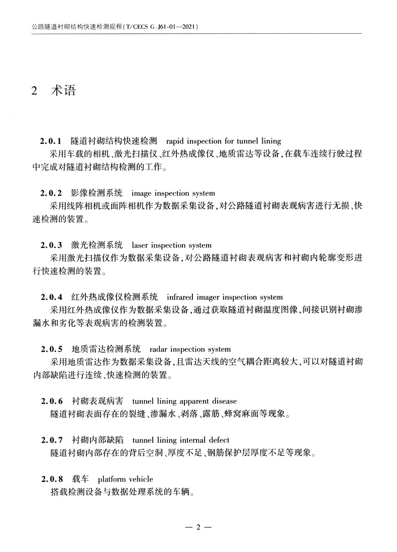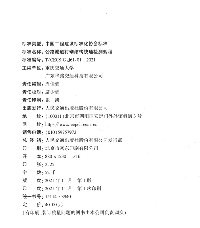 书名:公路隧道衬砌结构快速检测规程(T/CECS G:J61-01—2021)