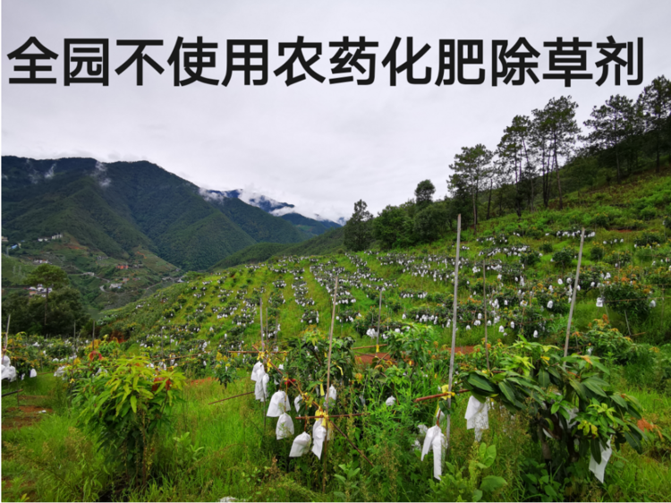 不用除草剂过高的杂草,进行人工割草,割下来的草堆回树头覆盖堆肥,腐烂以后就是植物生长需要的有机质。杂草可以调节土壤温度和湿度,并给益虫和有益菌提供更多的生存空间,是果园控制病虫害的一大助力!