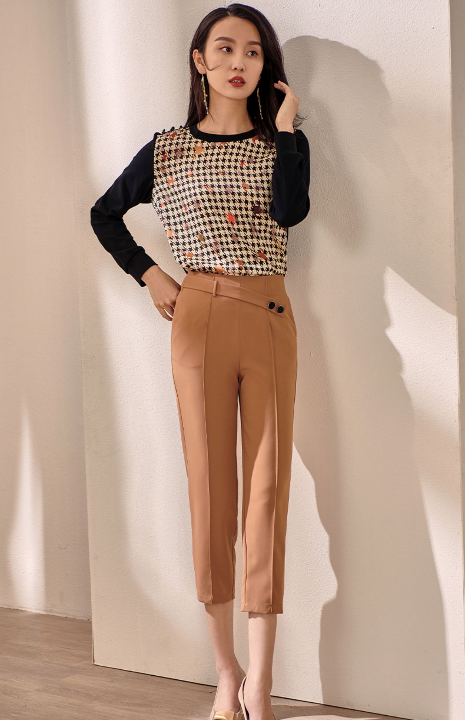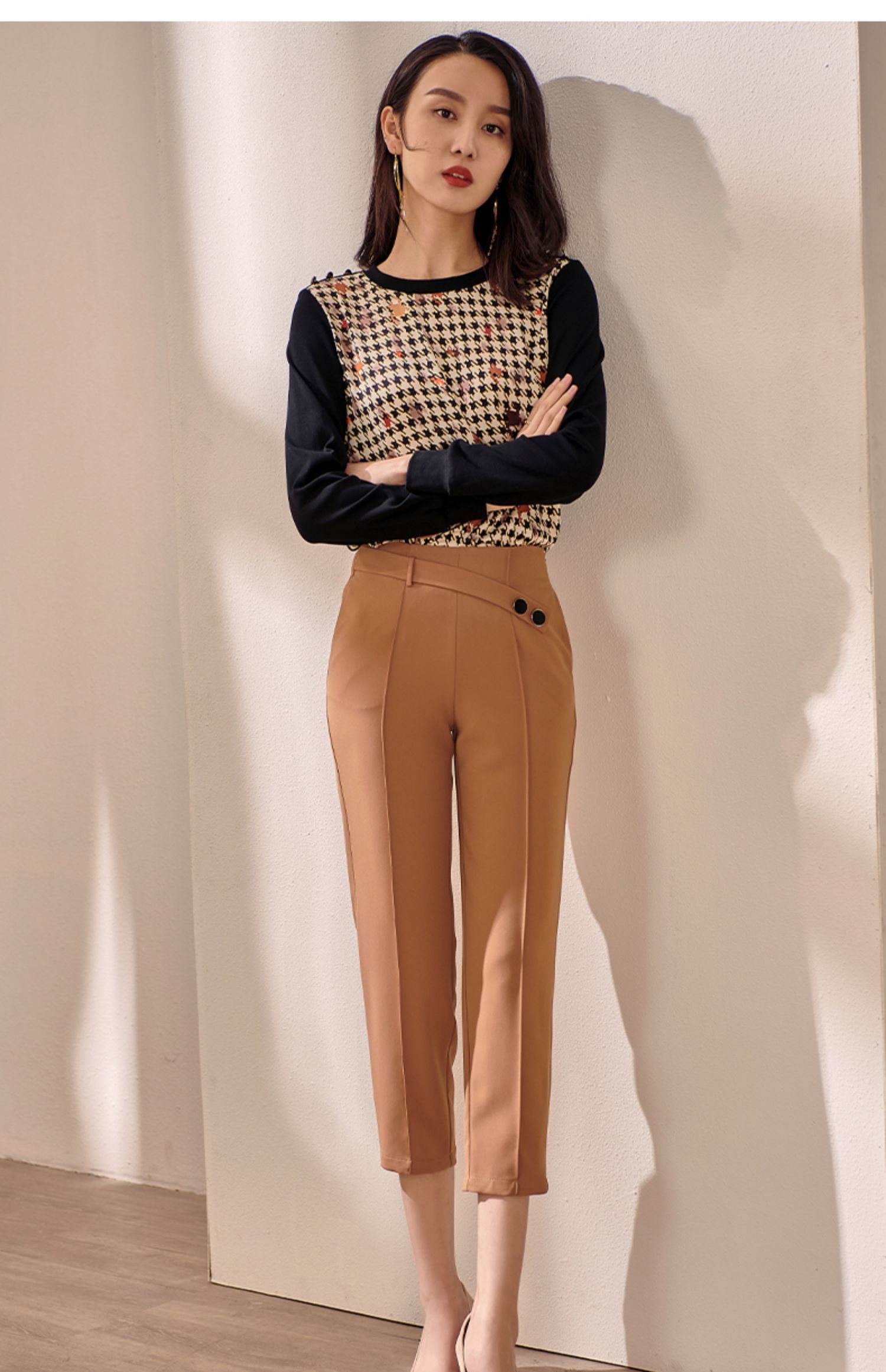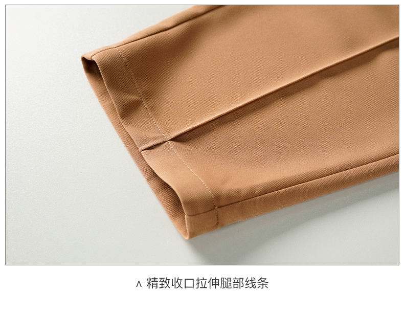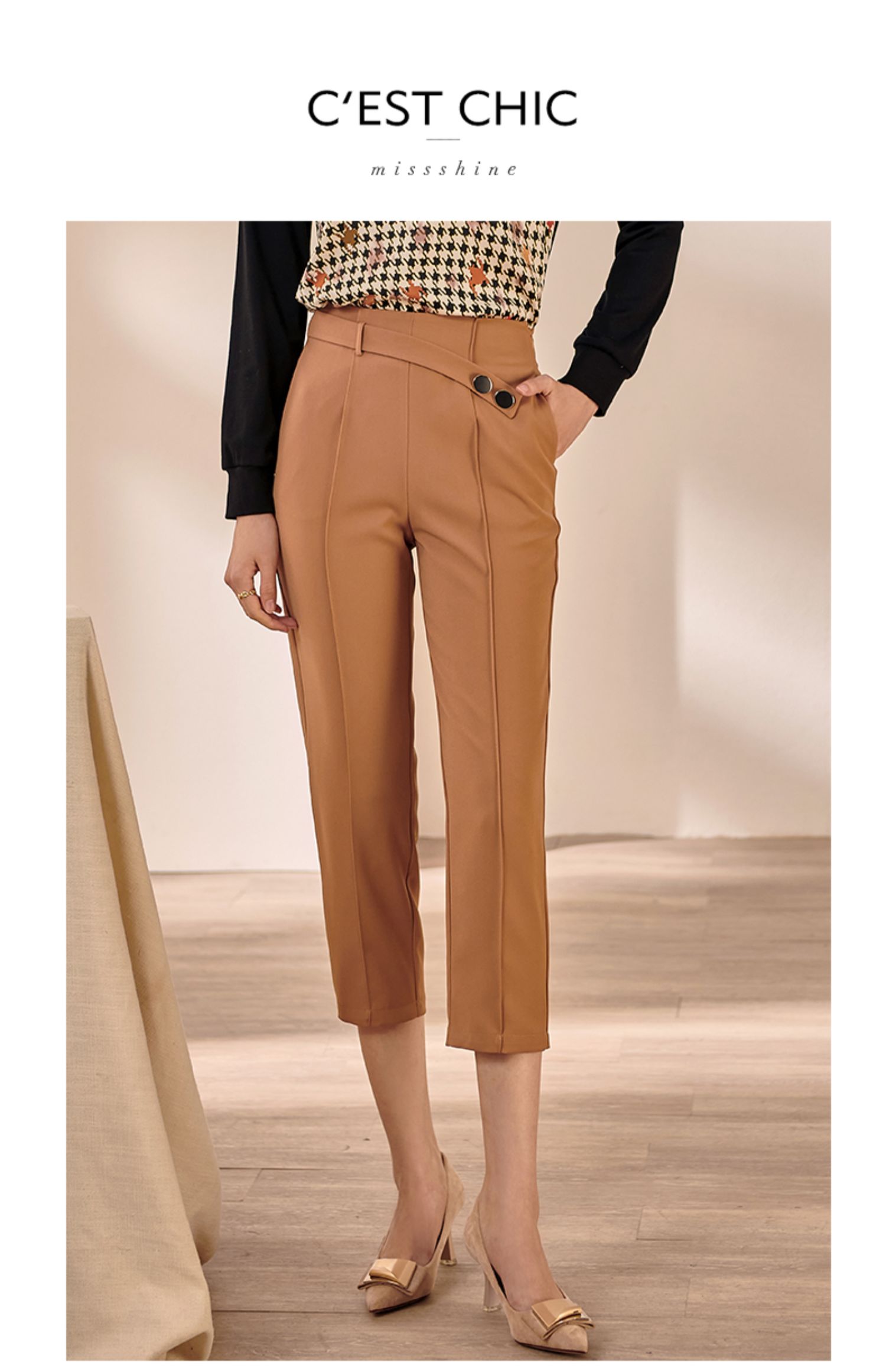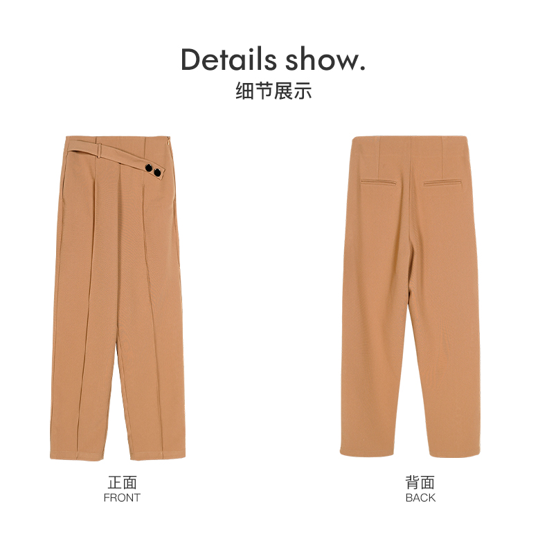 剩M 米思阳2025早秋新款驼色百搭休闲裤女修身显瘦斜扣九分小脚裤0064