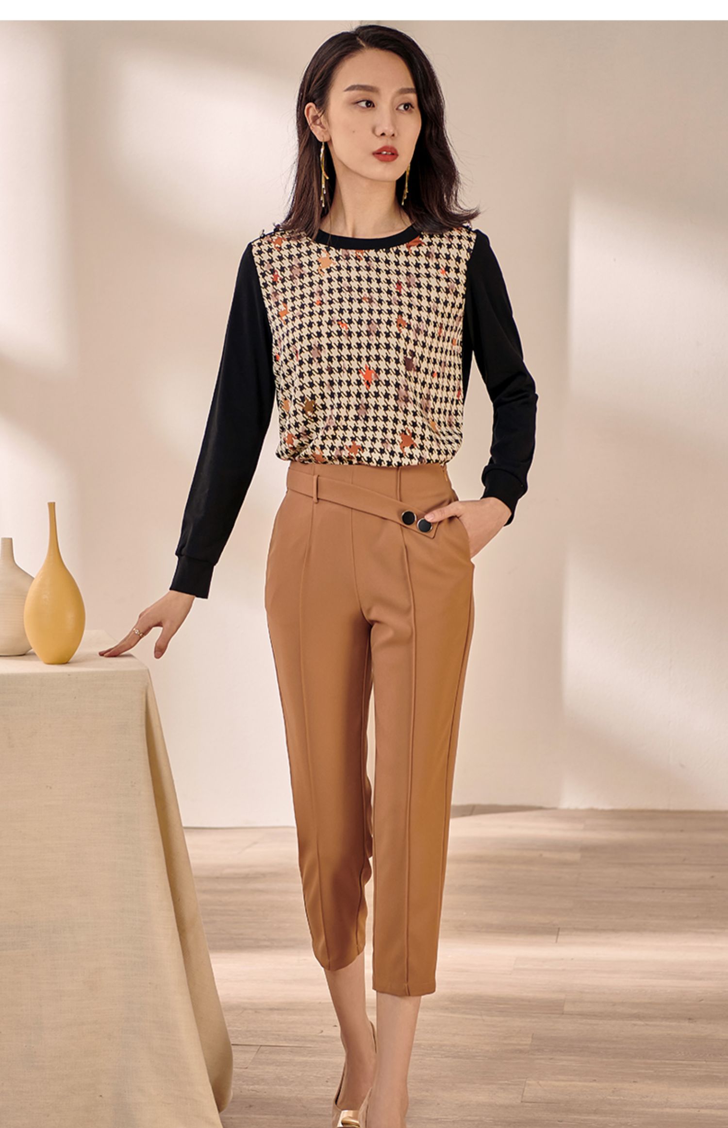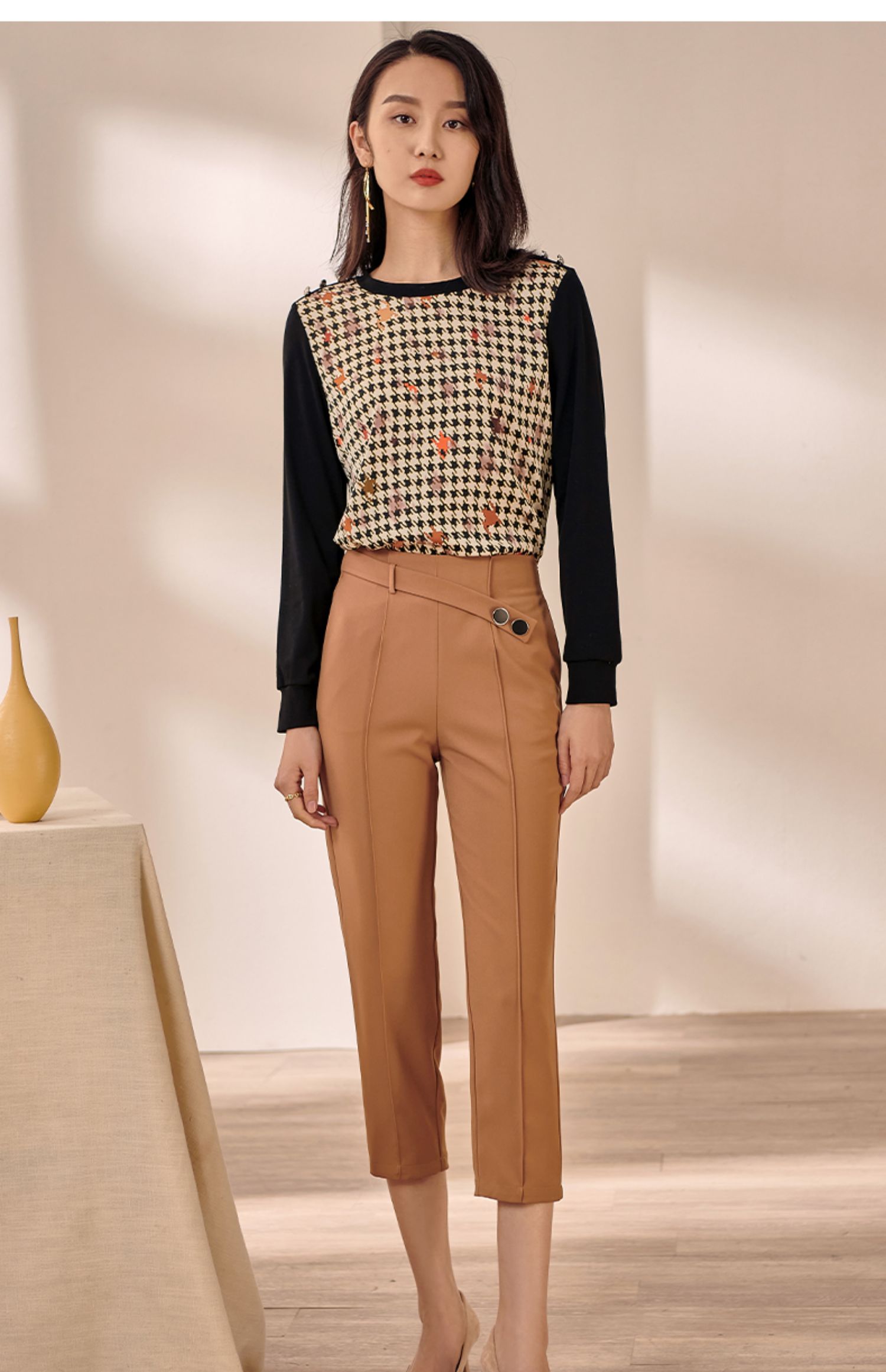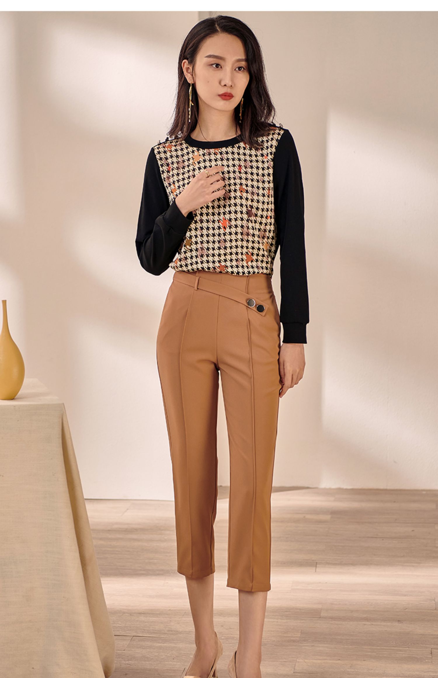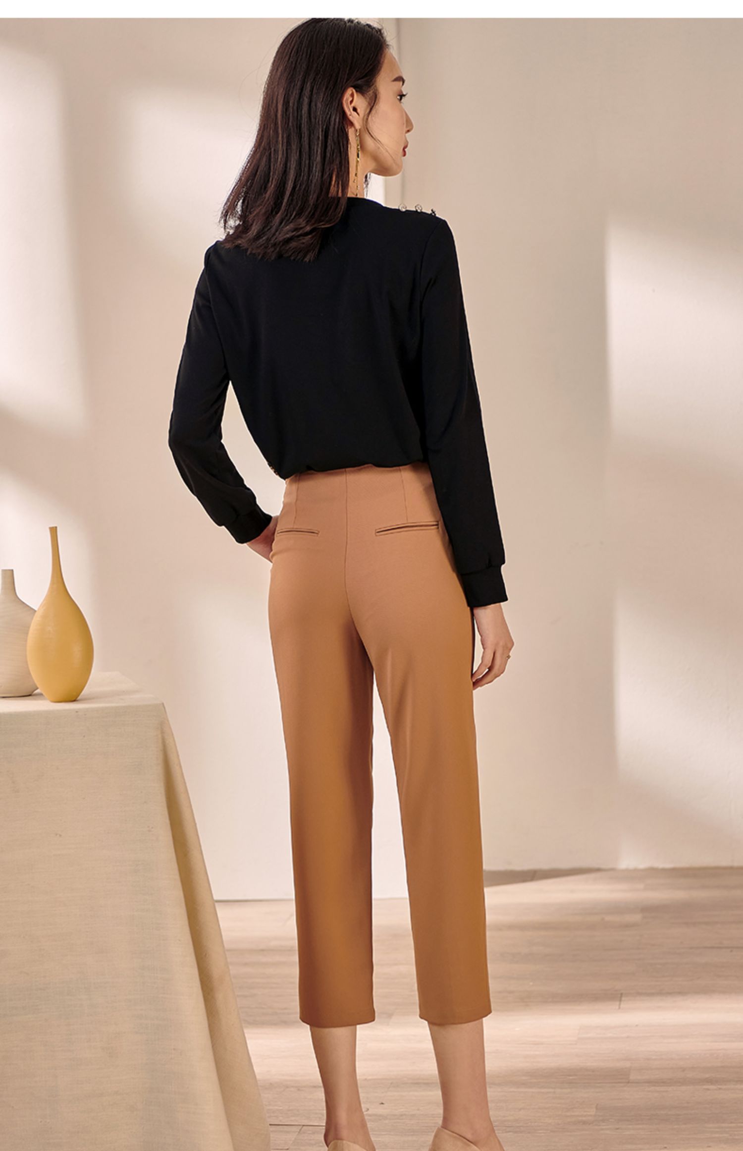 剩M 米思阳2025早秋新款驼色百搭休闲裤女修身显瘦斜扣九分小脚裤0064