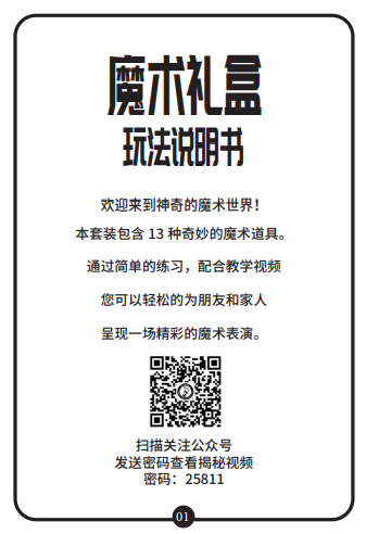 本套魔术材料共有13套魔术:艾力斯魔环,自升魔术棒,换牌术,魔术银币盒