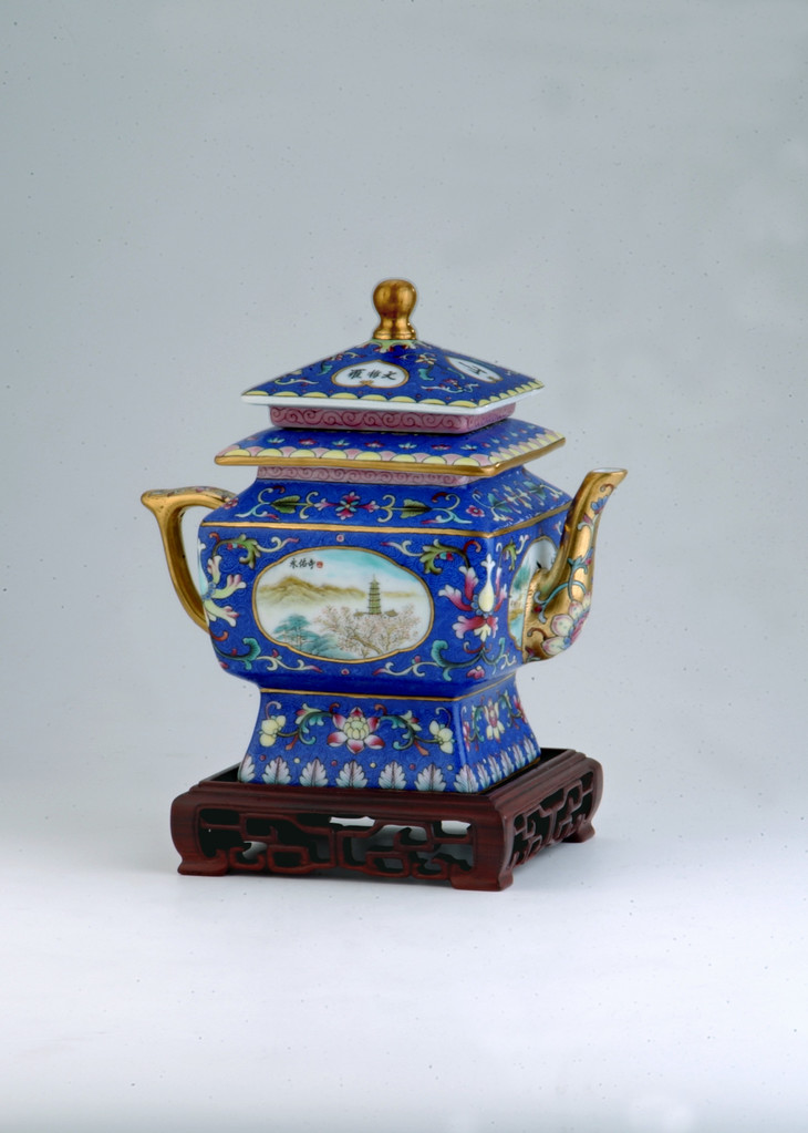2002年,正值承德避暑山庄建成300周年。鸿运斋创意,著名工美设计师秦永福设计的这款蓝地珐琅彩开光山庄壶,充分展现了避暑山庄的宏伟气势。