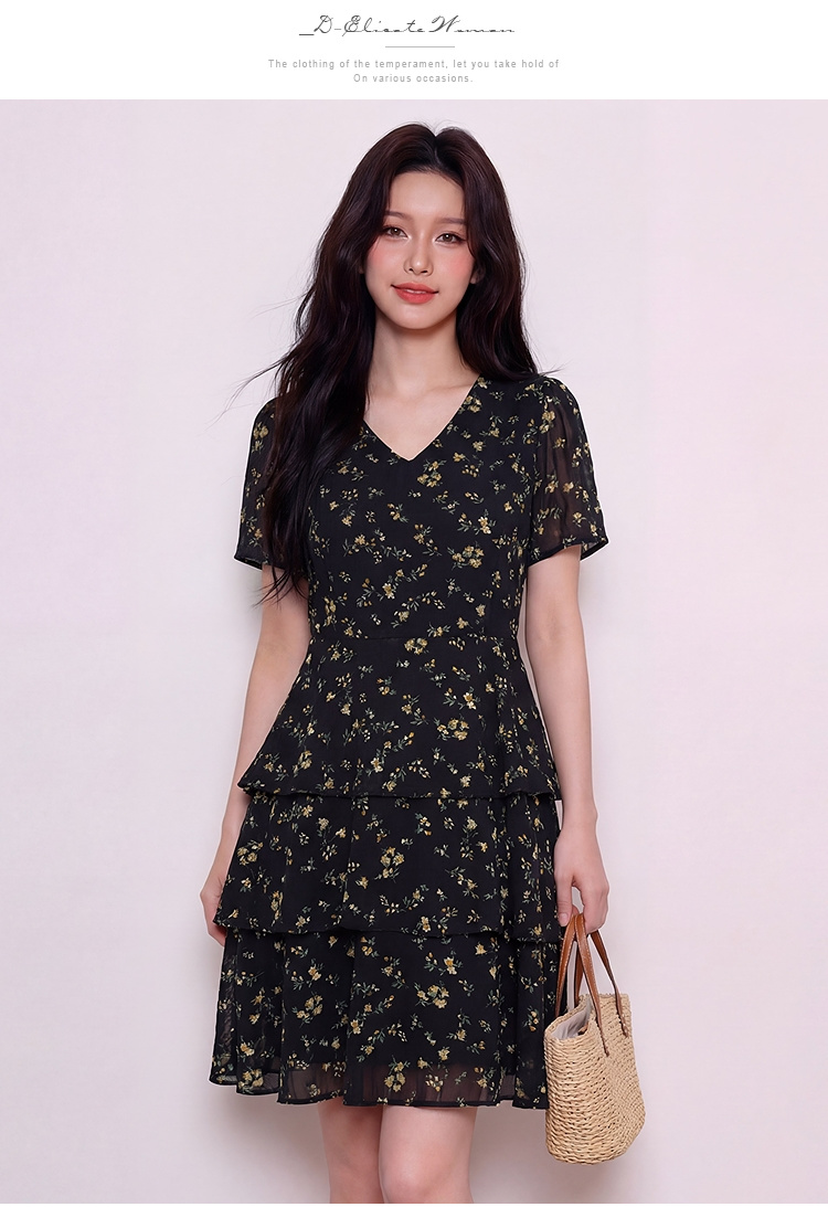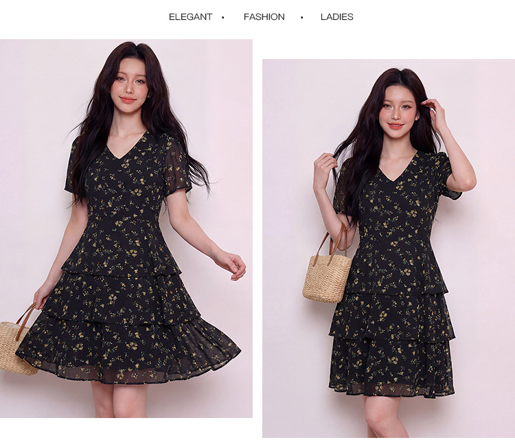 奢姿大码女装2026夏季减龄荷叶边V领连衣裙胖妹妹碎花蛋糕裙子9962860131