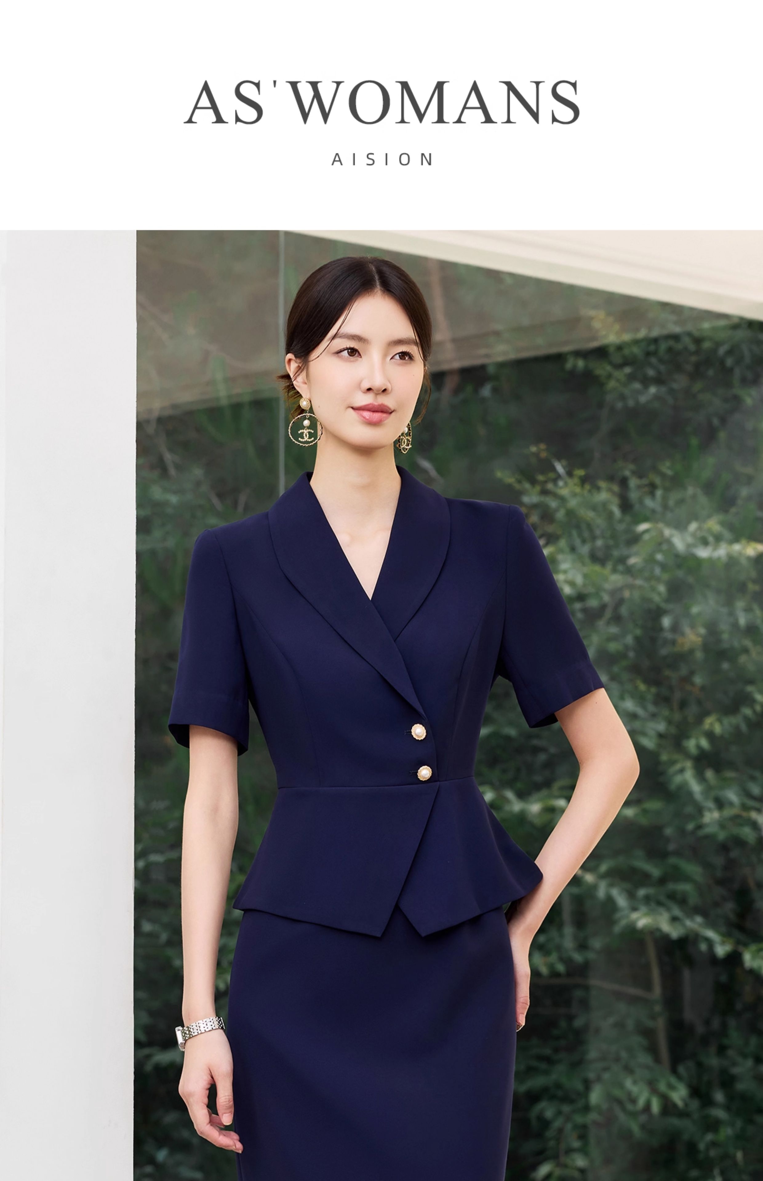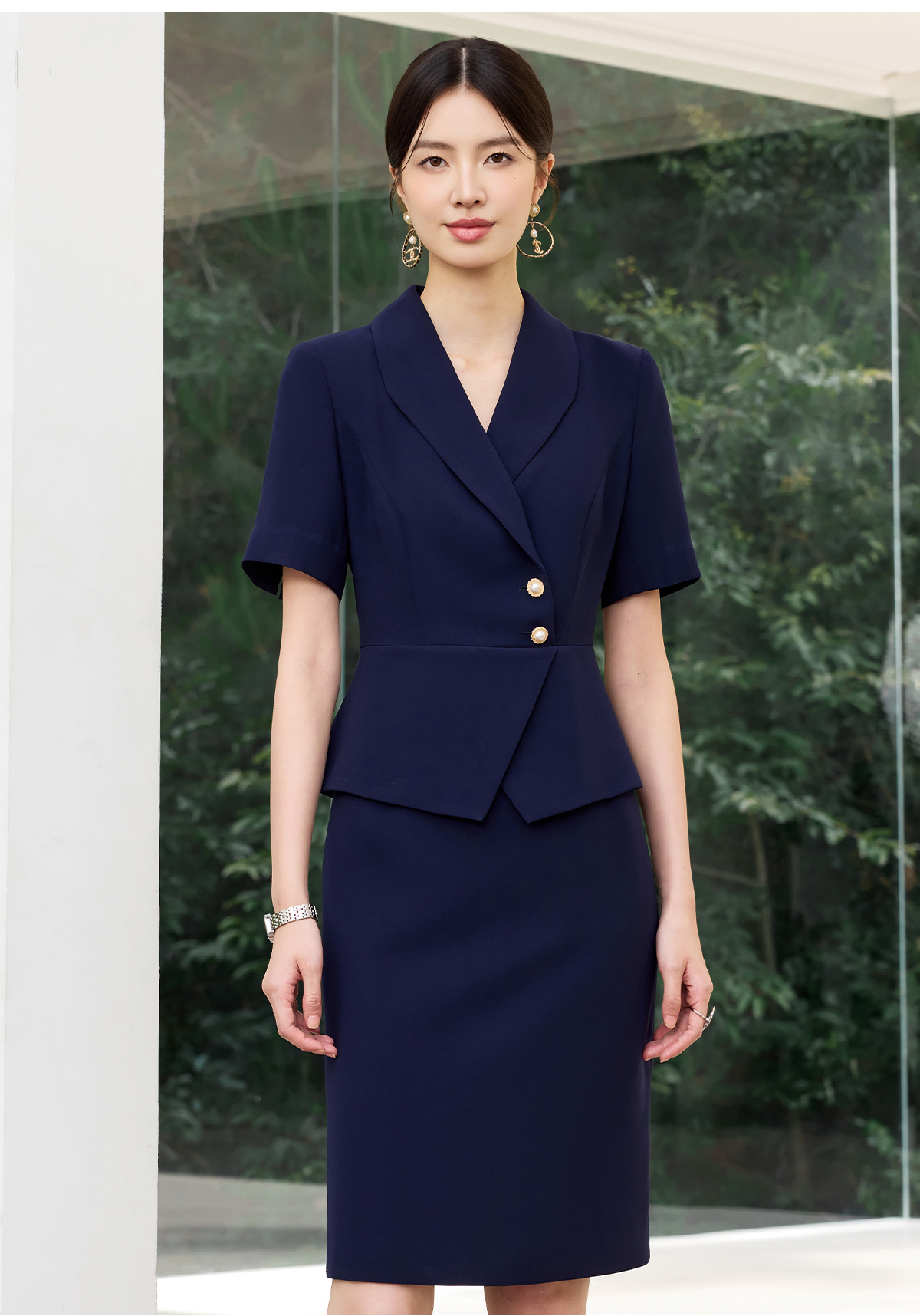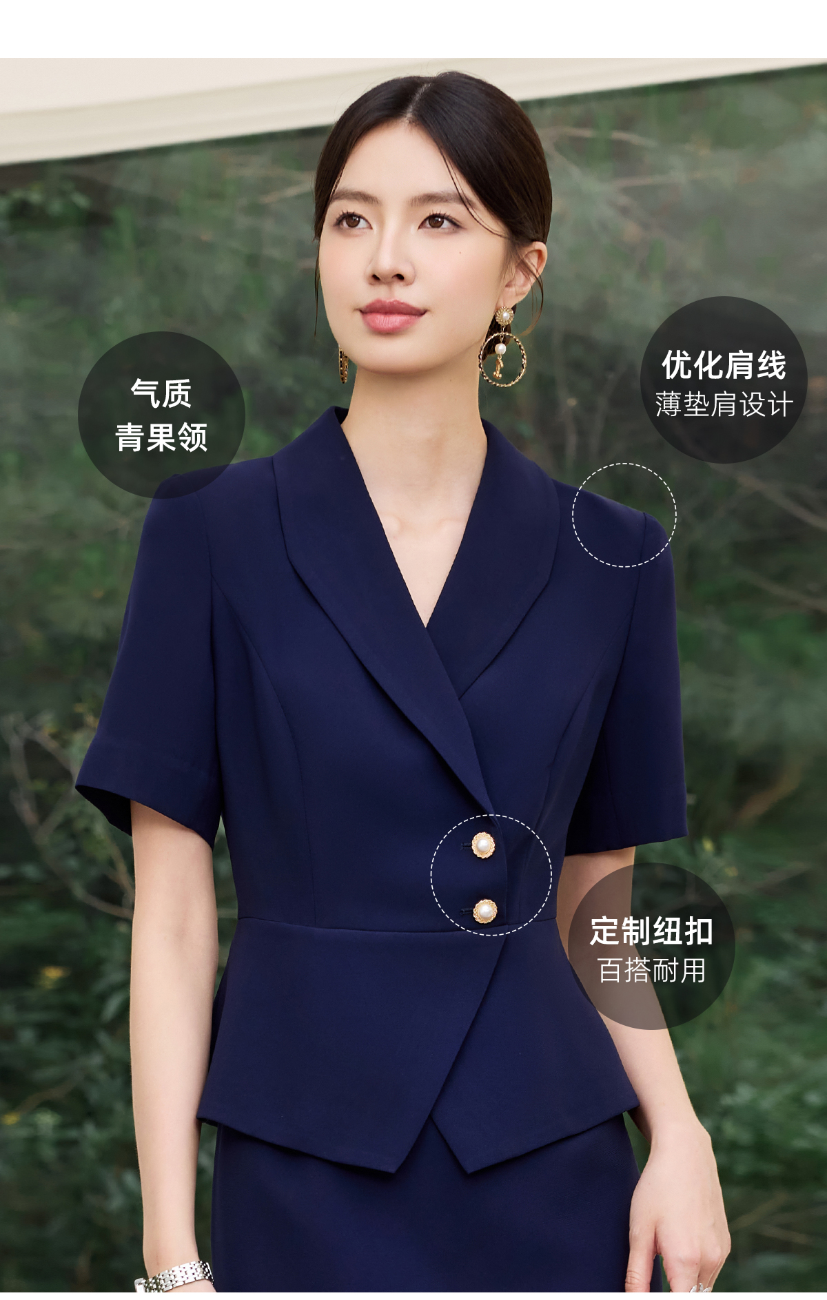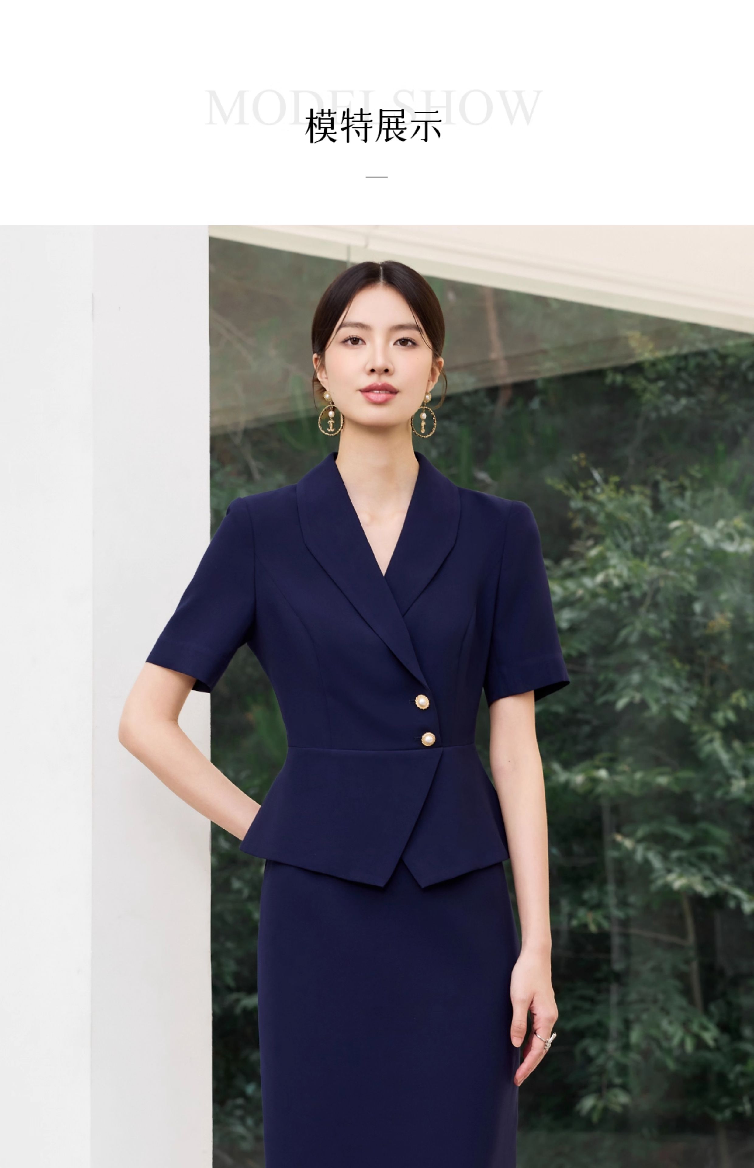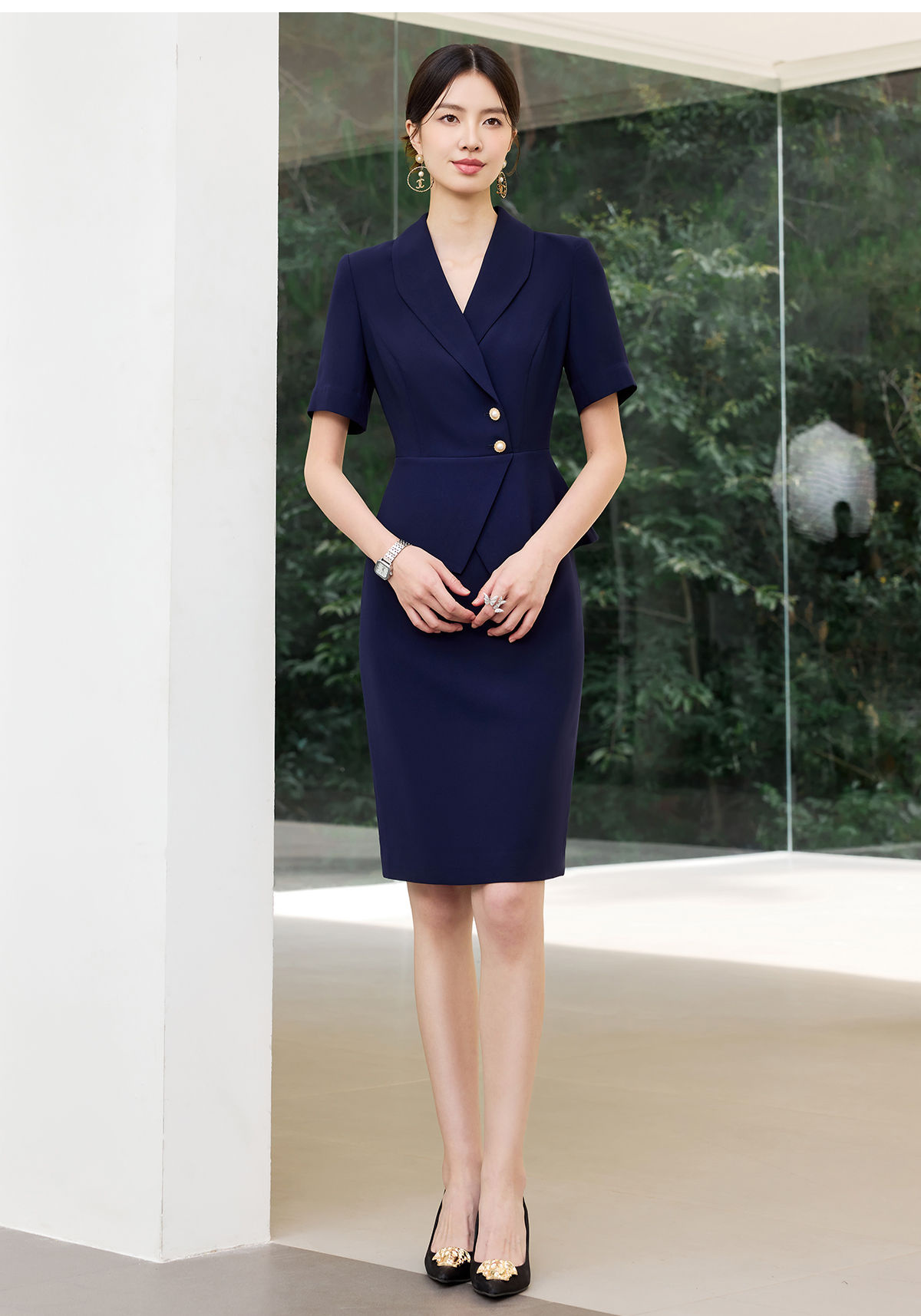 IWY/藏青色西装连衣裙女夏季短袖售楼部接待工作服假两件职业裙25Q799