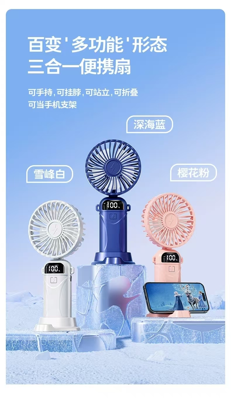 KIVEE手持小风扇迷你便捷随身折叠支架usb充电风扇挂脖长续航丨智能数显丨5档强风丨带底座挂绳丨