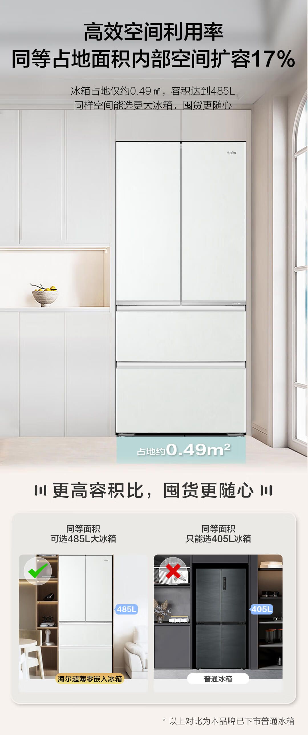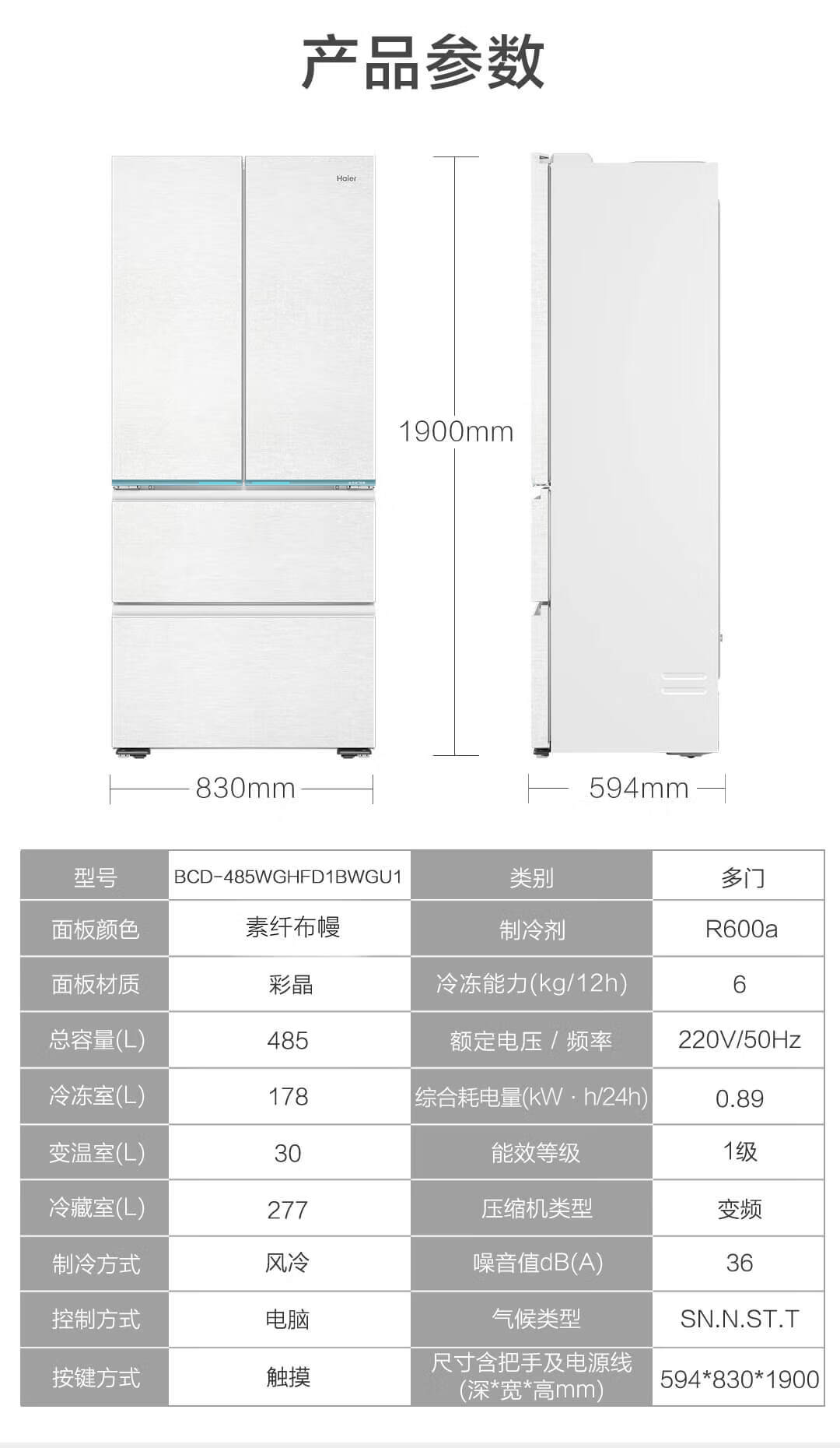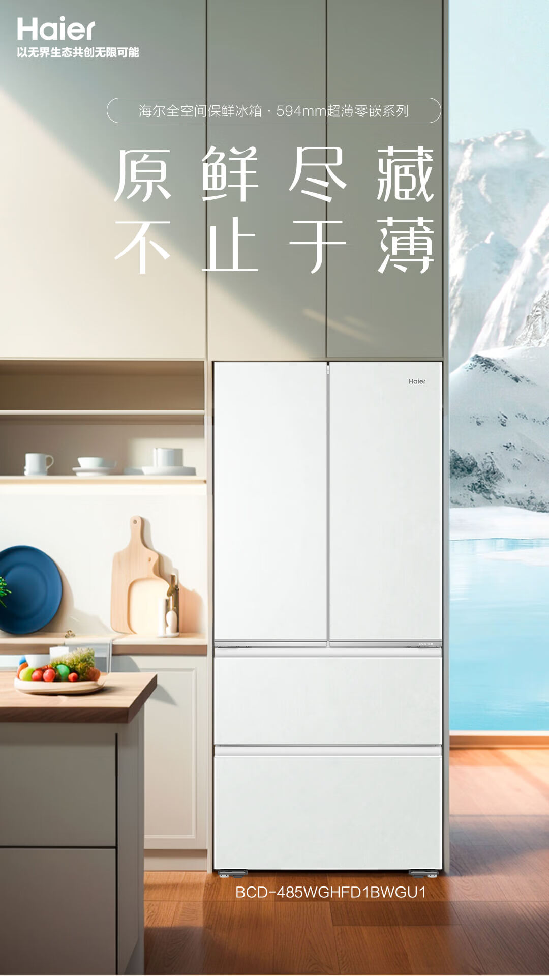 海尔(Haier)485升 全空间保鲜 594mm超薄 零嵌EPP 超净母婴空间 素纤布幔彩晶多门冰箱BCD-485WGHFD1BWGU1
