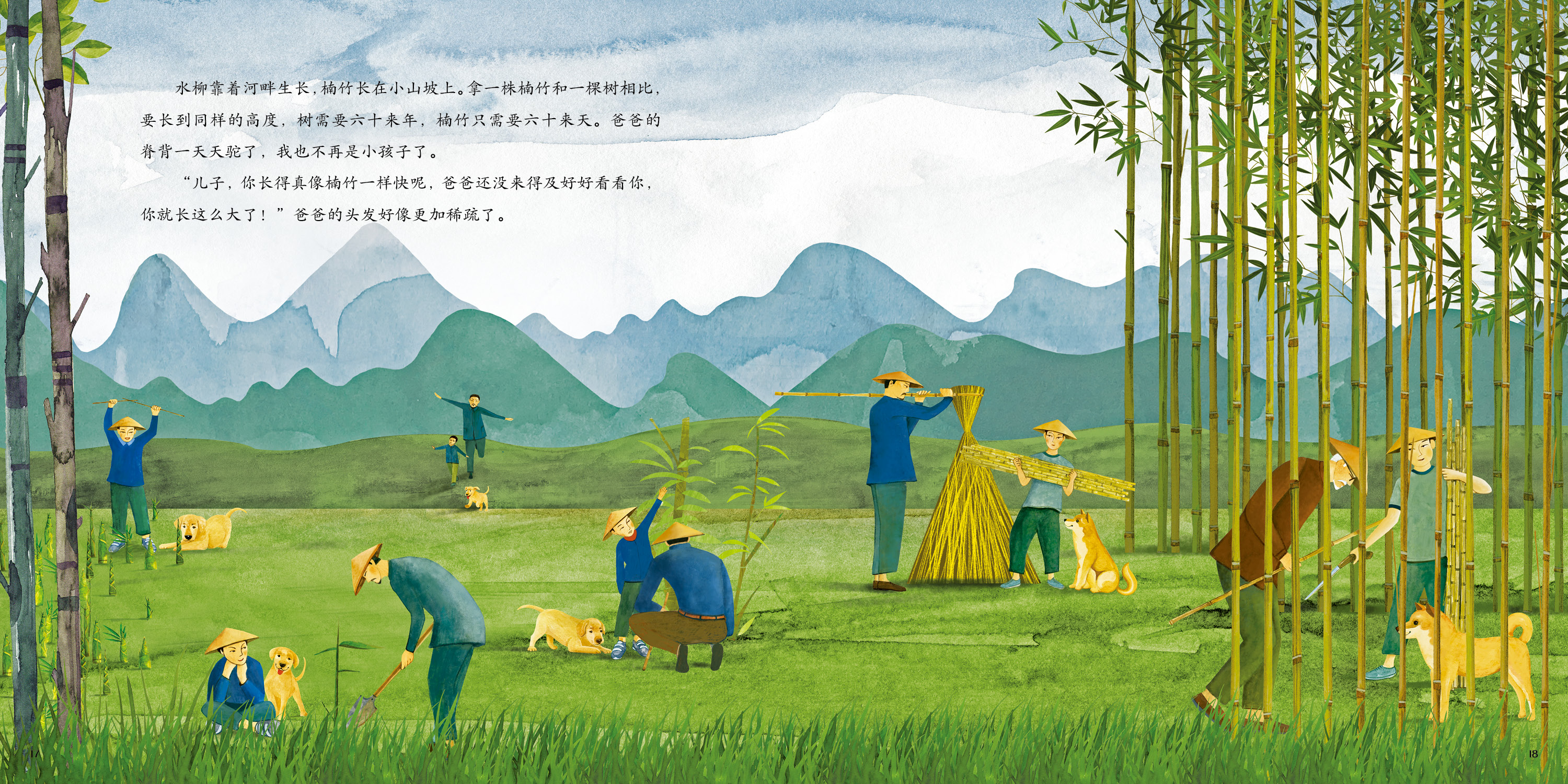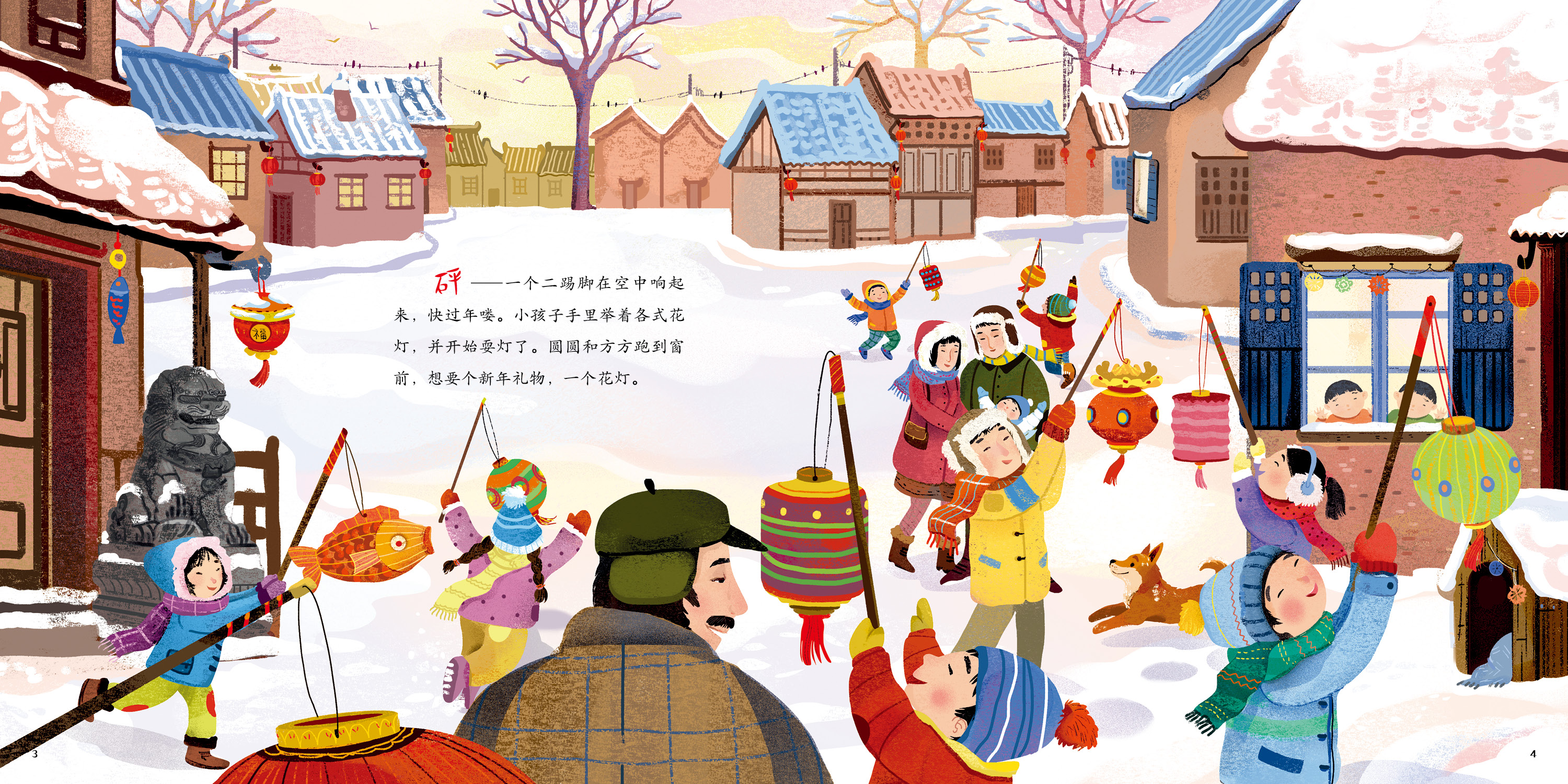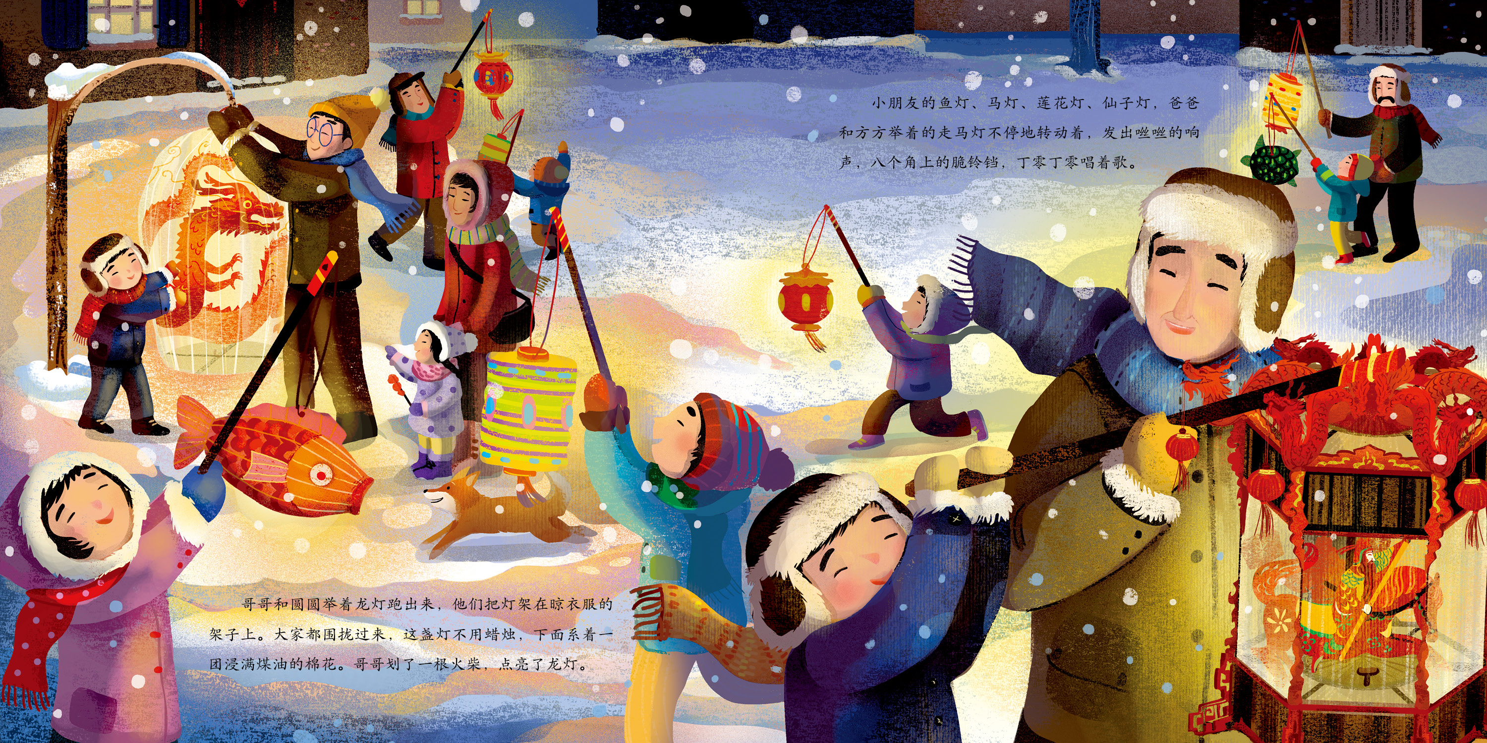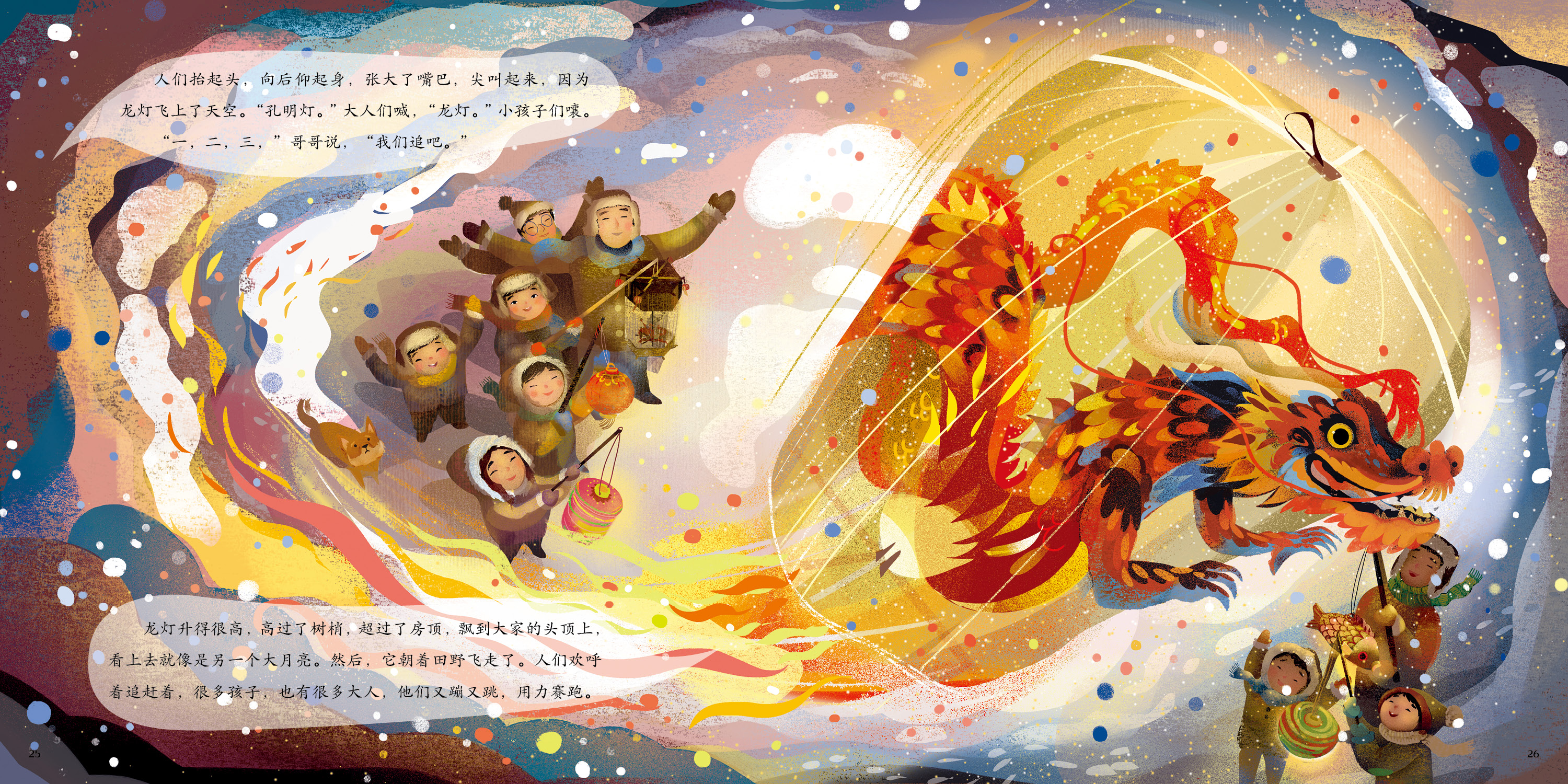 中国传统文化与外国插画师的碰撞,颇具看点。舞龙灯、剪纸、油纸伞、竹子等元素充满传统文化风情。