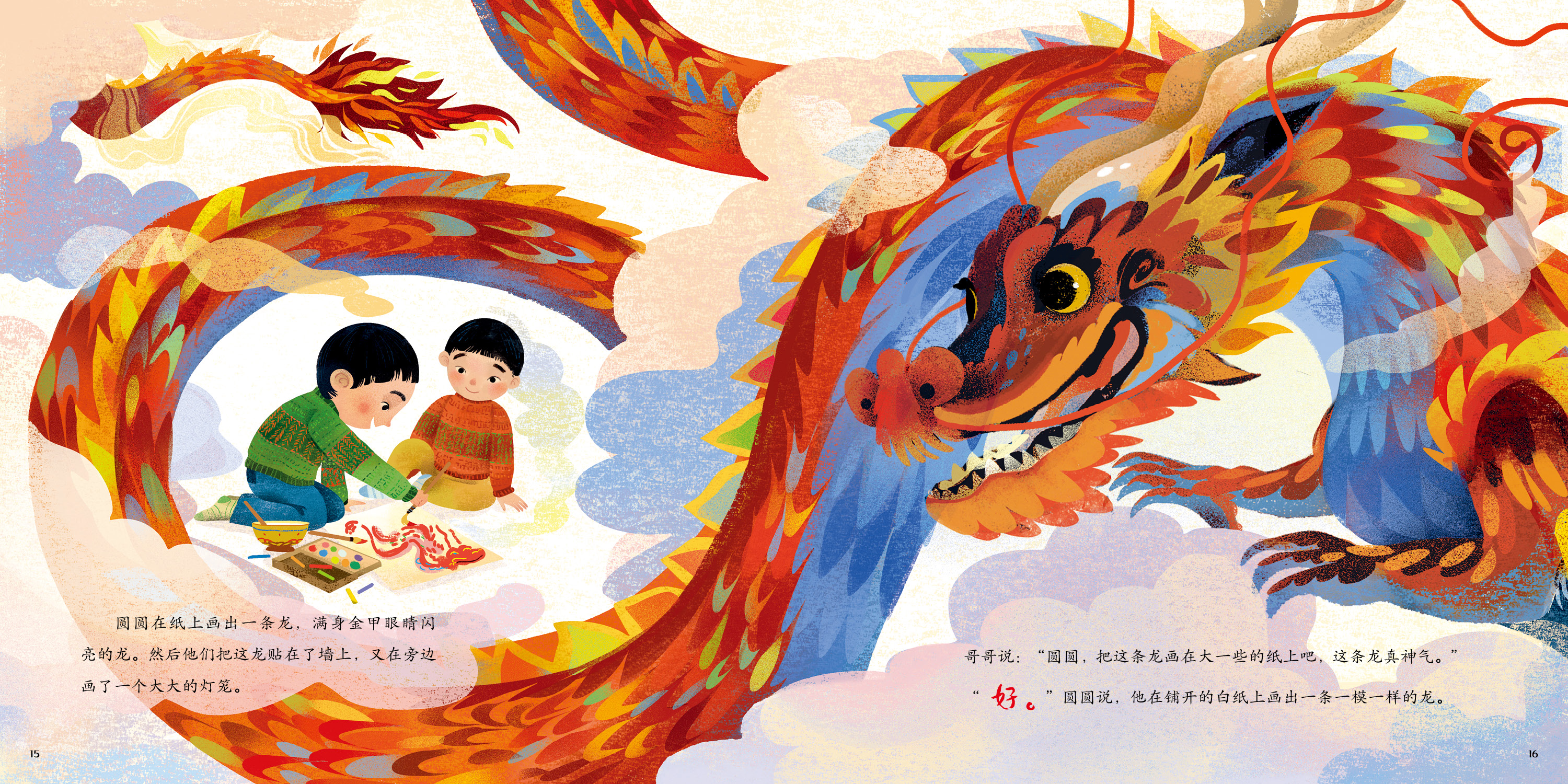 《龙灯》讲述了一个“春节民俗故事”——圆圆和方方是双胞胎,他们有一个共同的愿望:在春节那天拥有一盏大大的花灯。新年到了,龙灯里的龙跳到天空中,变成一条闪着七彩光芒的火龙,他带着财神、门神、灶王、兔儿爷在天上散步、欢笑,把节日的福气带给大家。