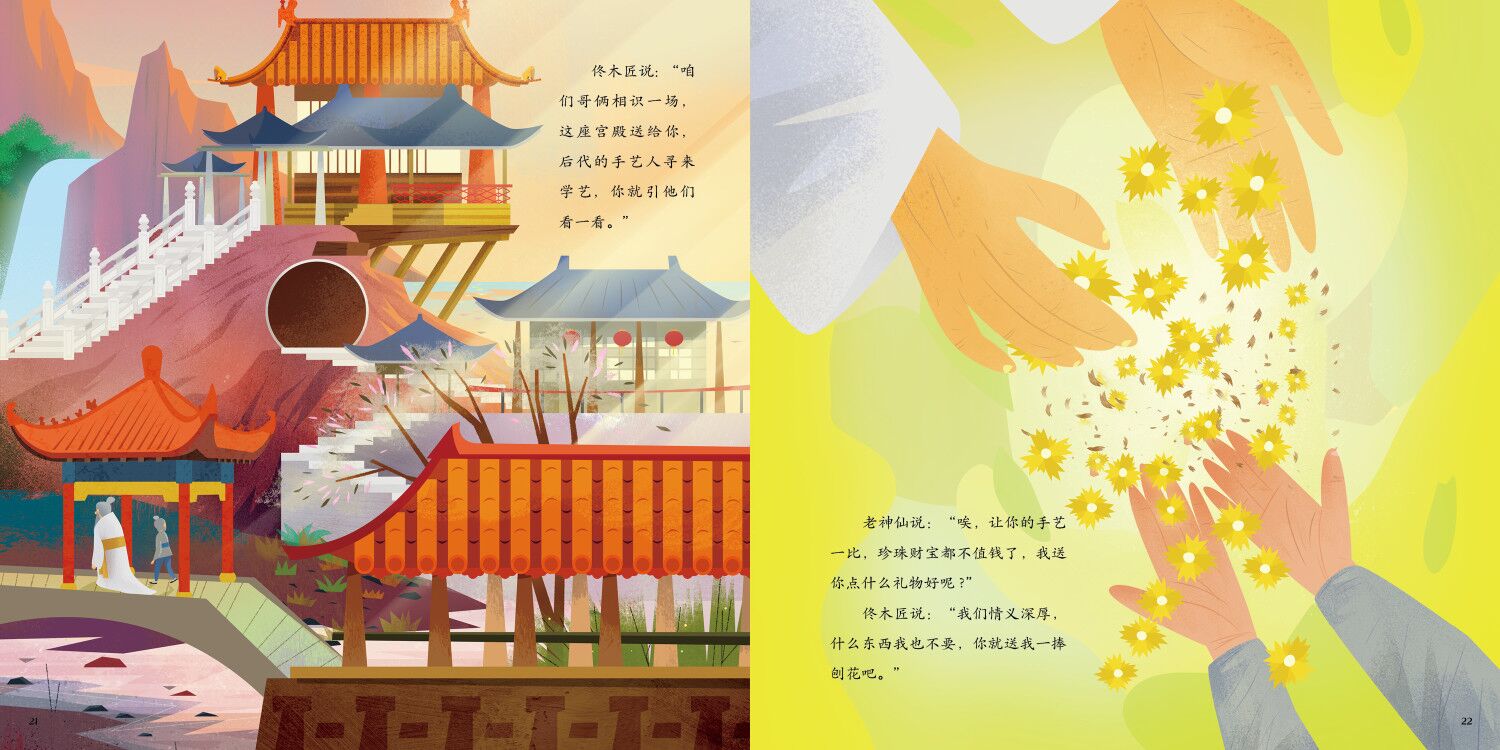 《金花路》讲述了一个中国民间传统故事——从前有个姓佟的巧木匠,走过一条危险的山路。他随手撒下一些木头刨花,这些刨花就生了根,开出金色的花朵,点缀出一条金花路……这是一个关于坚持与执着的故事,也是一个关于传承的故事。