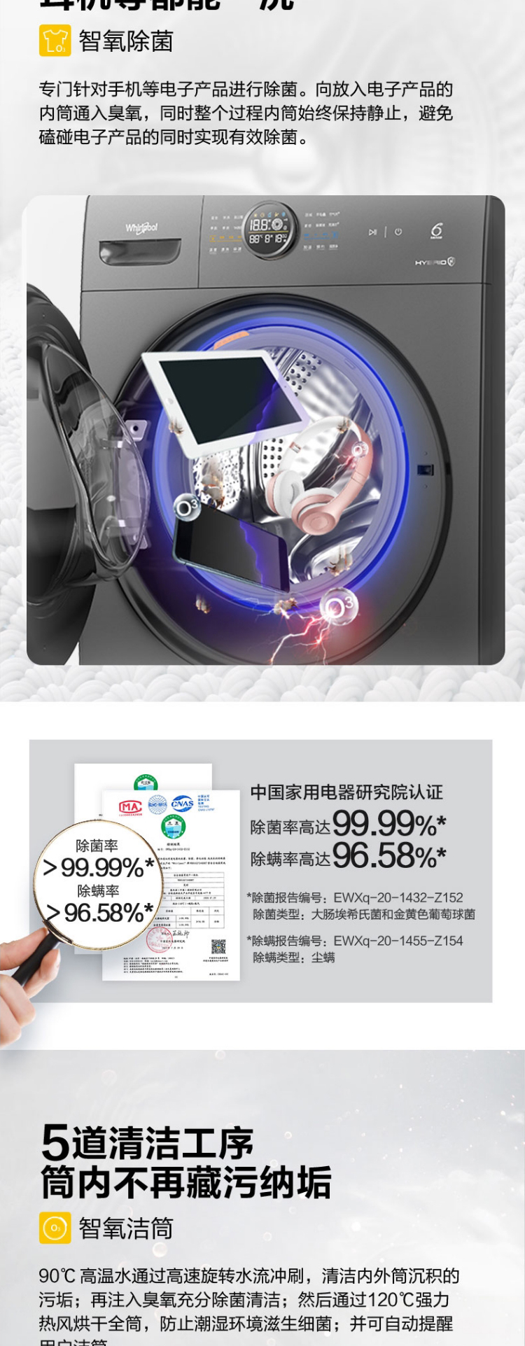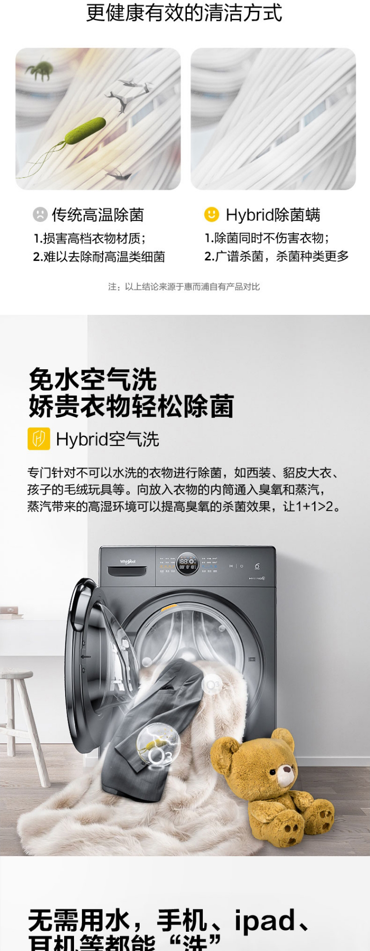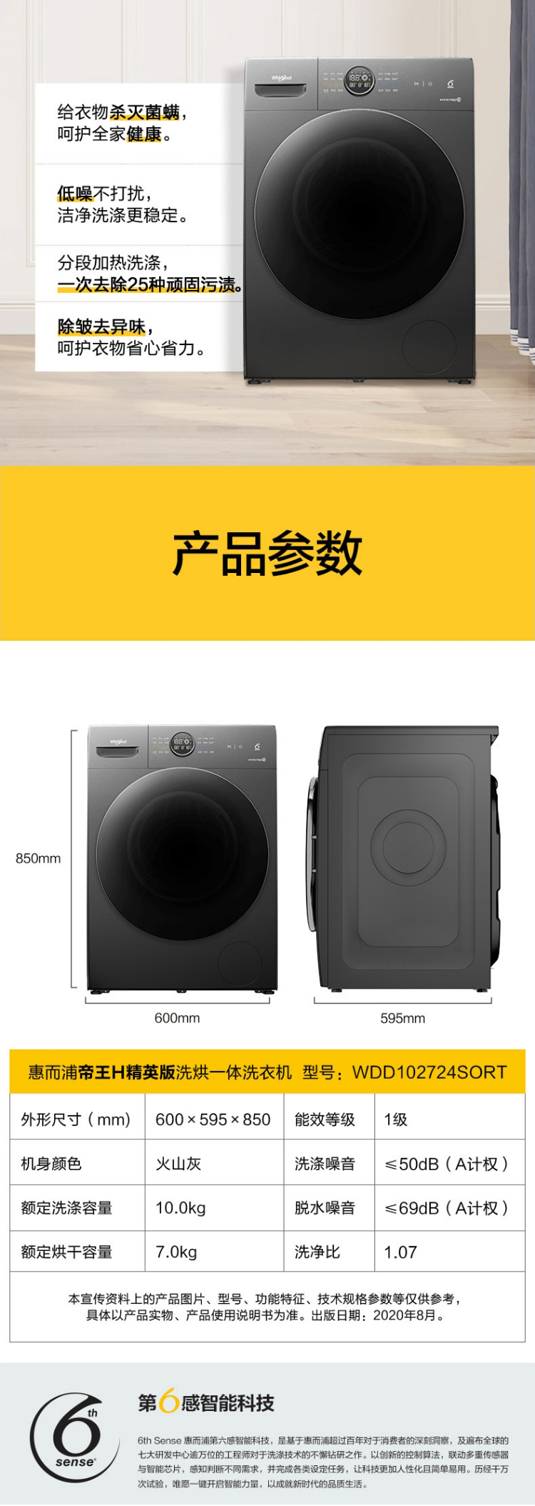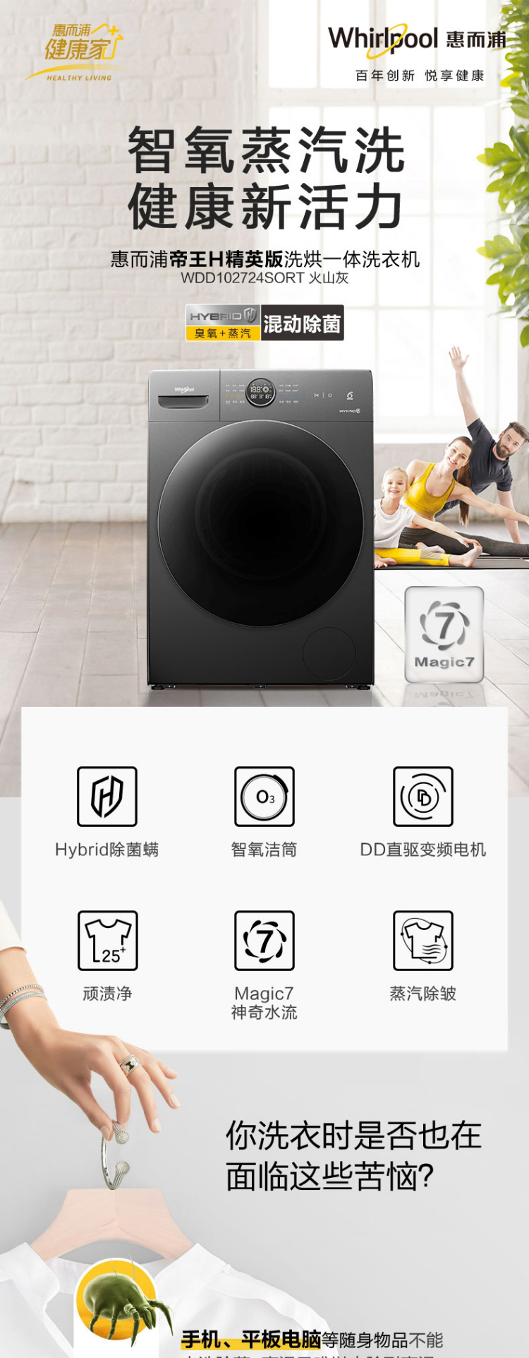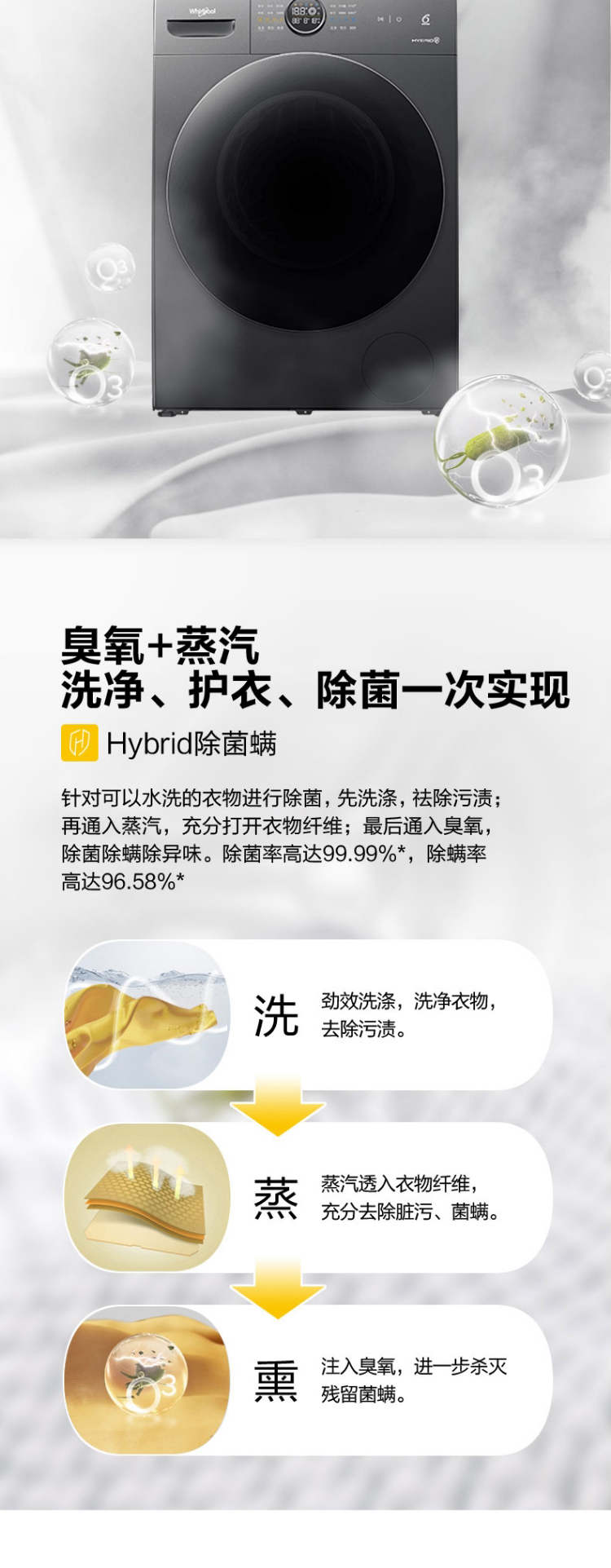 惠而浦(Whirlpool)10公斤洗烘一体洗衣机臭氧+蒸汽混动除菌空气洗帝王H精英版DD直驱变频 WDD102724SORT
