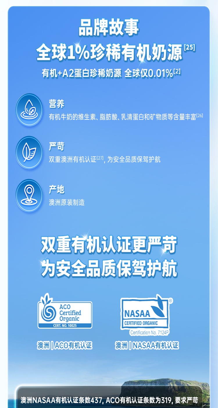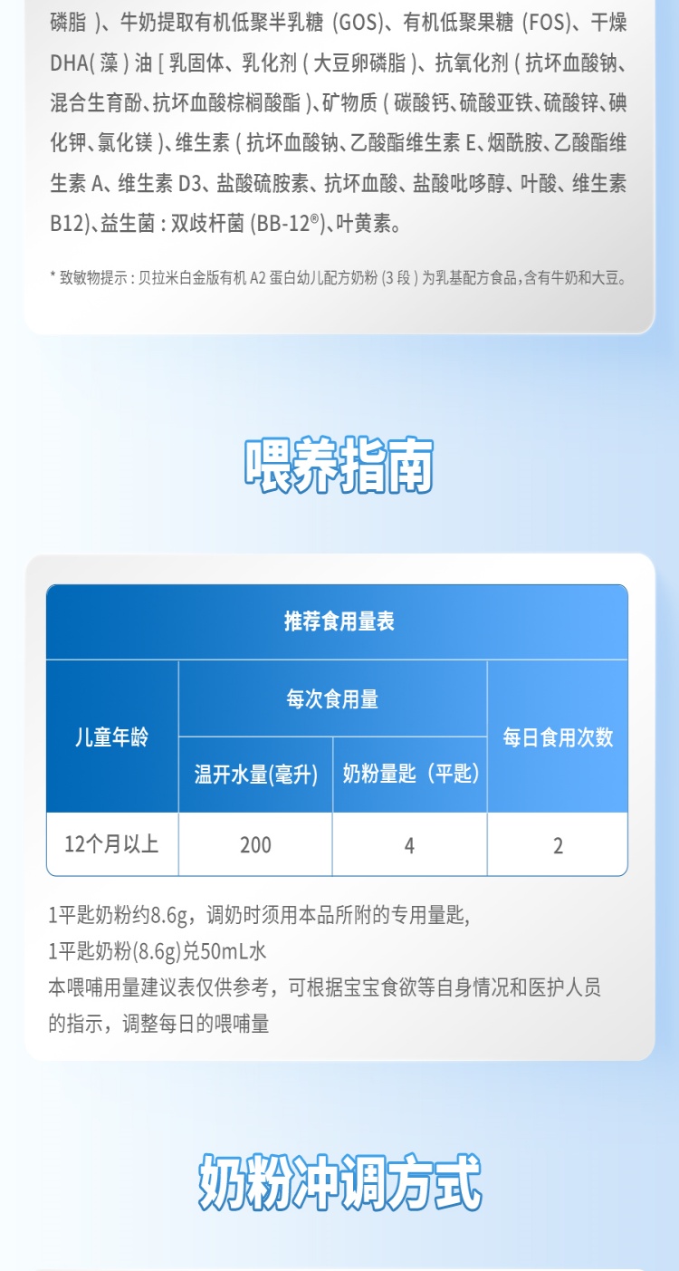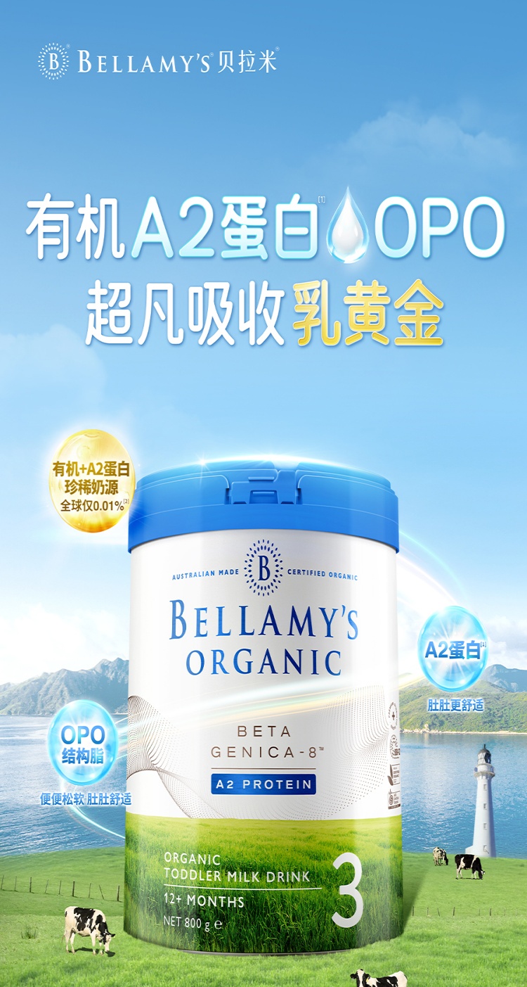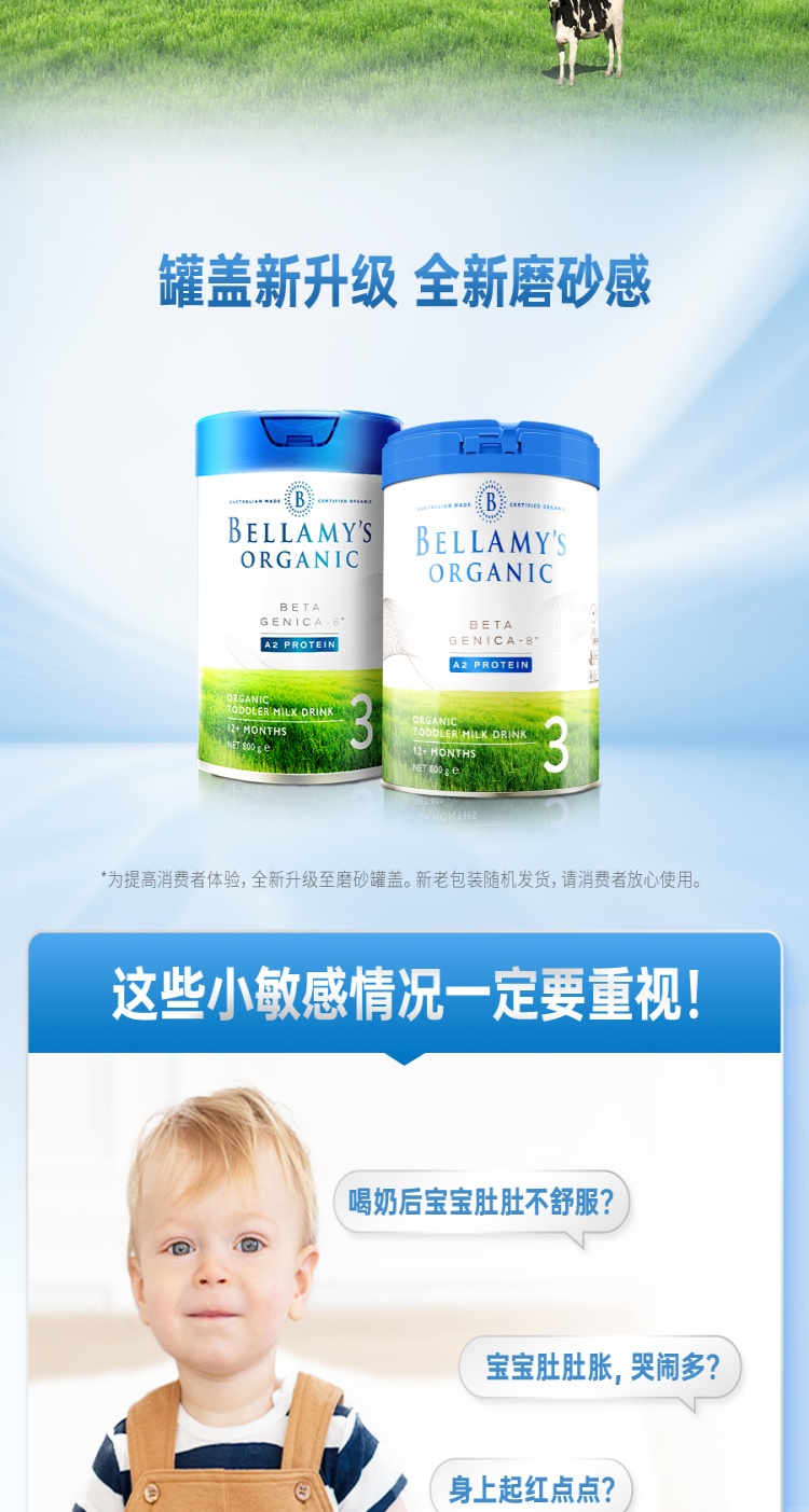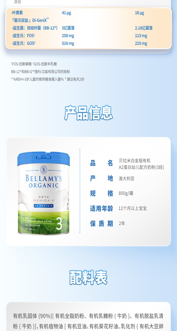 【贝拉米白金版】澳洲进口DHA有机A2蛋白奶粉3段12-24个月800g/罐