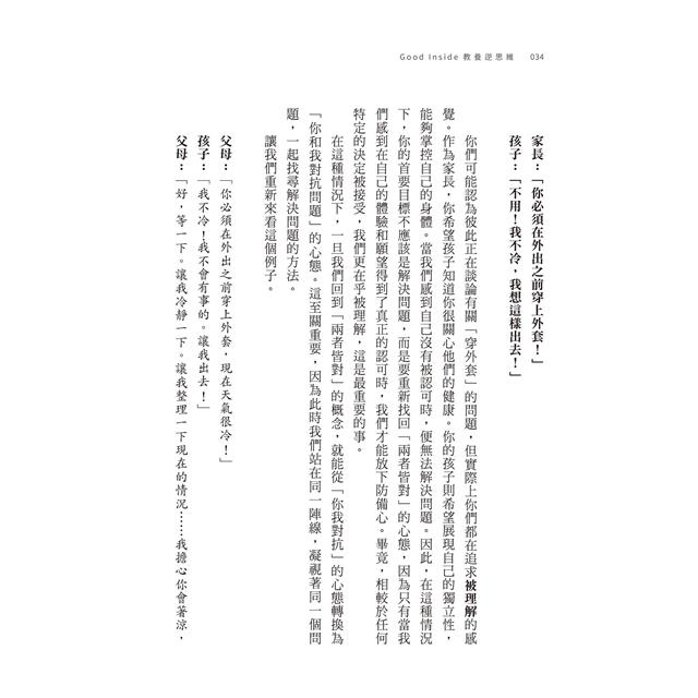 「注意!閱讀本書極有可能讓你成為更好的父母!無論你是在努力讓你的小寶貝冷靜下來,還是讓你青少年的孩子敞開心扉,貝琪博士都是教養的智慧泉源。她在肯定你的最佳本能和挑戰你重新思考你的最壞反應之間取得了理想的平衡。」──《逆思維》作者亞當.葛蘭特