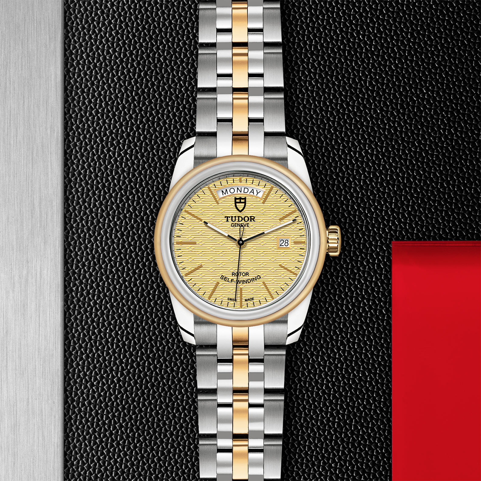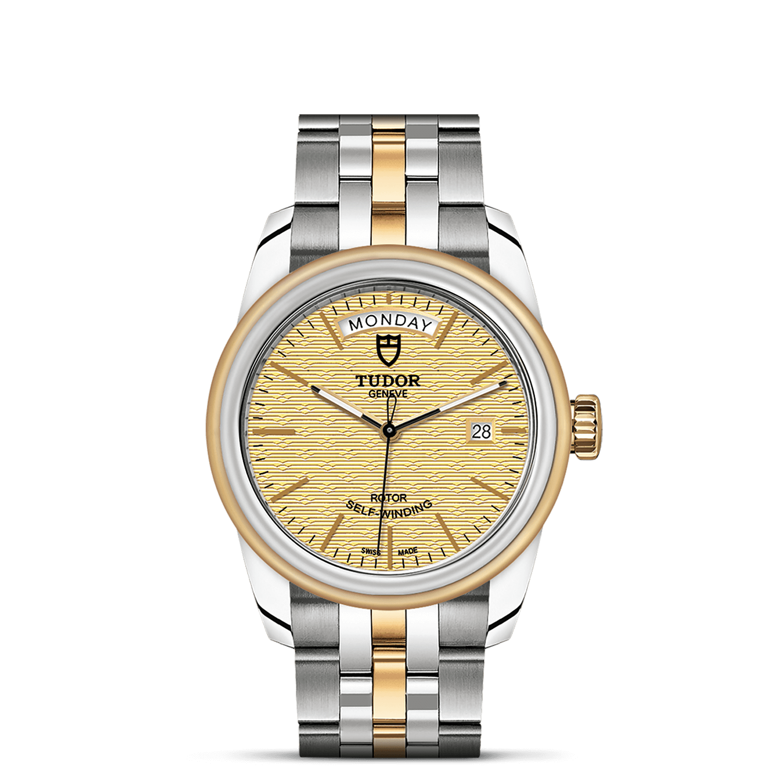 旋入式上链錶冠,饰以帝舵表标志;精钢覆有0.1毫米18K黄金薄层