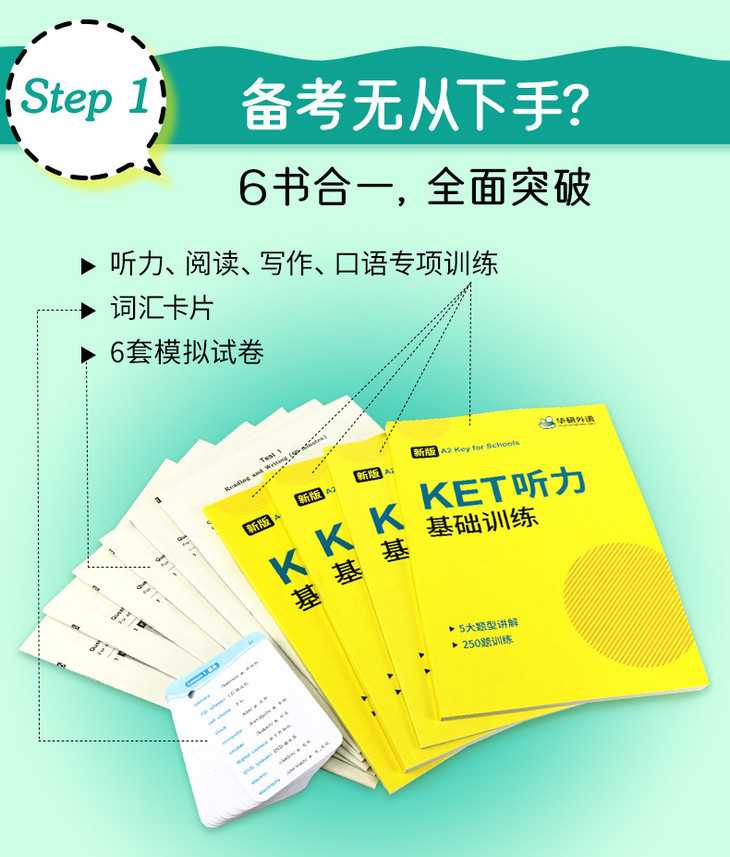 1.剑桥KET听力基础训练,基础技能训练+分题型讲解+5套模拟训练;
