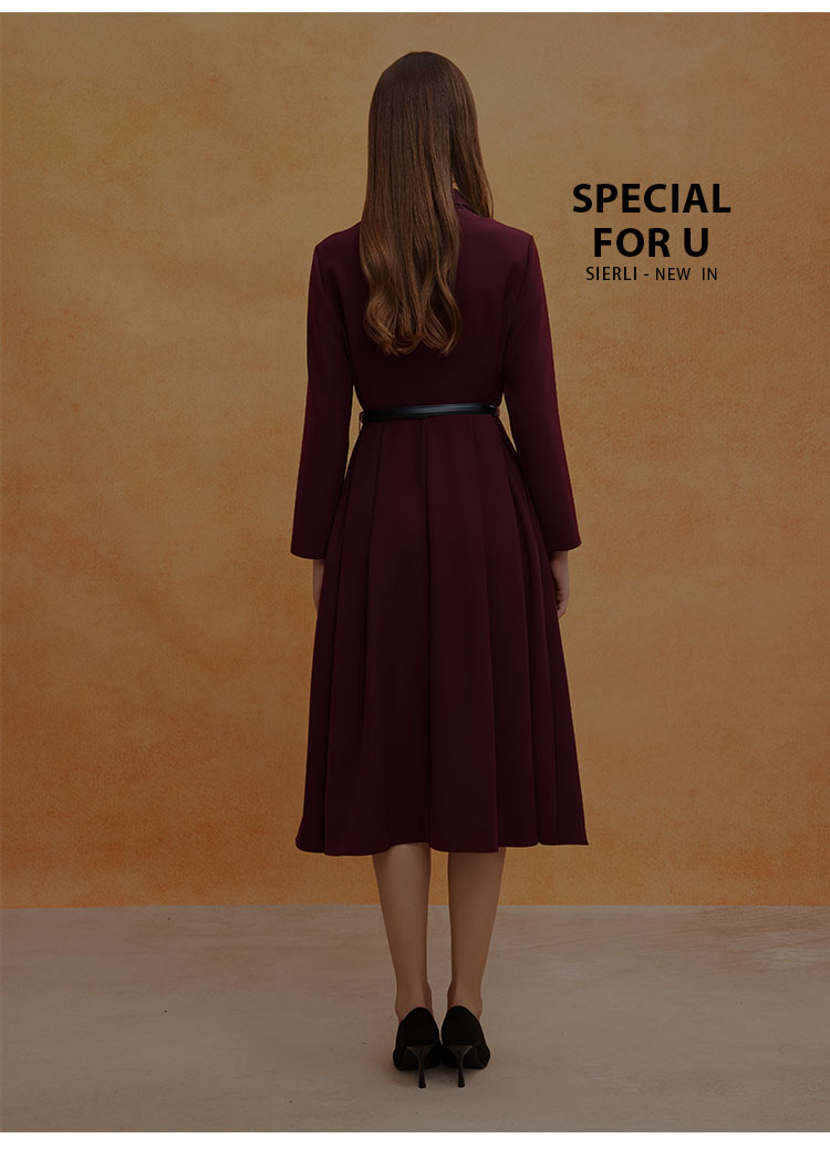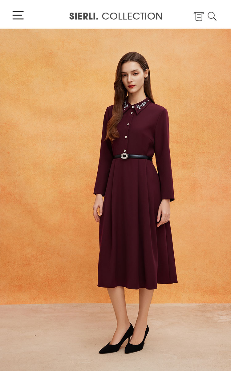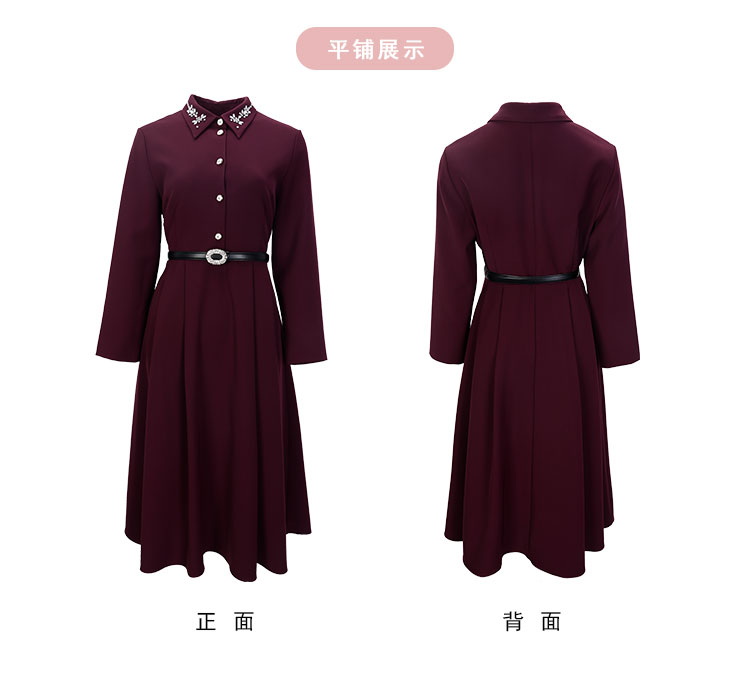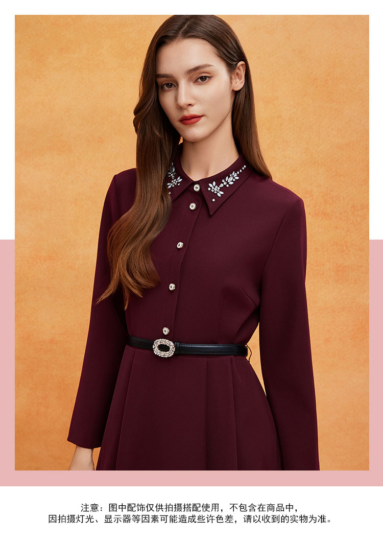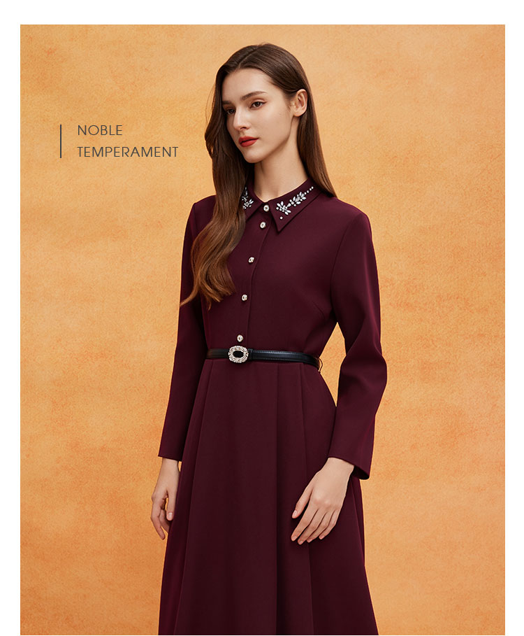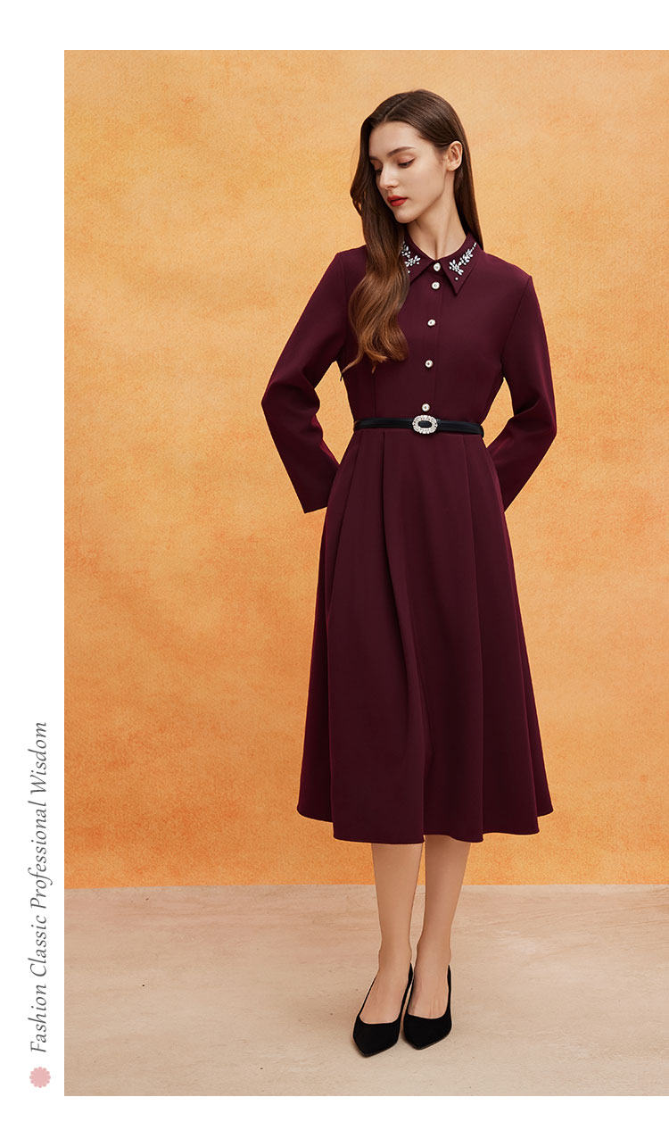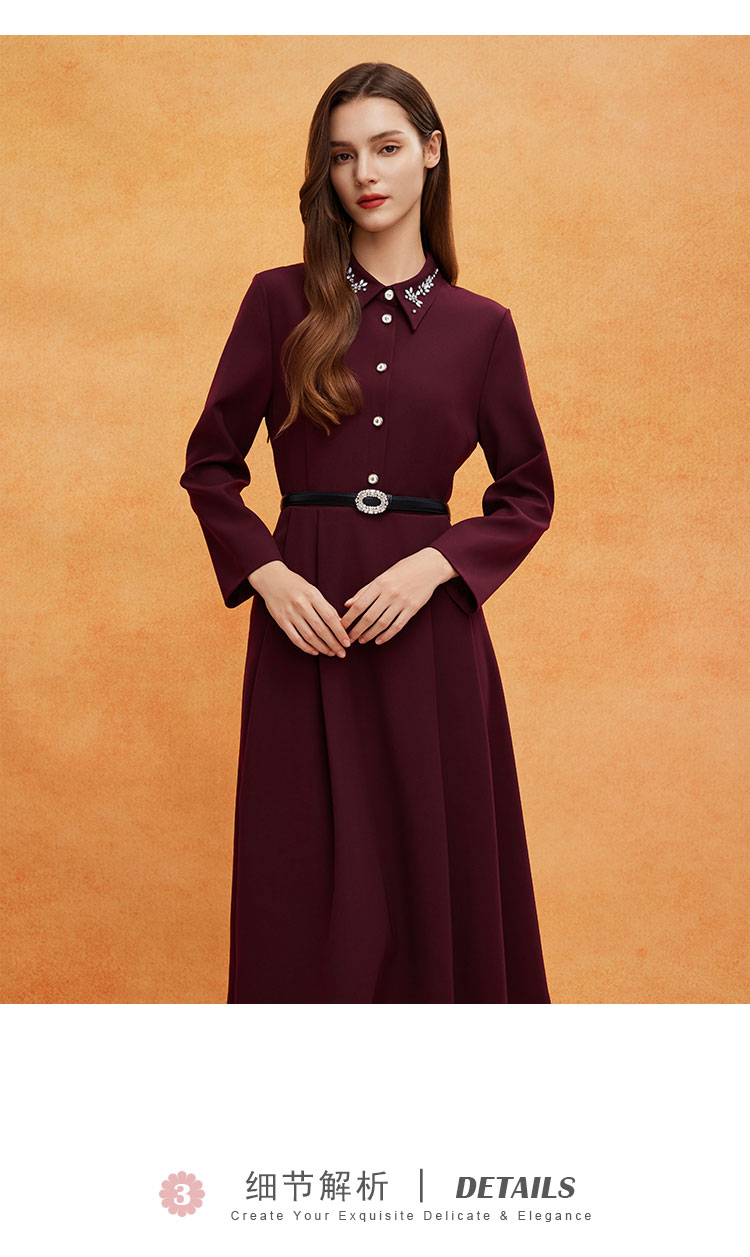 QE811斯尔丽2025春季新款赫本风衬衣领钉珠精致收腰放摆配腰带连衣裙