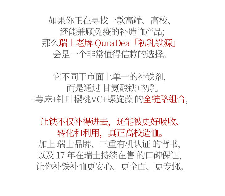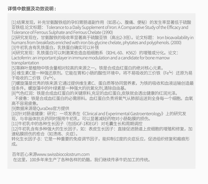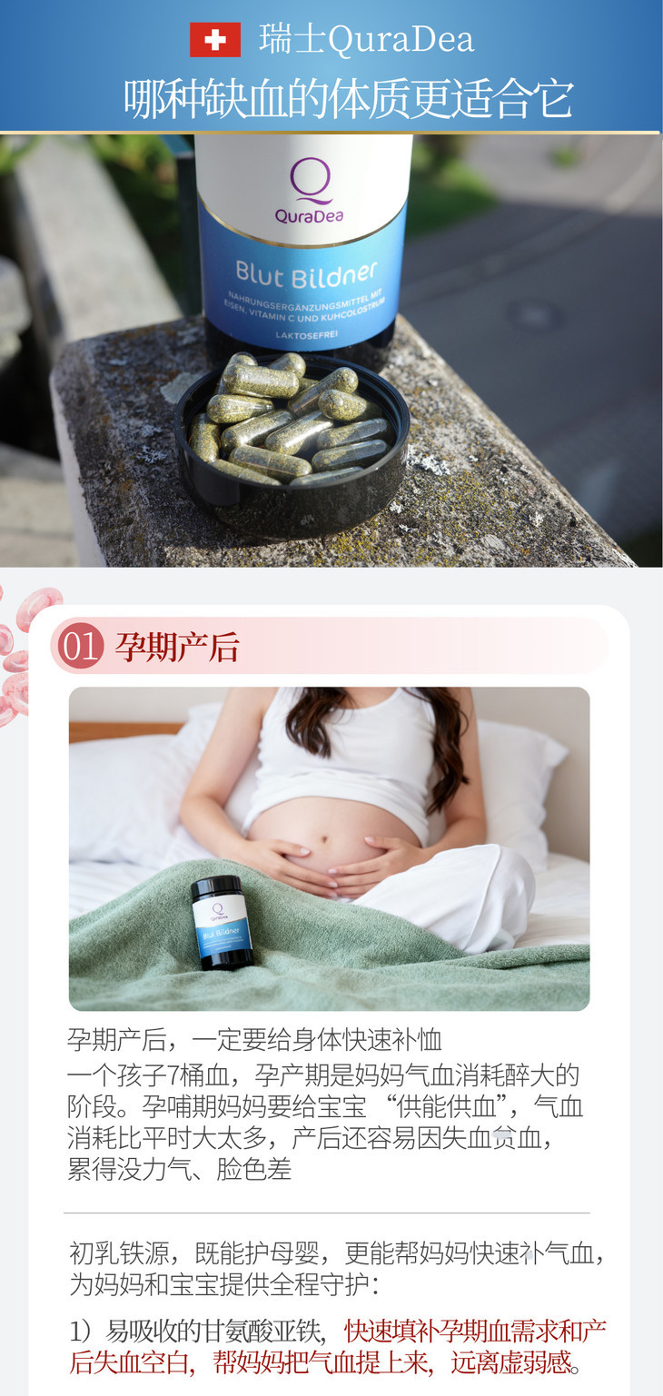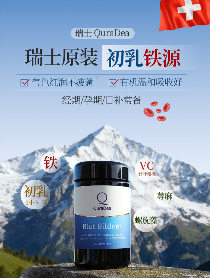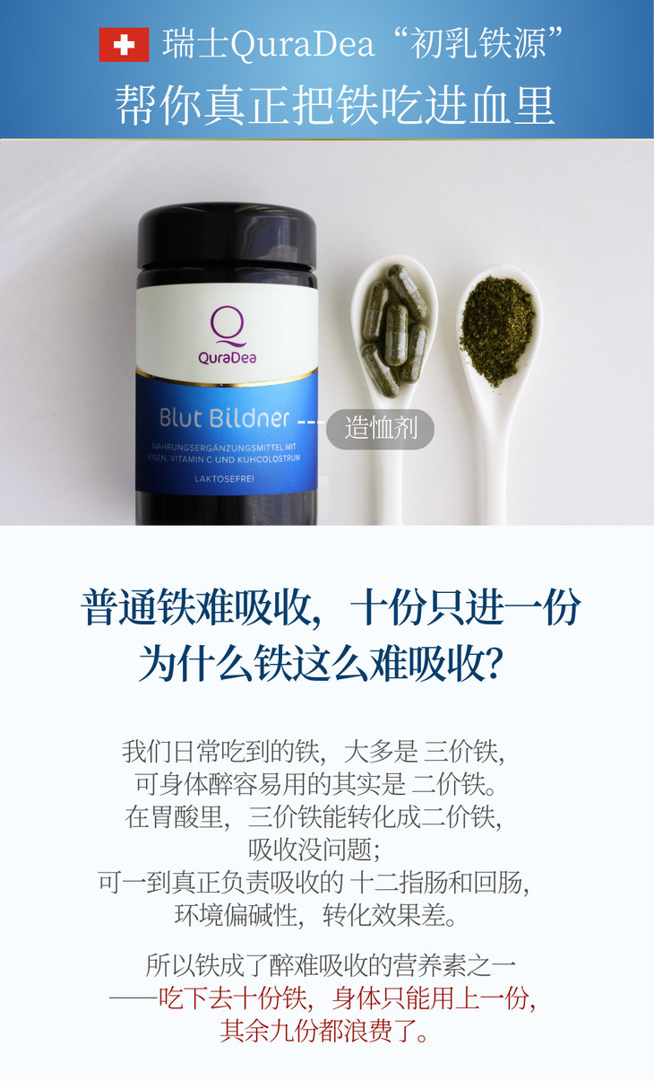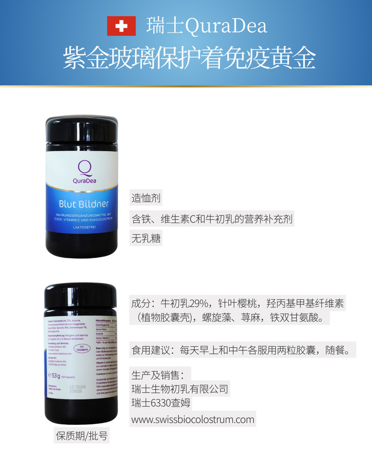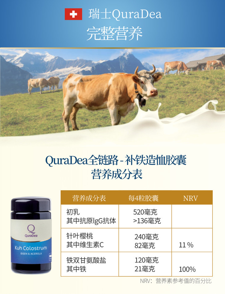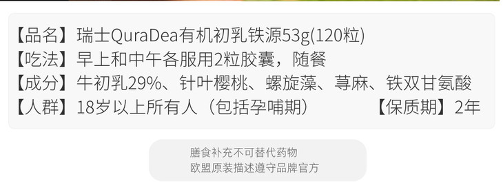 瑞士QuraDea牛初乳/铁源胶囊120粒 含多种维生素/氨基酸/矿物质!提免yi、促进铁吸收、守护肠道和皿液健康!全链路补铁造桖 日期27年8月