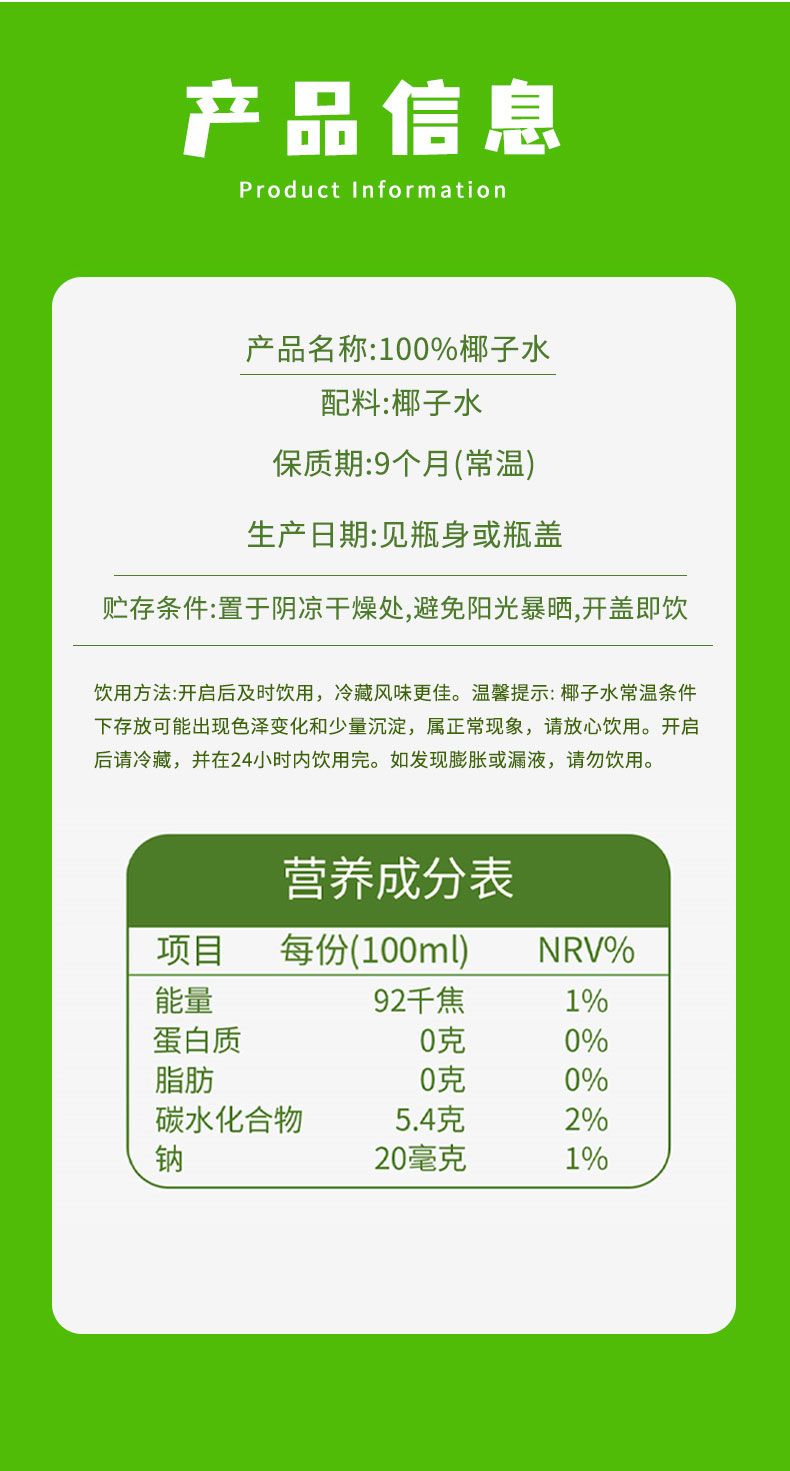 【品名】藕享100%椰子水 【规格】10瓶(220ml/瓶) 【配料】椰子水 【禁食人群】婴幼儿,对椰子过敏者禁食; 【注意事项】 1、可能会有少量沉淀,饮用前请摇匀。 2、开启包装后需冷藏,并尽快饮用,请勿将本包装在微波炉中加热。 3、若出现胀包、苦包、酸包等问题,请勿饮用。 【发货时间】下单2-3天内,如其他渠道爆单2-7天内延顺,不接急单 【售后标准】 1、特殊产品不支持7天无理由,破损按比例赔付,若有质量问题请于签收后的24小时内拿快递面单+产品实拍+视频,找客服处理售后,超售后时效,不做售后处理! 2、由于显示器和拍摄光线等因素会造成些微色差,以收到实物为准; 3、个人口感不作为售后理由; 品相不好、储存不当不售后不赔付 4、福利开团,微利经营,下单后不支持退改、拦截、拒收。(如一定要拒收拦截需扣除费用4元) 5、一定要留对正确的收件信息,否则由此造成的无法顺利签收由顾客承担。 6、产品是瓶装,因快递运输不可抗拒因素,导致瓶子轻微凹陷。不影响食用。不做售后处理。 拍下即为默认同意以上条款,介意请勿拍,望理解 |