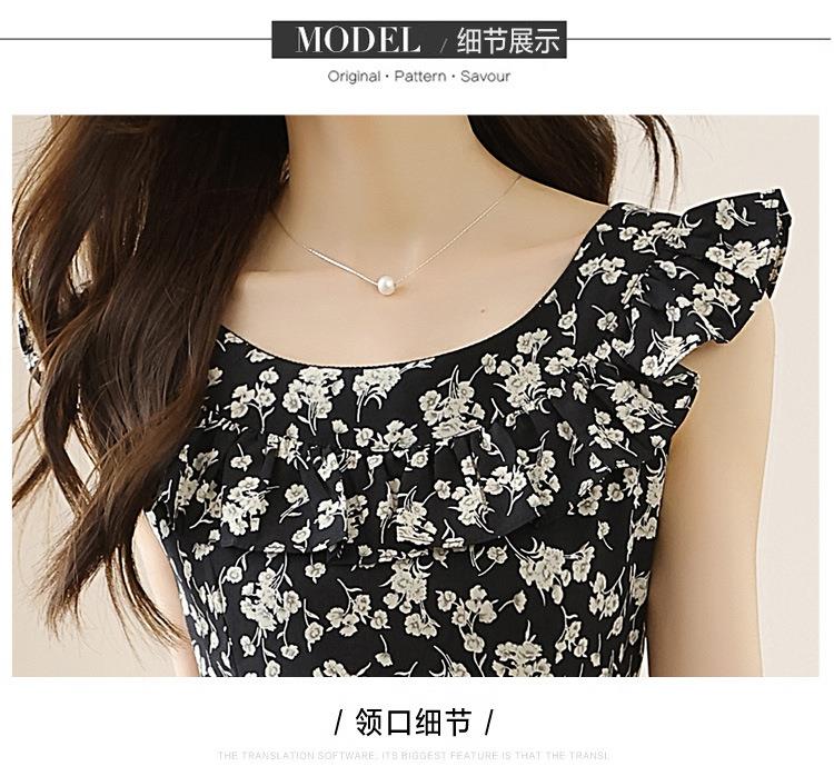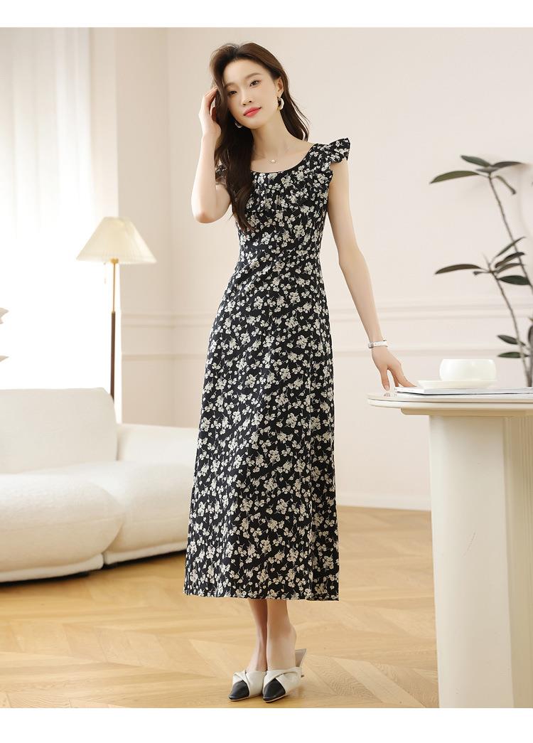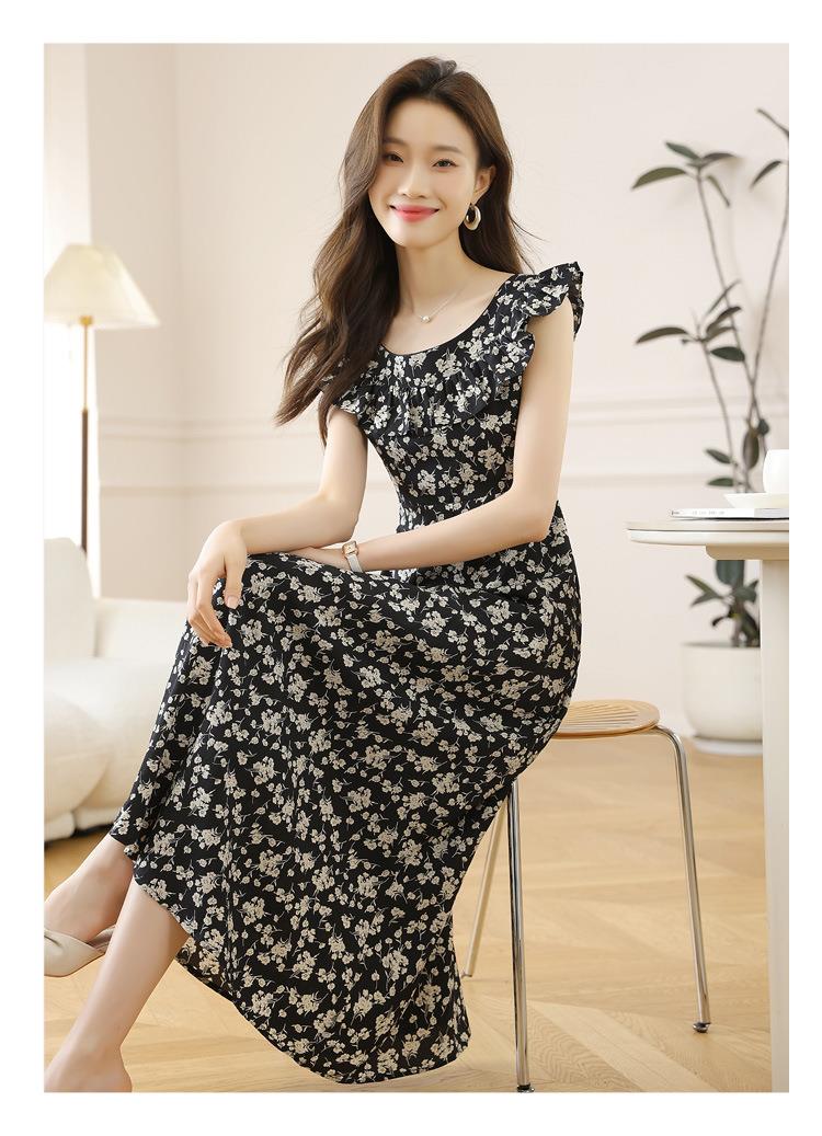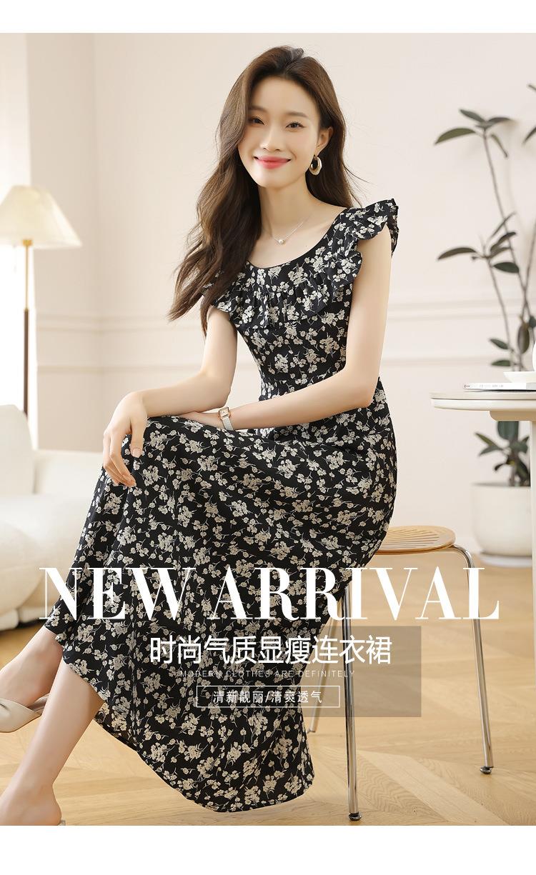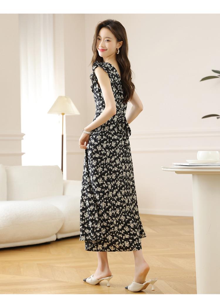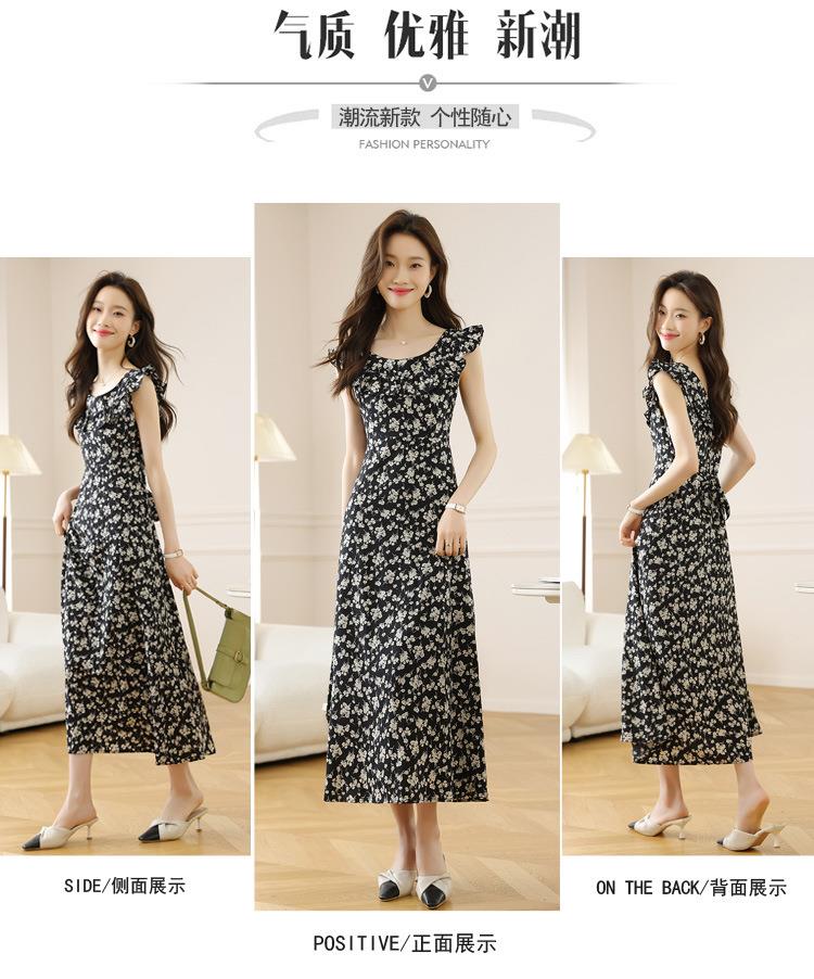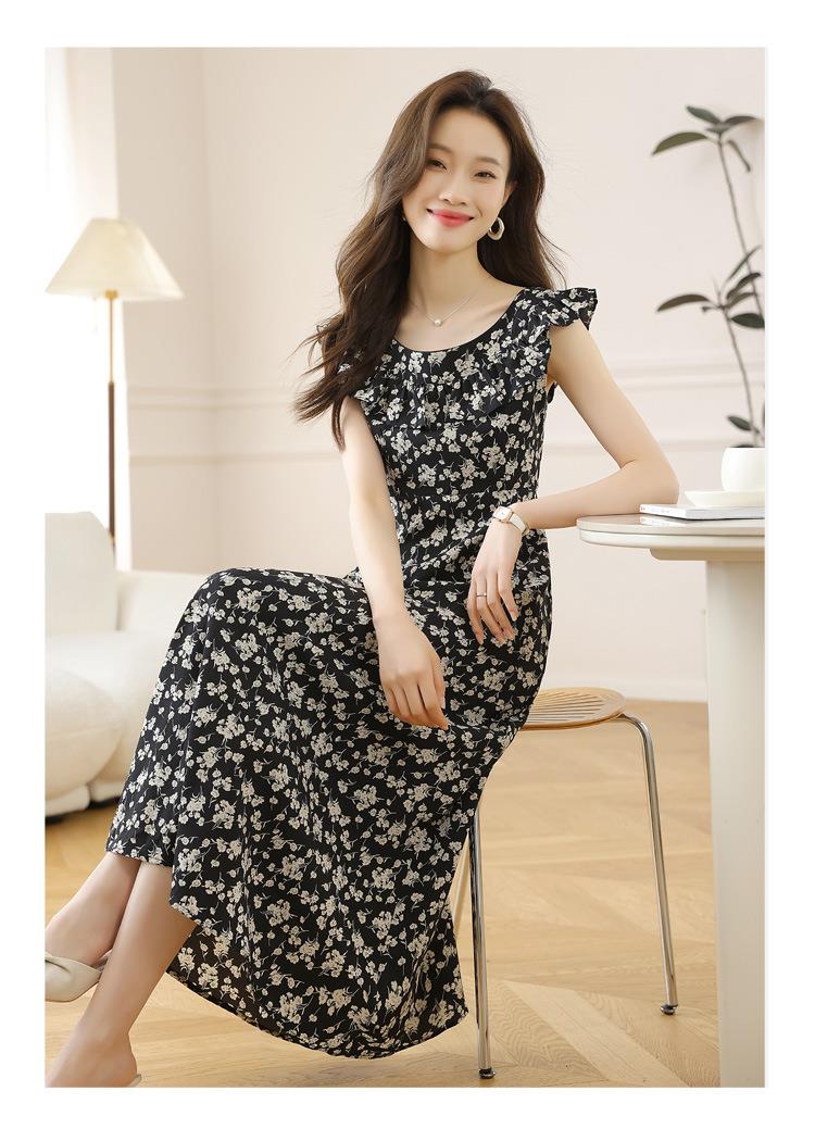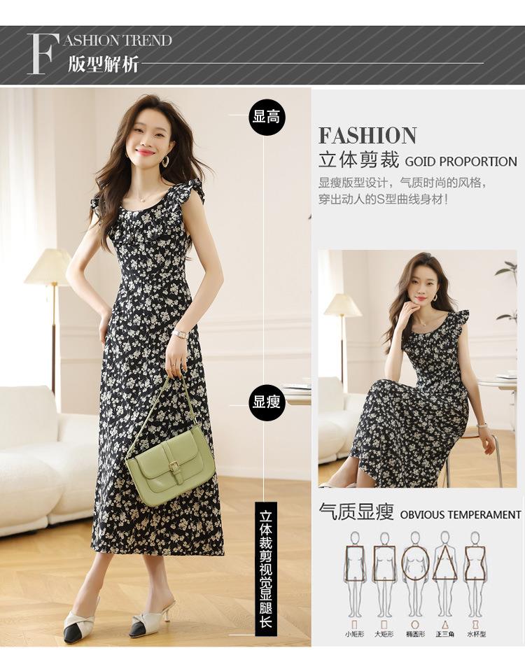法式黑色碎花吊带小飞袖连衣裙子女夏季2024新款海边度假气质长裙