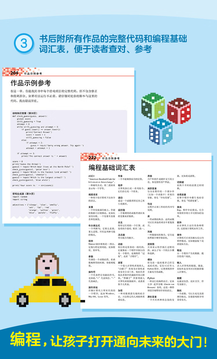 想让孩子进阶学习编程,功能强大的Python是****。但从图形化编程到纯代码语言,孩子多少都会产生一点畏难情绪。这本书延续了DK一贯的风格,总能把严肃,专业的内容变得“哇,原来这么有意思!”。书里从零开始,几行代码完成一个小任务小游戏,孩子一看就跃跃欲试。分解代码,循序渐进,让孩子成就感满满,还能举一反三。它和同系列《编程真好玩:6岁开始学Scratch》无缝衔接,为孩子打开了更广阔的编程世界。