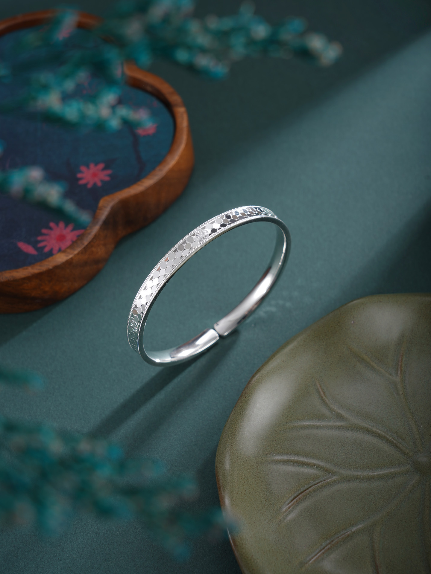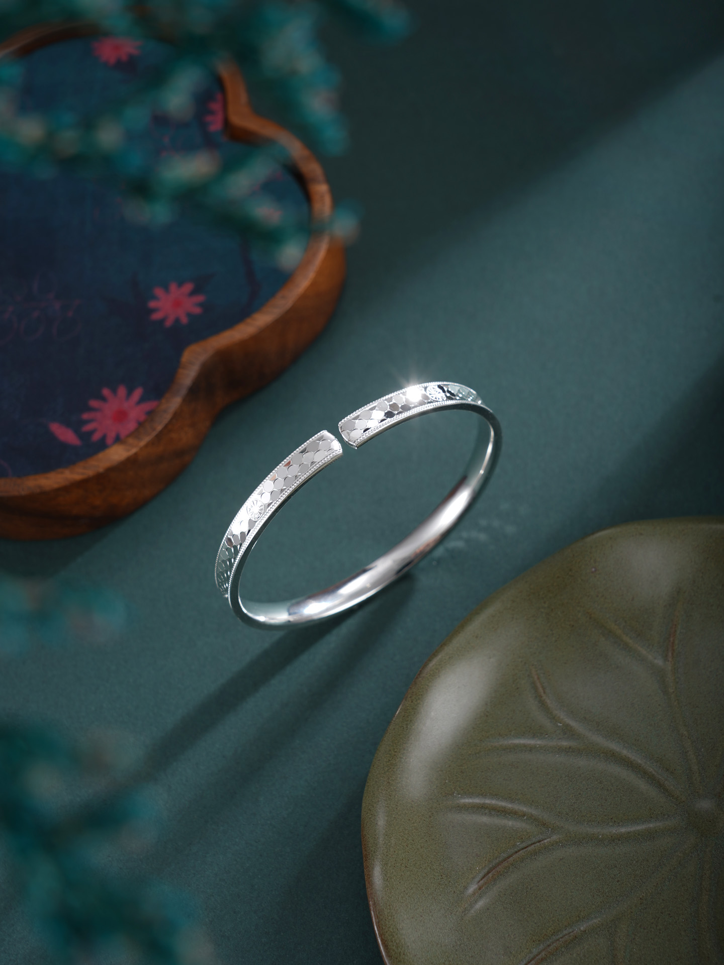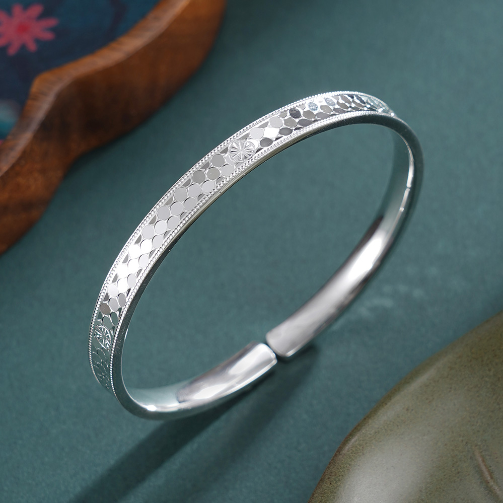 【寓意】:纯银手镯表面点缀星芒纹饰,似银河落雪。寓意如冰雪般纯净坚韧,以星芒之姿照亮前路。