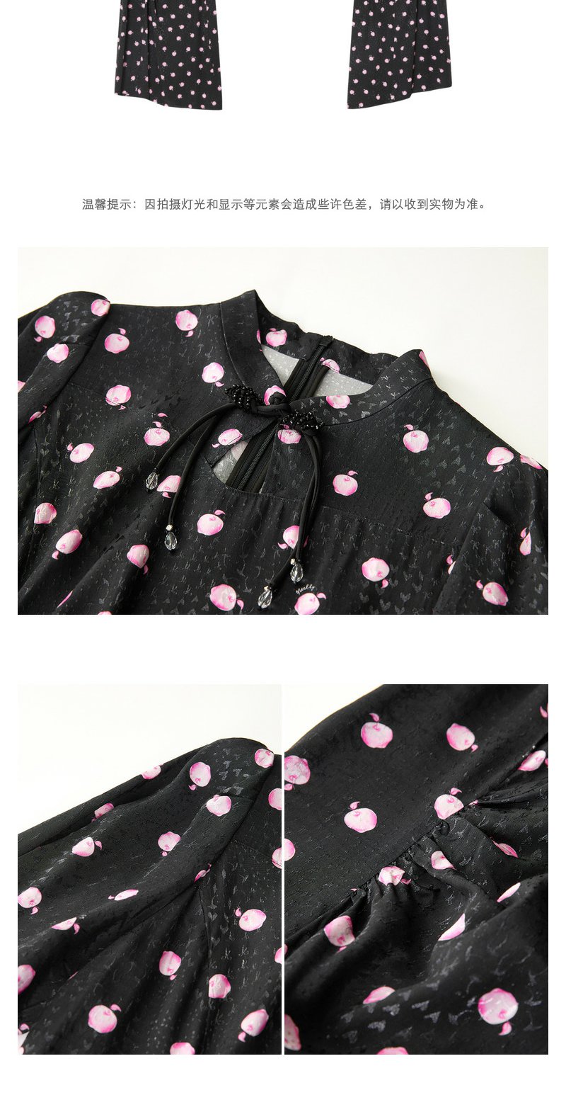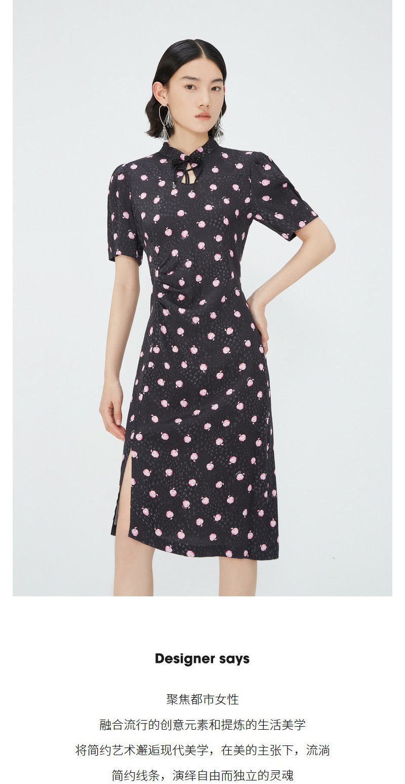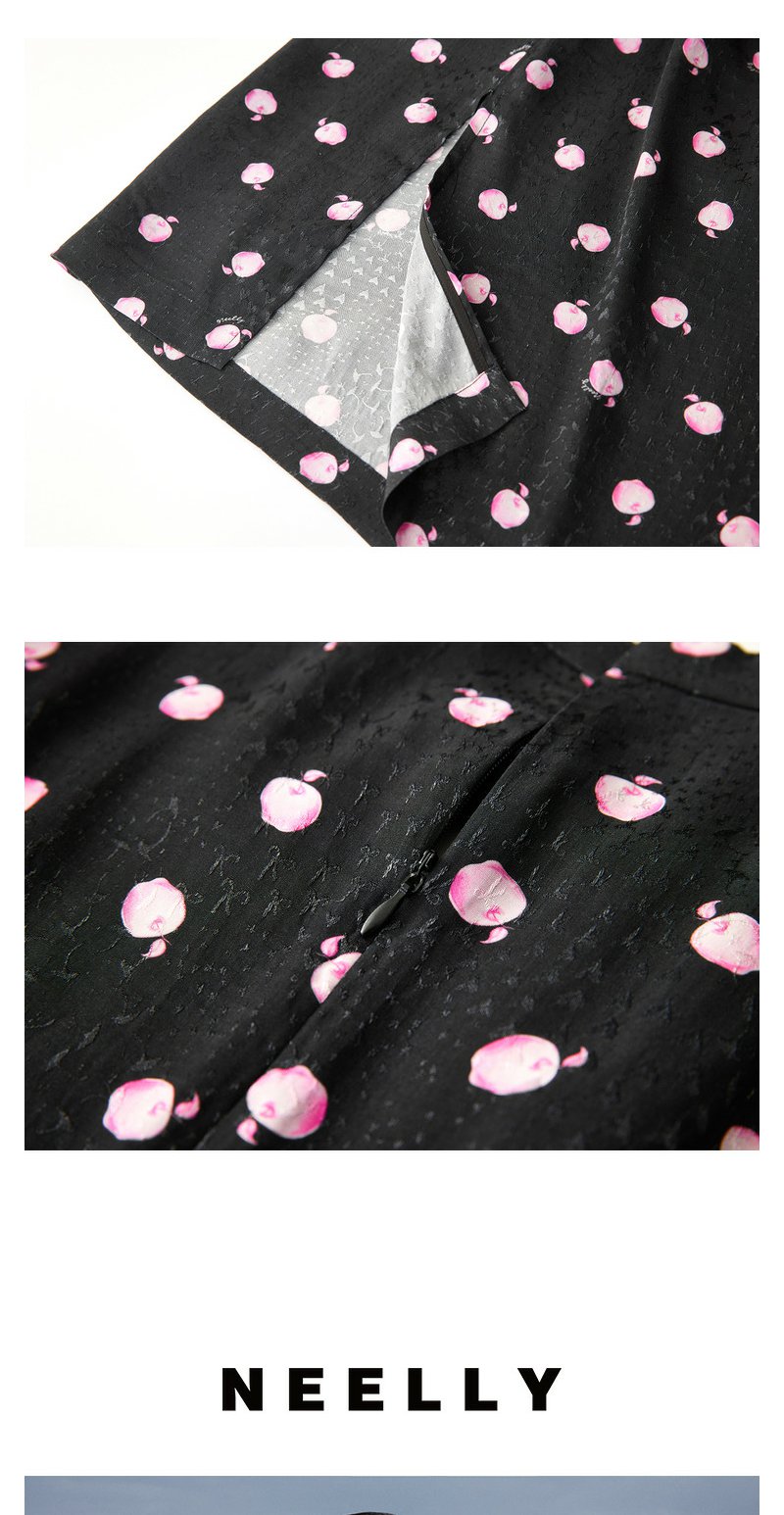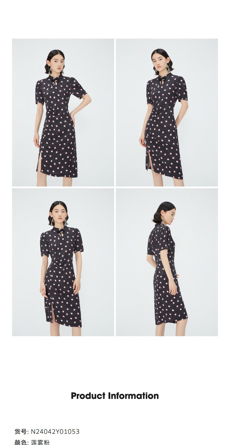 NEELLY纳俪商场同款立领盘扣短袖连衣裙女印花收腰褶皱开叉中长裙 N24042Y01053