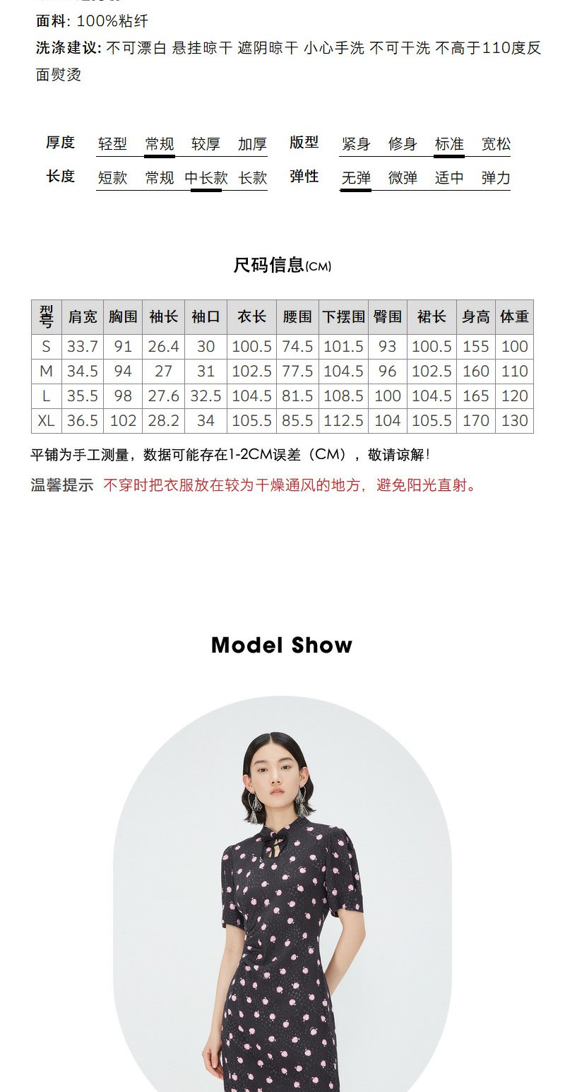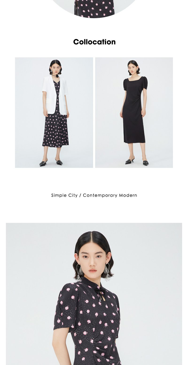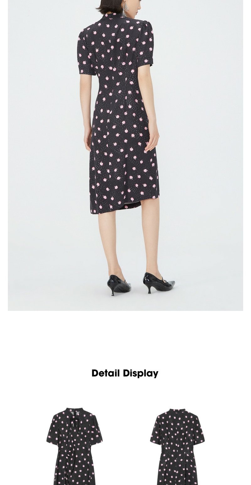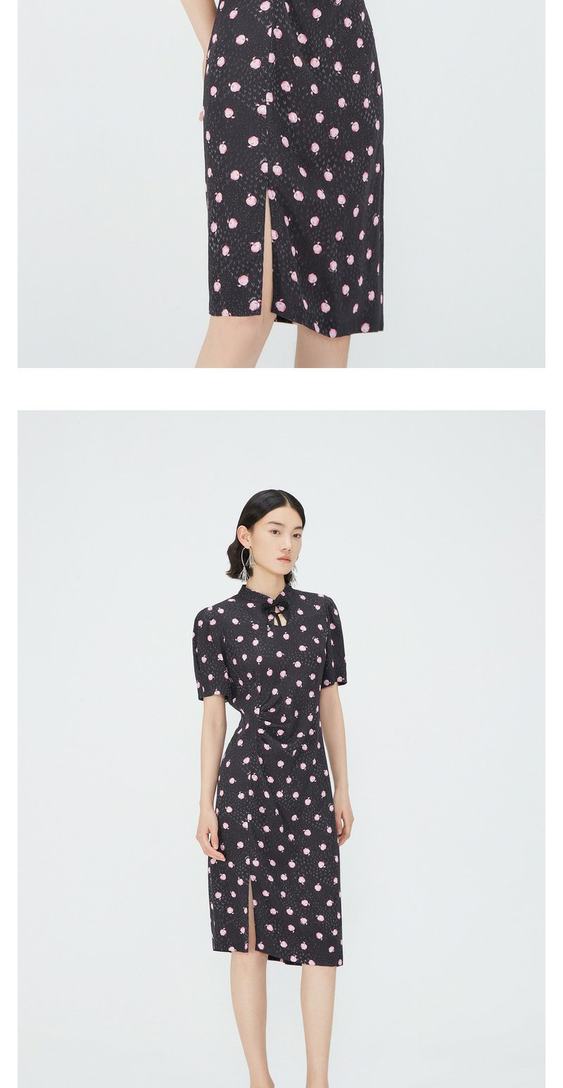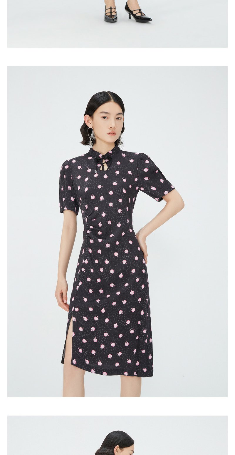 NEELLY纳俪商场同款立领盘扣短袖连衣裙女印花收腰褶皱开叉中长裙 N24042Y01053