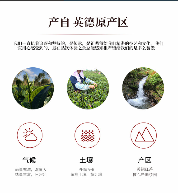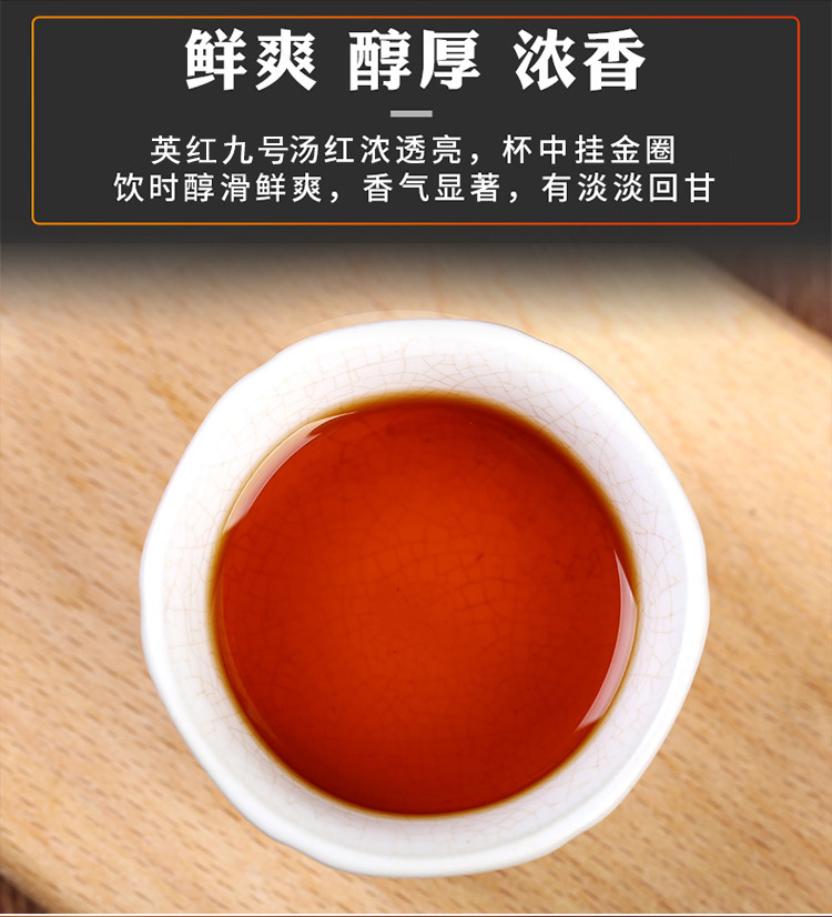 英德红茶早在上世纪60年代便已蜚声国内外,就连英国女王也用其招待贵宾。而英红九号属于英德红茶中的极品,为广东省农业科学院茶叶研究所在引进的多个高香型茶树品种中筛选培育出的高香型红茶品种,用其鲜叶加工的红茶品质上乘,滋味醇滑甜爽、鲜香持久,被茶界认为是中国乃至世界最好的红茶品种。一片匠心,只为一杯好茶。