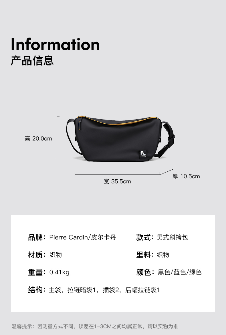 皮尔卡丹单肩饺子包斜挎包男背包男士挎包男生运动男包通勤便携单肩包