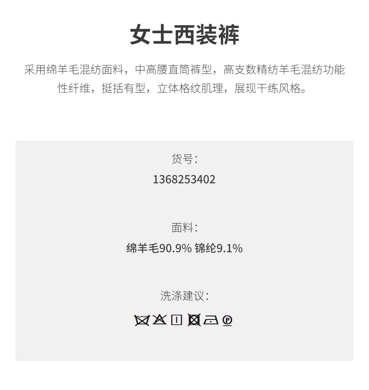 PURE TOUCH女装 25秋冬新款羊毛混纺西装裤OL通勤中高腰直筒长裤