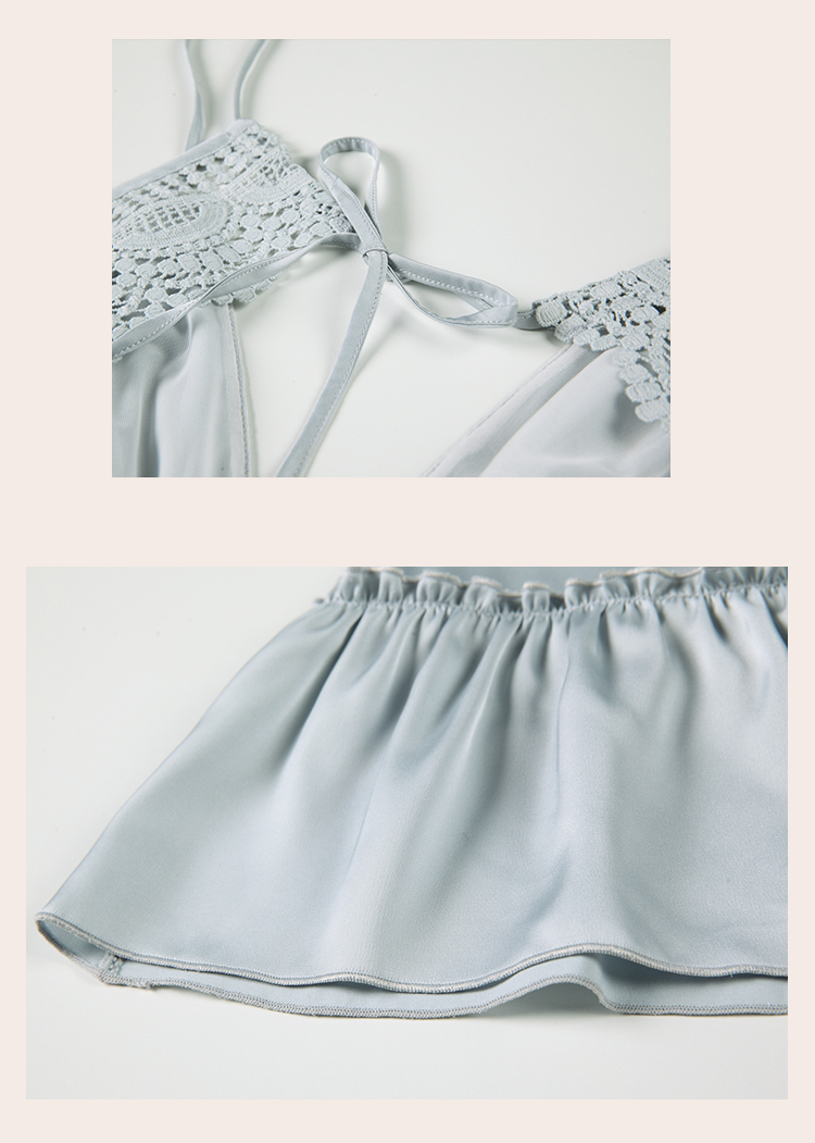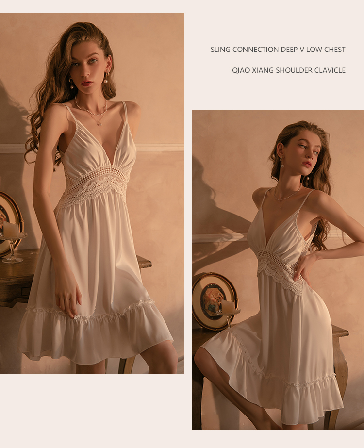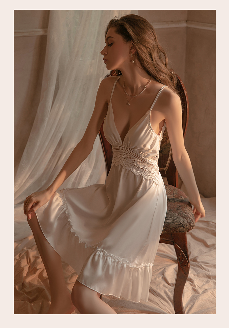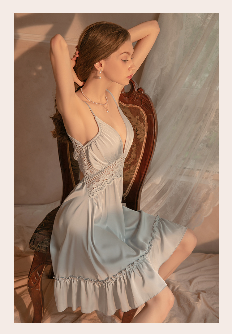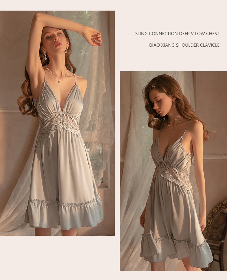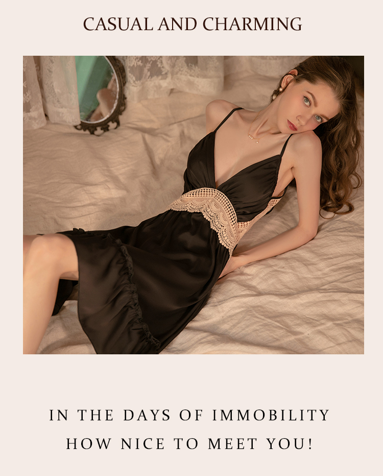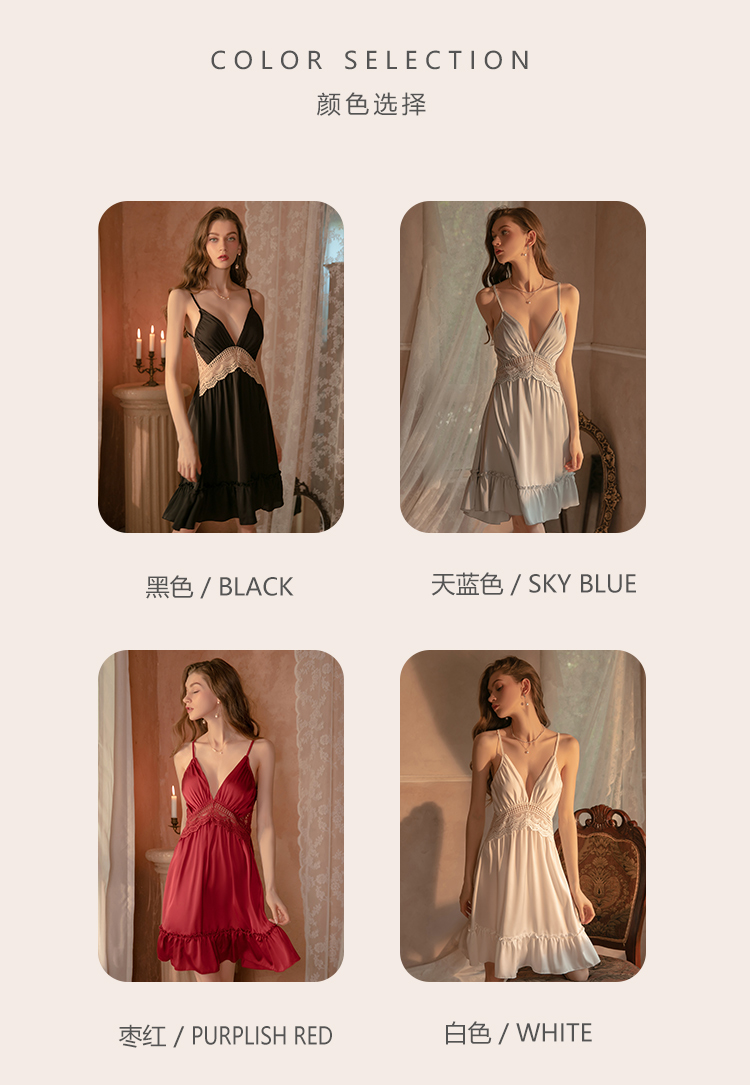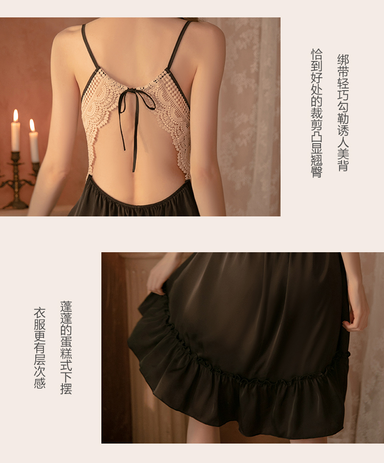 【美到骨子里的睡裙!】新款法式长款吊带睡裙女 缎面冰丝 透视性感深V 蕾丝拼接 诱人露背睡衣家居服套装
