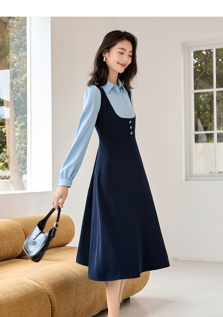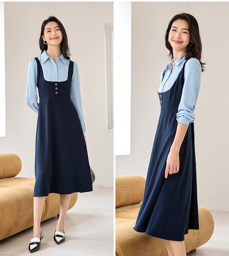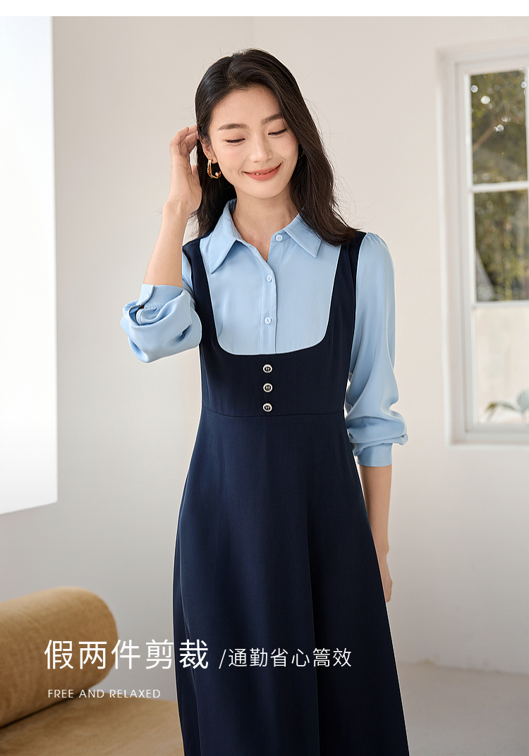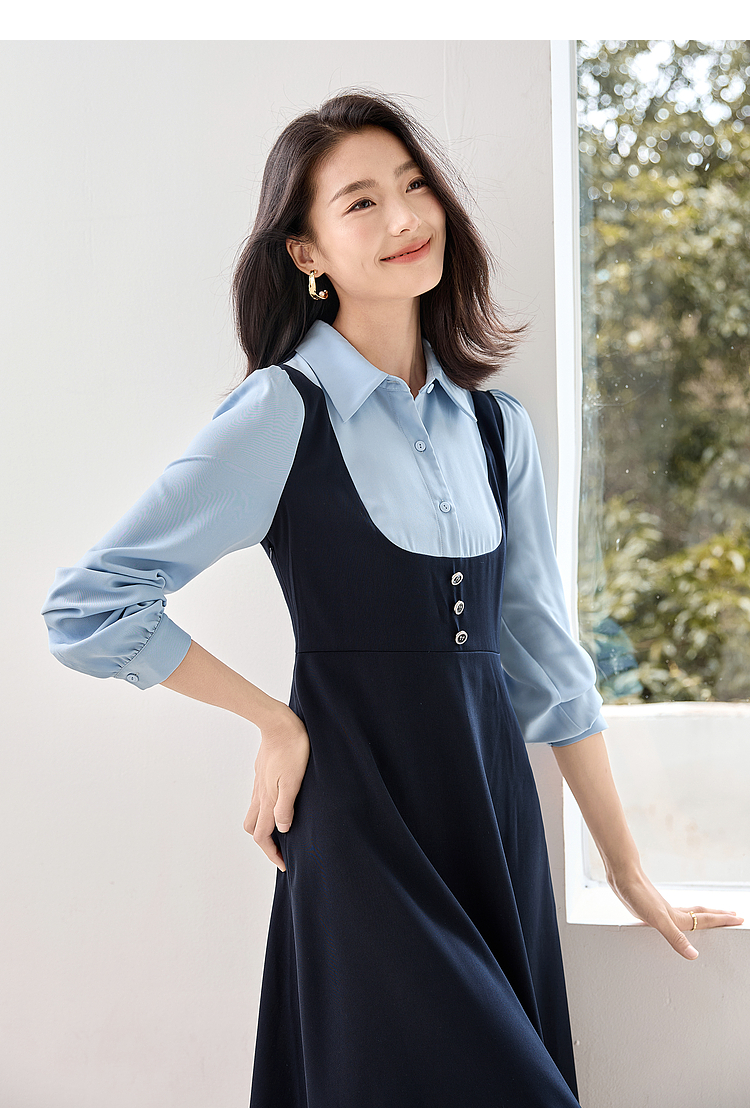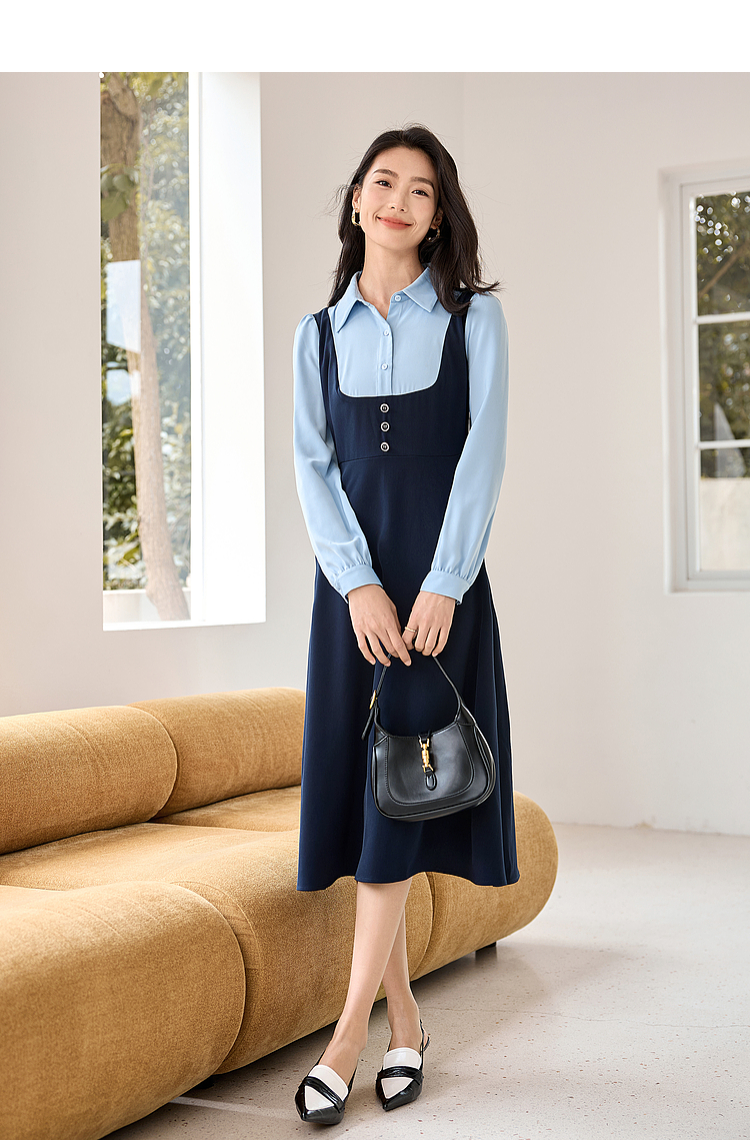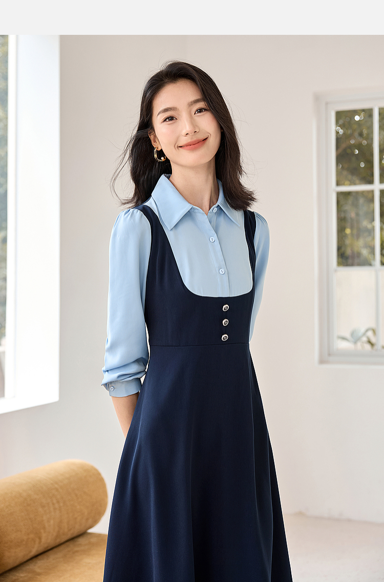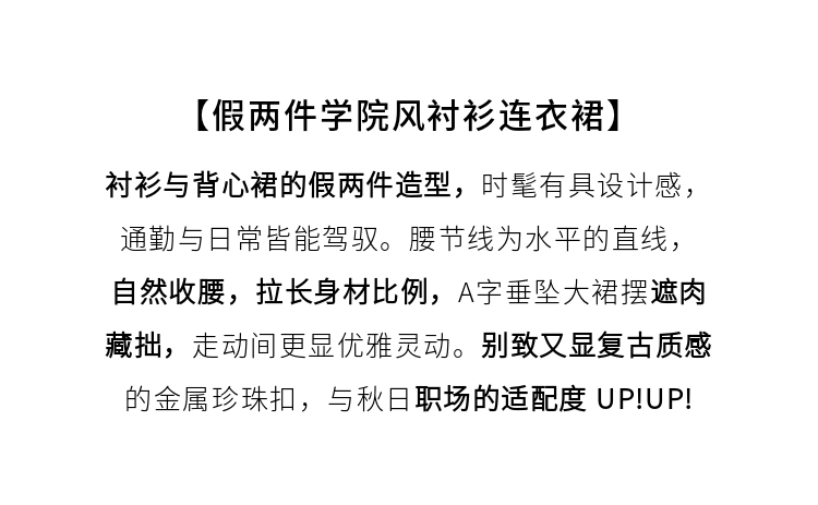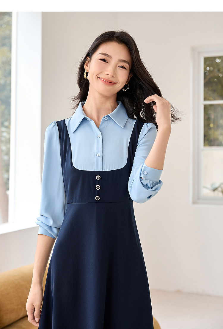 【1件72折】熙世界学院风假两件衬衫连衣裙2025秋装新款通勤气质收腰中长裙