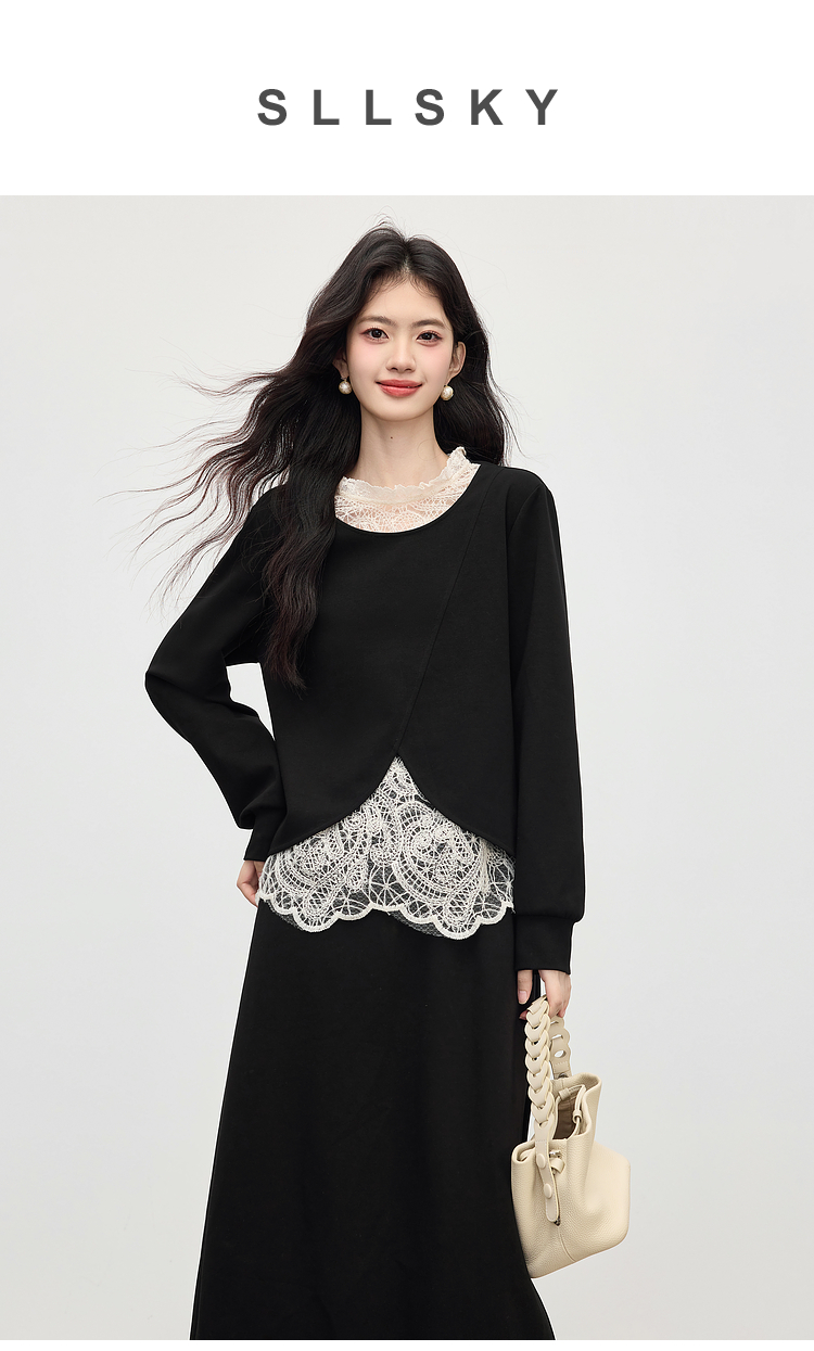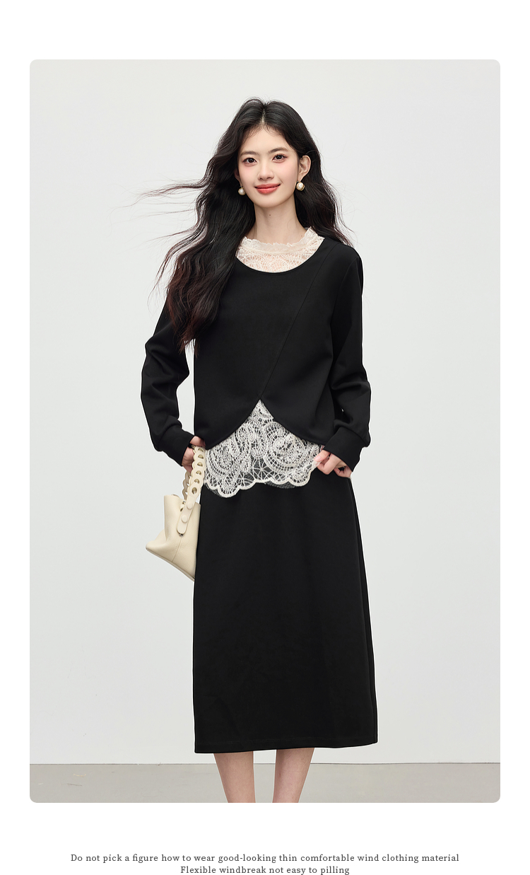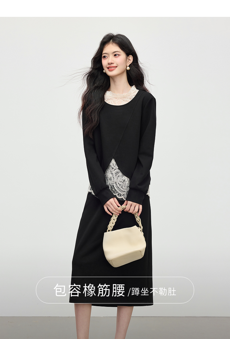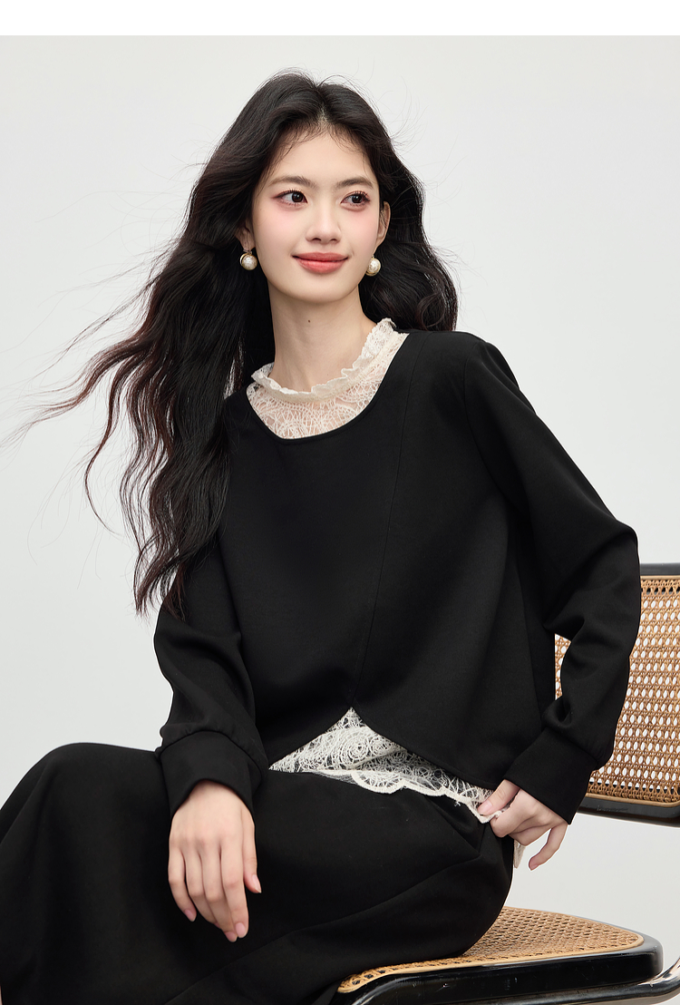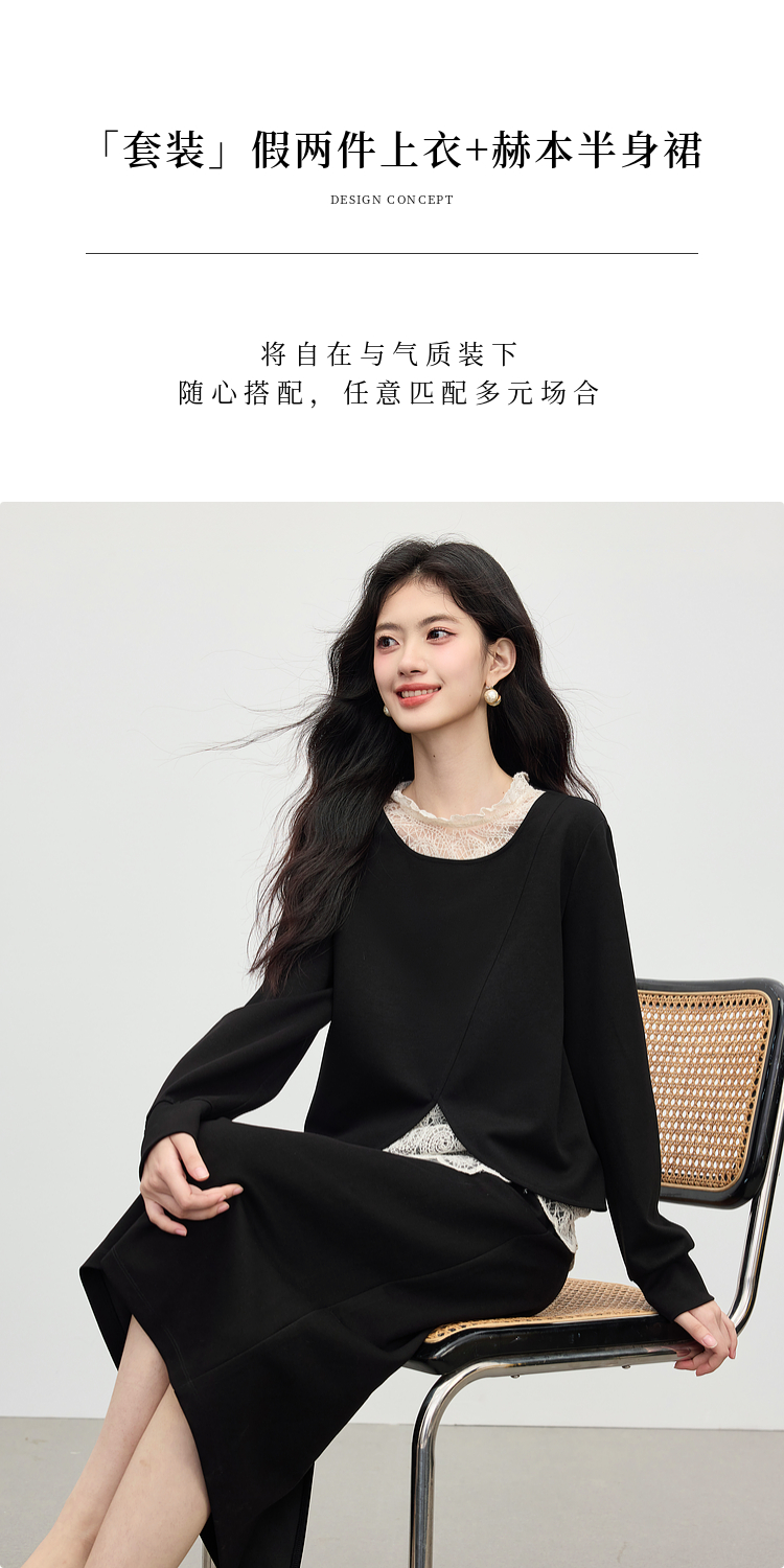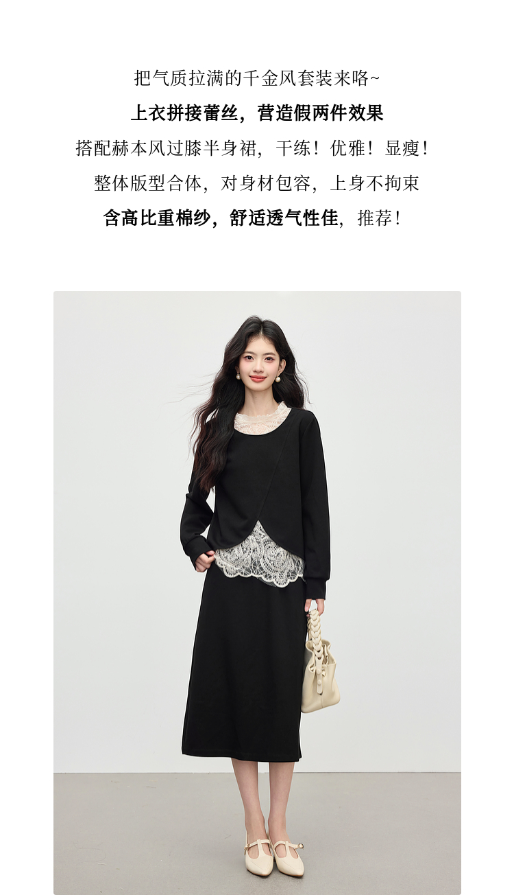 【08/27新品】熙世界千金赫本风套装女秋季新款蕾丝拼接假两件上衣半身裙两件套