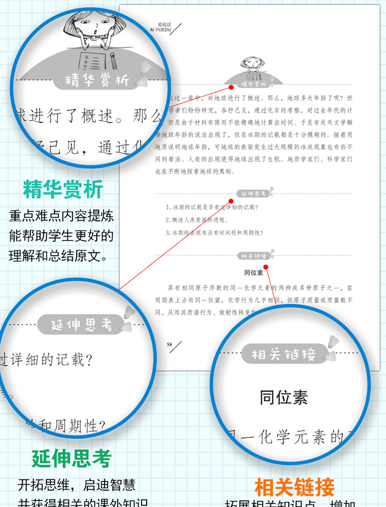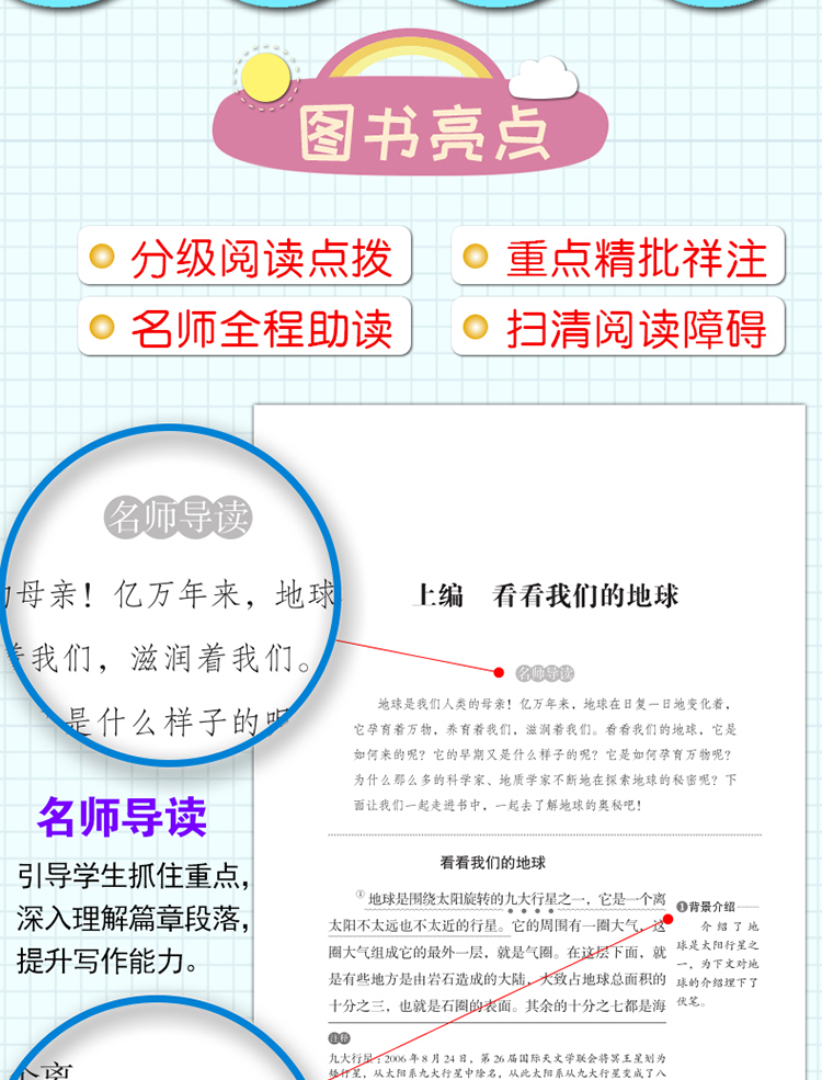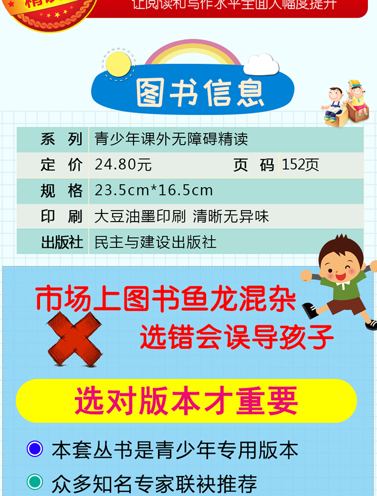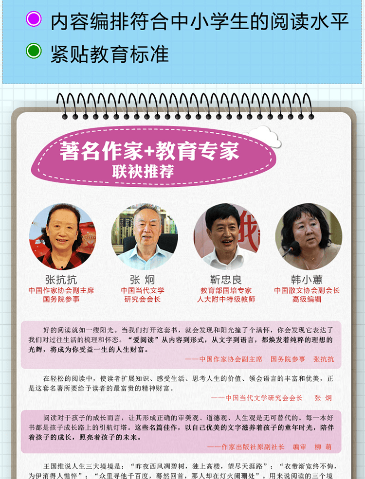 二、没有严肃的说教,还原经典的本来面目拒绝说教是我们选材的首要目标。这不是枯燥的几何题,为什么要说教?这不是语文课文要总结中心思想,为什么要加上枯燥无趣的讲解?经典之所以成为经典是因为它写出了人性最真实的诉求,给人生动而鲜活的印象。比如小说作品,有的只是丰满的人物形象、引人入胜的故事情节以及充满想象力和幻想的文学世界;而古诗词有的是充满诗情画意的画面和文采斐然的句子;童话作品则贯穿着真善美的大爱主题和终身难忘的童话形象,让读者在轻松的阅读中扩展知识面,感受生活之美,思考人生的价值,领会文学的无穷魅力。