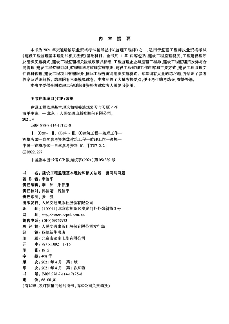 书名:2021年监理工程师考试辅导用书 建设工程监理基本理论和相关法规 复习与习题