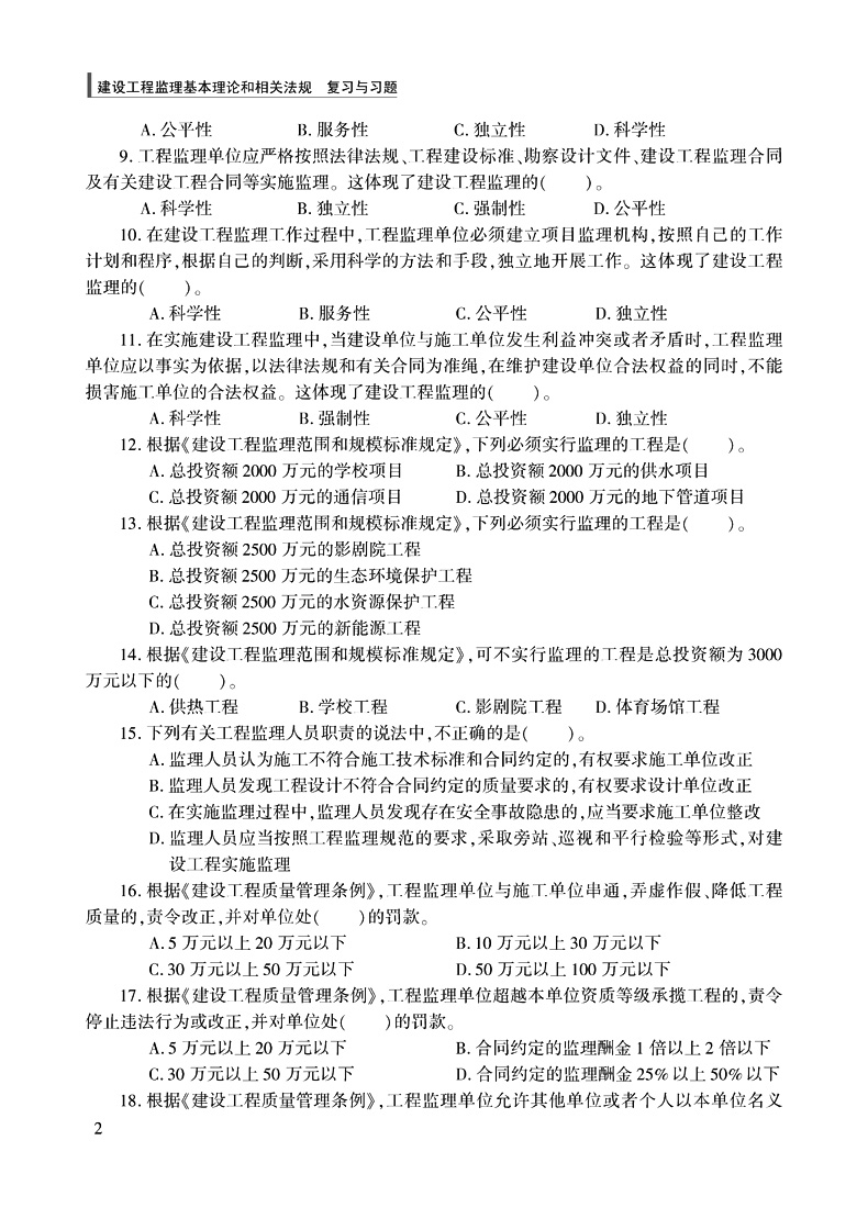 书为2021年职业资格考试辅导丛书(监理工程师)之一,适用于监理工程师职业资格考试《建设工程监理基本理论和相关法规》基础科目。内容包括建设工程监理制度、工程建设程序及组织实施模式、建设工程监理相关法规政策及标准、工程监理企业与监理工程师、建设工程监理招投标与合同管理、建设工程监理组织、监理规划与监理实施细则、建设工程监理工作内容和主要方式、建设工程监理文件资料管理、建设工程项目管理服务、国际工程咨询与组织实施模式的习题精练及其答案解析,以及3套工程目标控制模拟复习试卷及其答案解析。