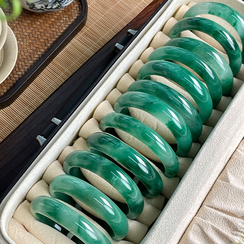 你看,这次我们带来的非洲翠种水上乘,飘花翠绿,哪怕和玻璃种飘花翡翠镯放一起,视觉美感一点都不逊色。