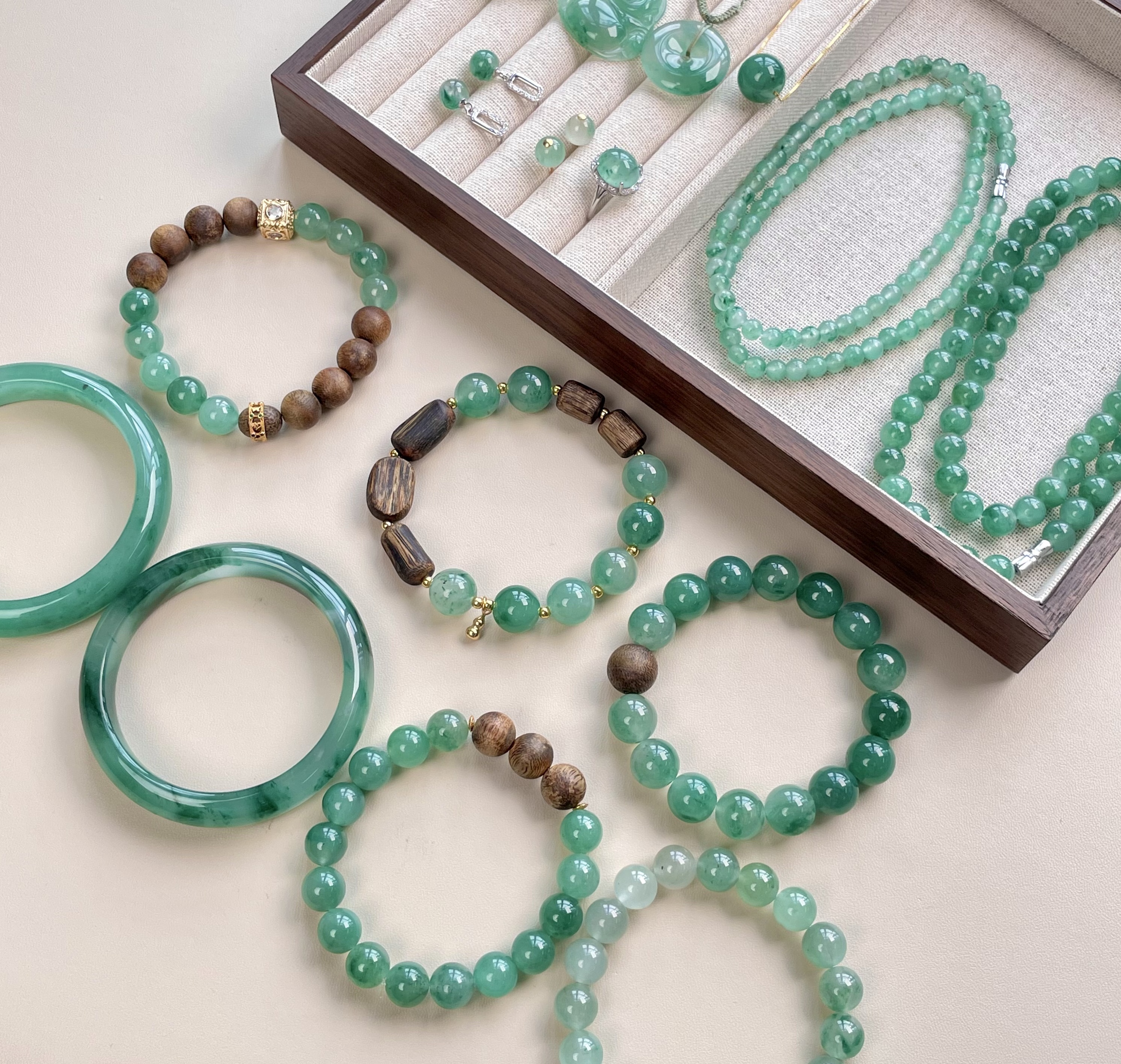 戴在手腕上的一抹翠,犹如春盛生发的凝翠,铸就腕间山水的贵气,静谧诗意,清风雅韵。