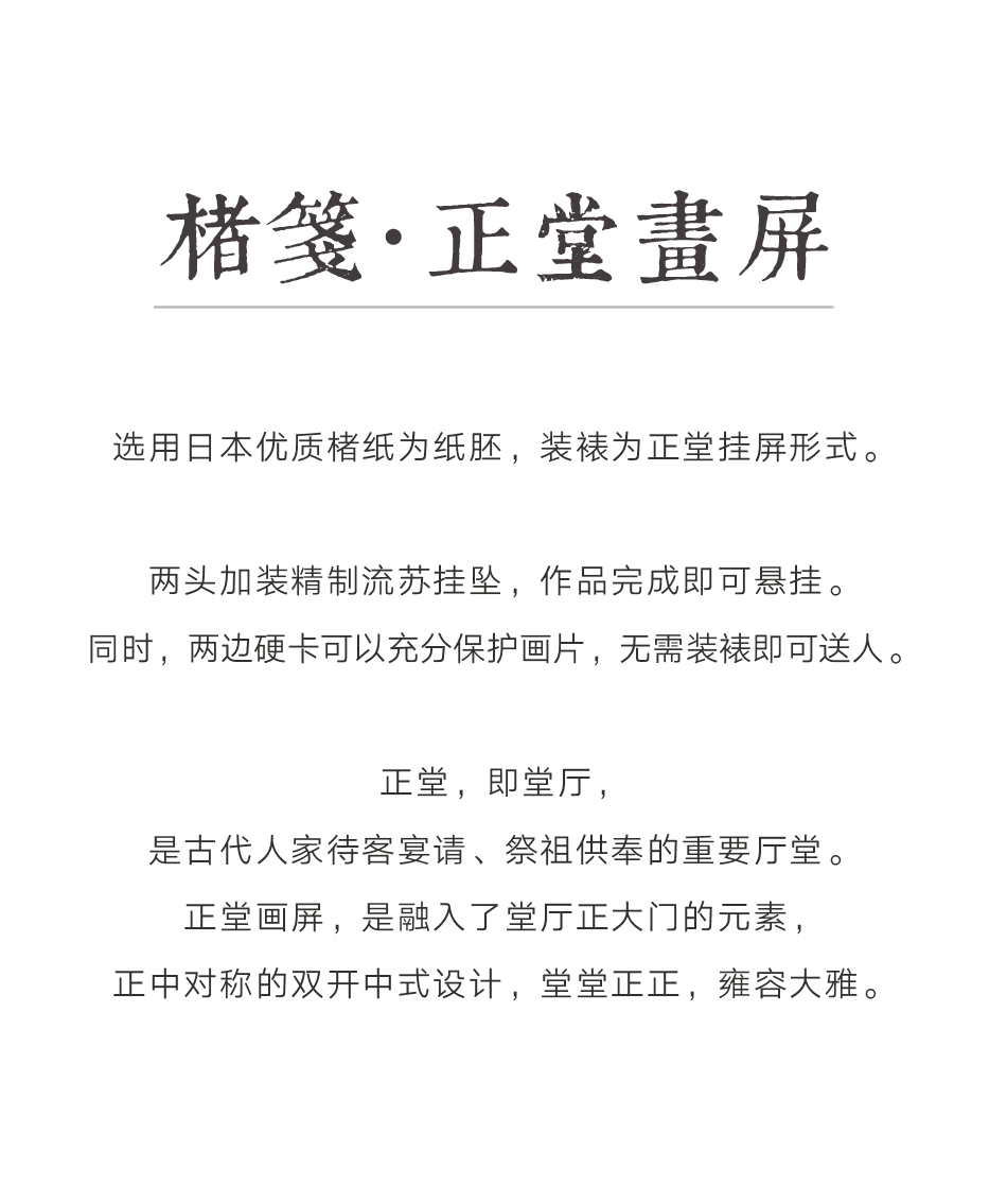 方便陈列,节省装裱损耗和费用,设计高档,自用馈赠皆宜。