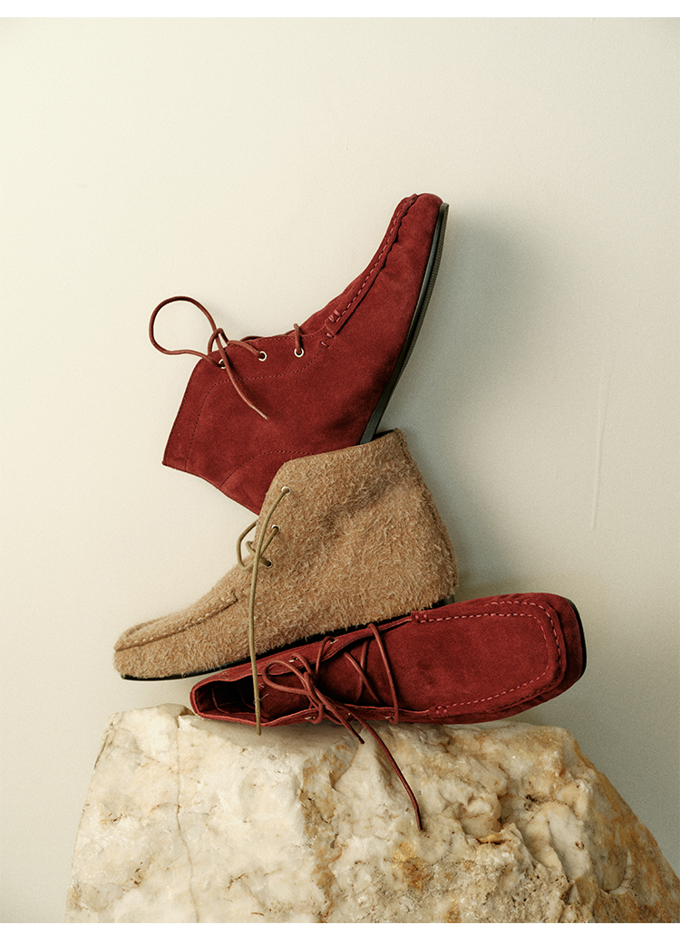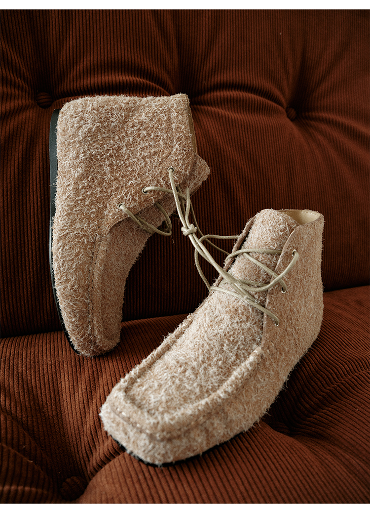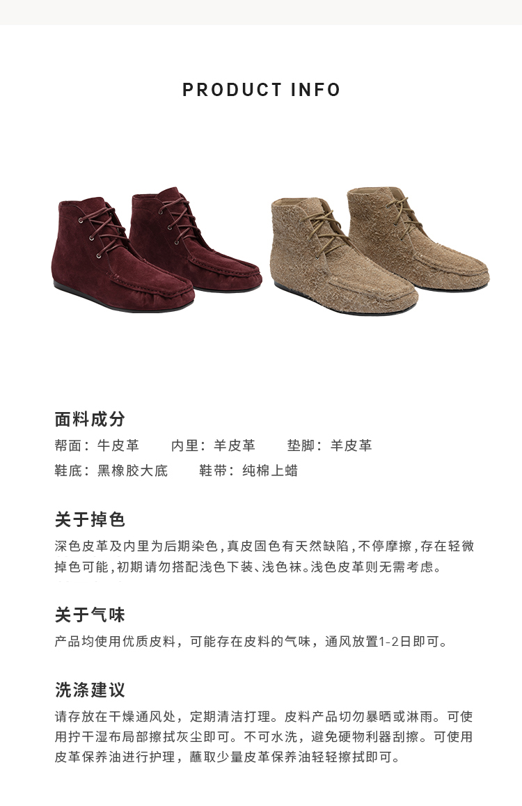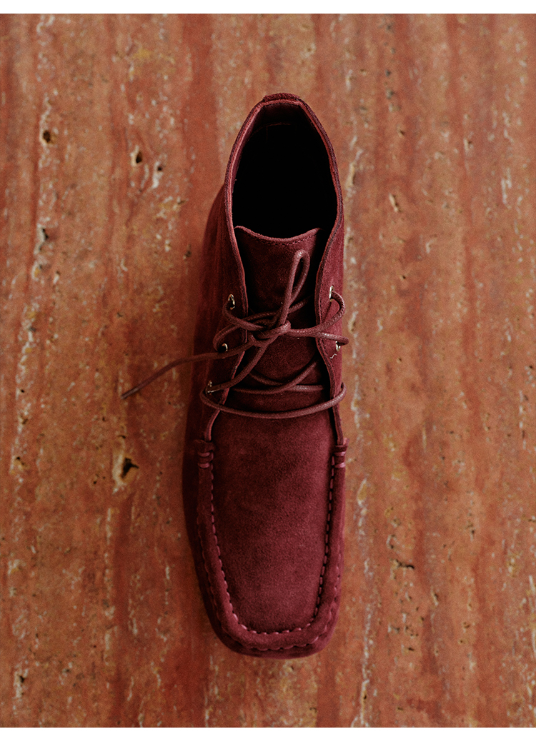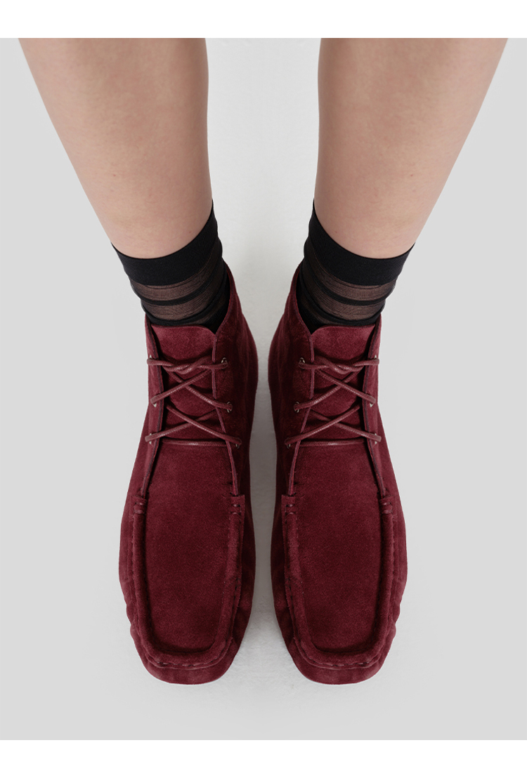 HIDEMI 系带复古做旧感进口磨毛牛反绒牛皮中帮方头内增高式踝靴短靴 卡其米/勃艮第酒红