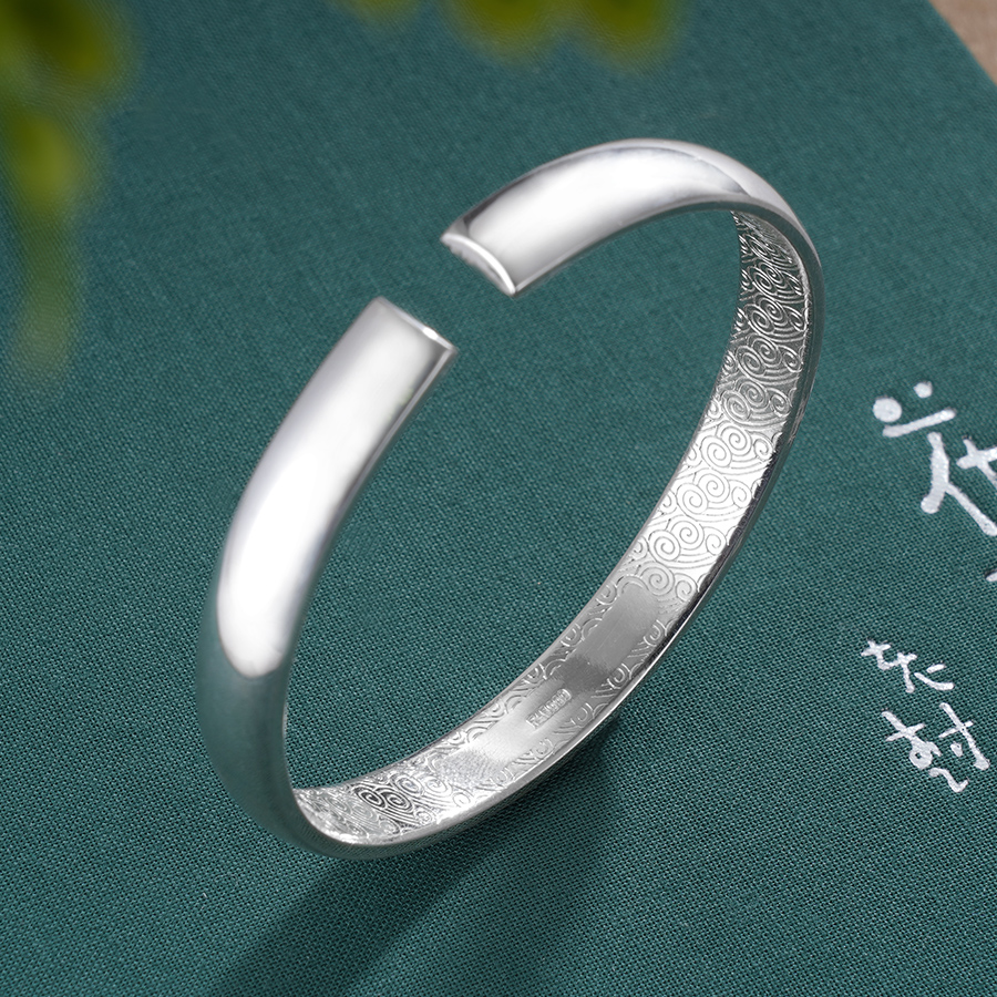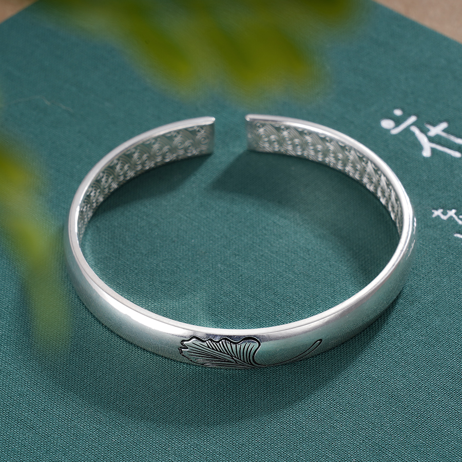 【寓意】:秋冬季节的专属款手镯,镯面錾刻一叶银杏,以仿古工艺渲染,其余部分精细抛光,明暗对比,清雅祥和。